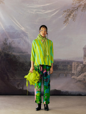 Quirky Jacket, a true statement piece with quilted flower detailing and intricate surface work adorned with embroidery beads. This jacket features a playful touch with stripes lining, adding a unique flair to your ensemble.