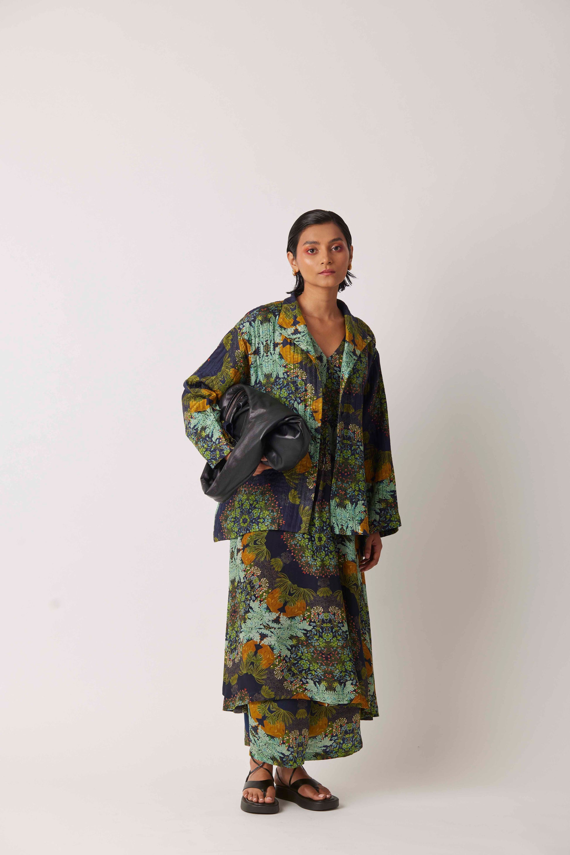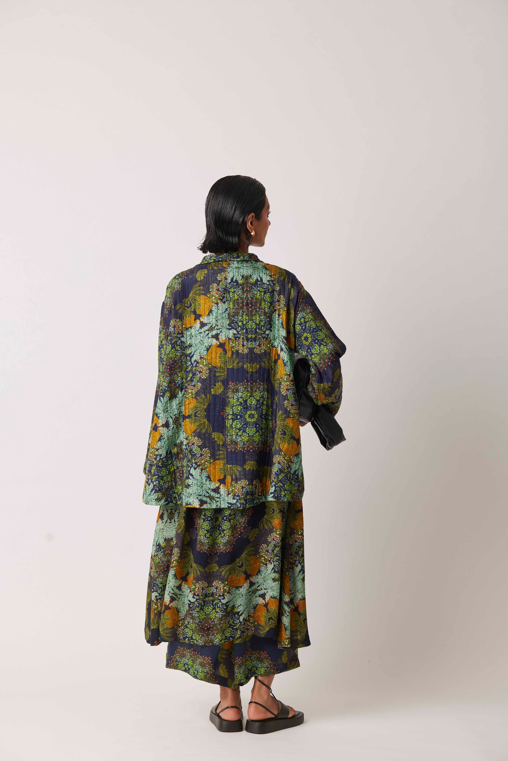 Chaos transforming into geometric patterns on a yavi quillted jacket with lapel collar.