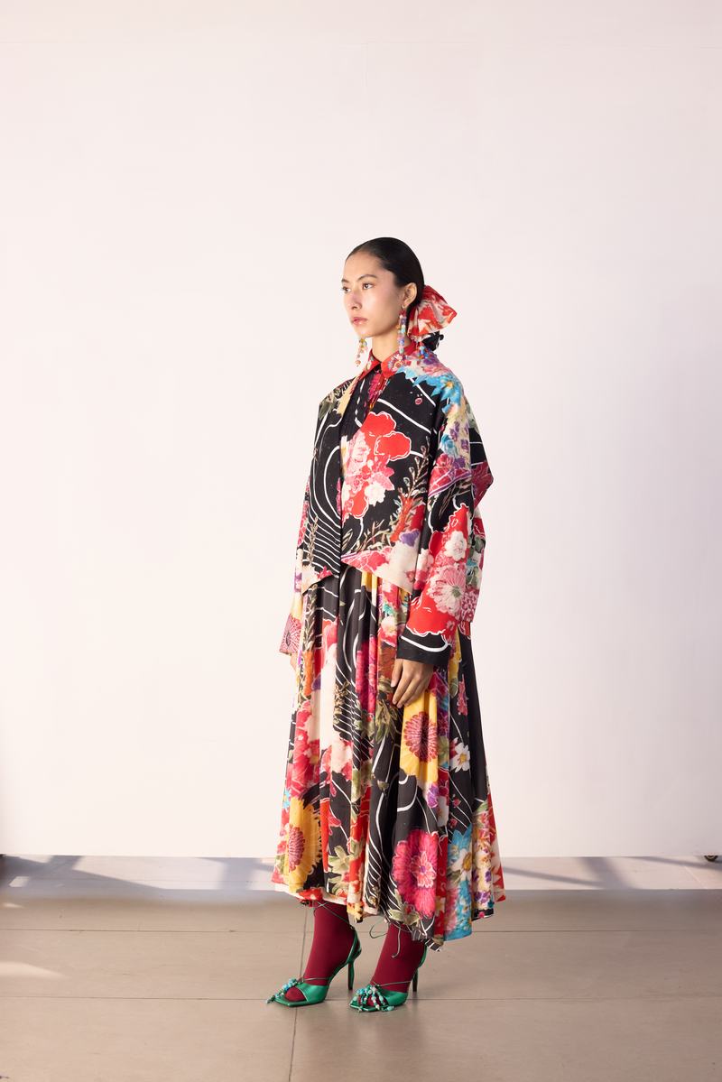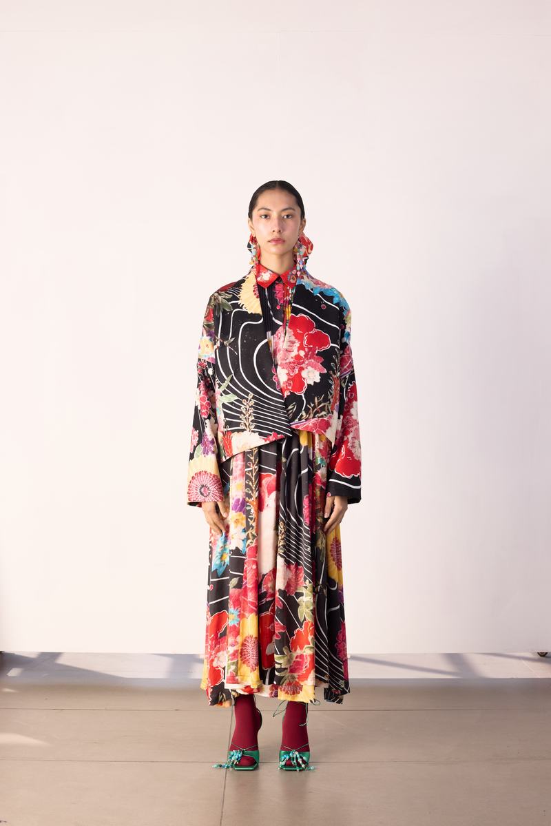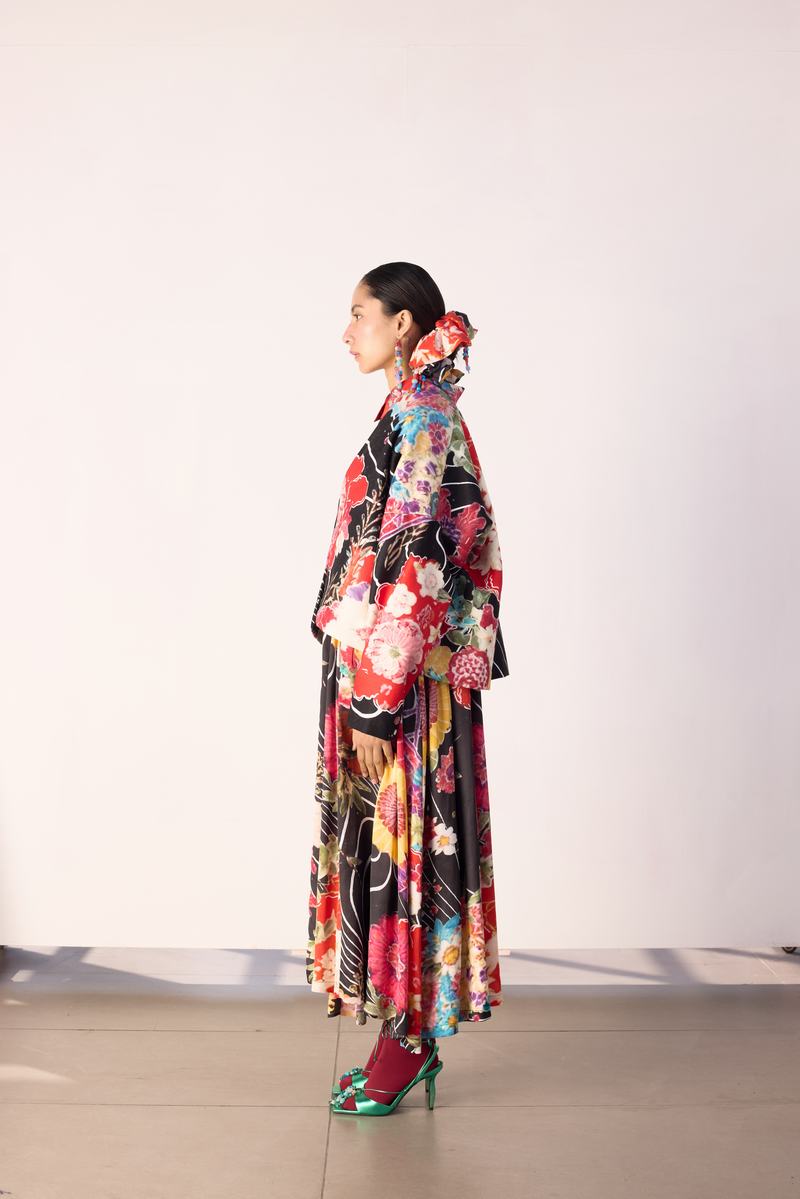 The silhouette is a relaxed, kimono jacket with dropped shoulder for an easy,oversized fit.