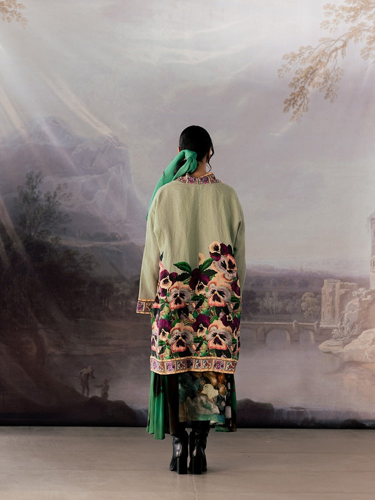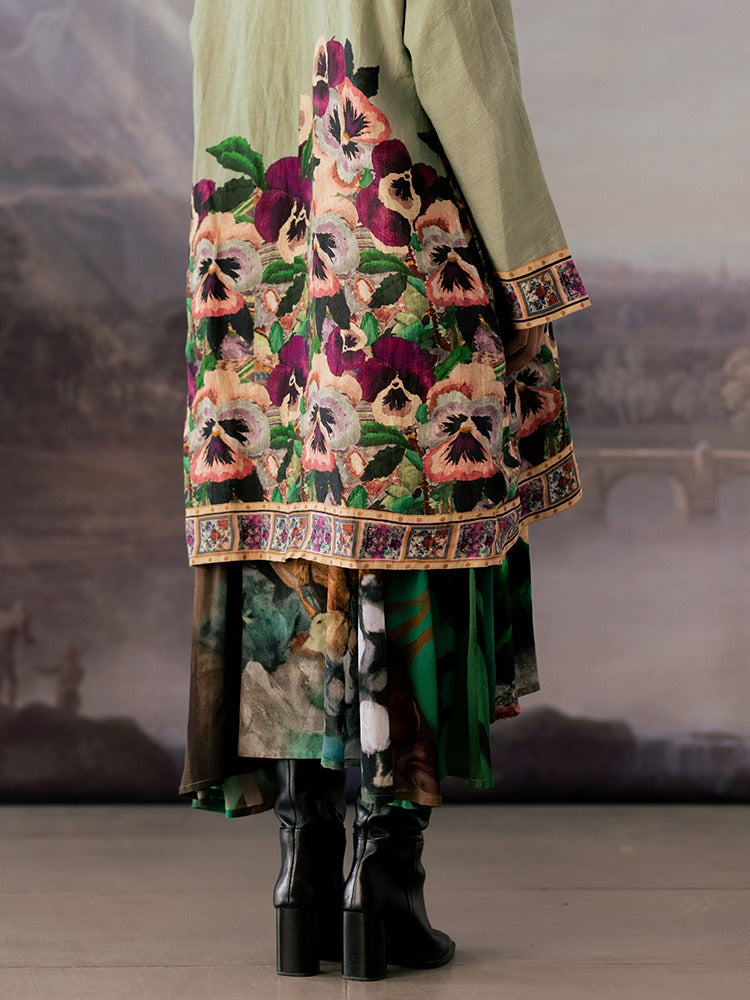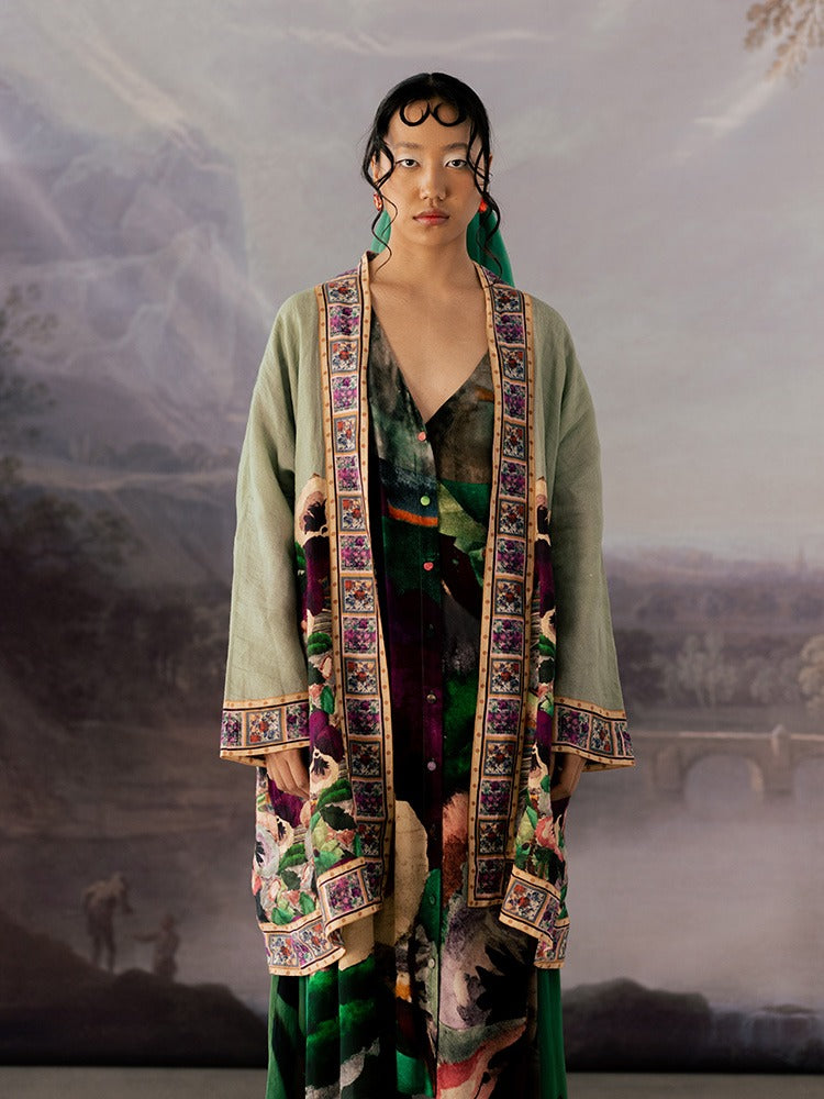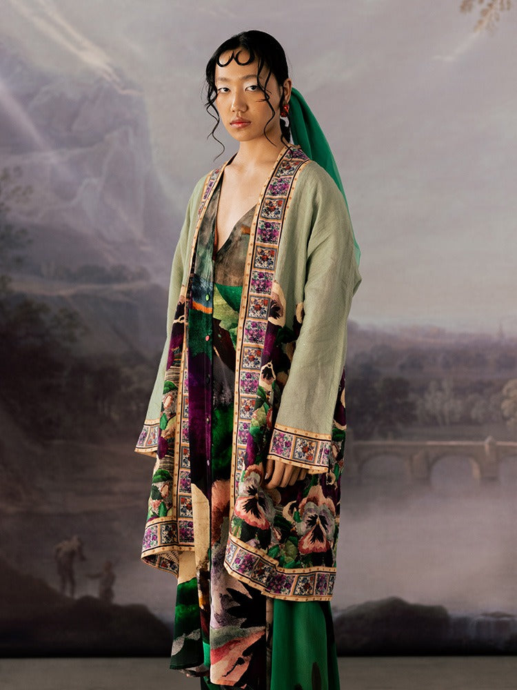 Our Engineered Linen Jacket, featuring an AI art print with borders and a printed lining. This stylish jacket is crafted in breathable linen, perfect for a chic yet comfortable look. With its front open design, it's versatile and easy to style.
