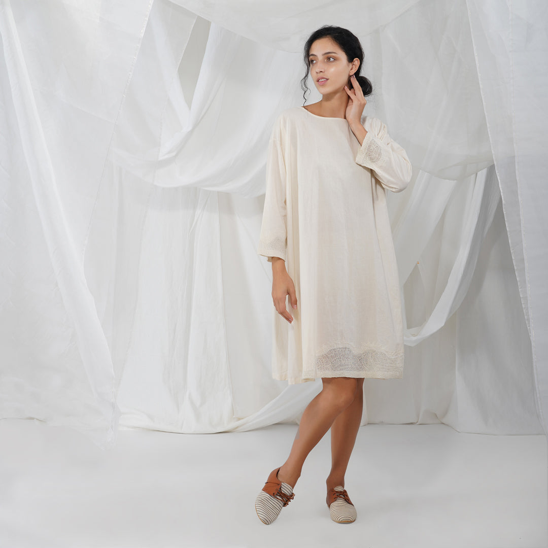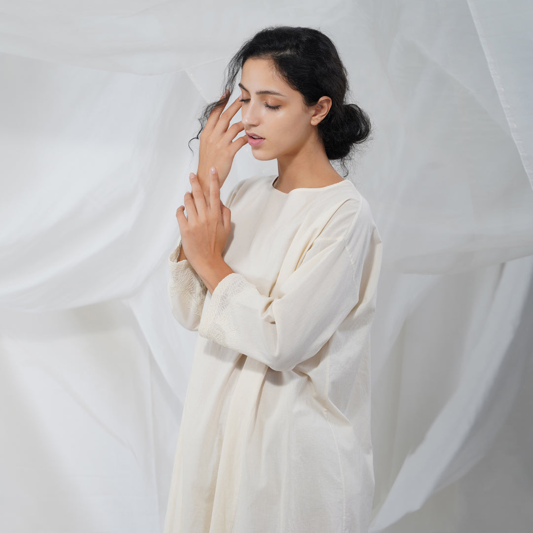 A short hand-embroidered cotton voil dress in Ivory, the pristine Akari dress is part of our new White-on-White collection that is reflective of the quiet beauty of the natural world, and each stitch is a labour of love.