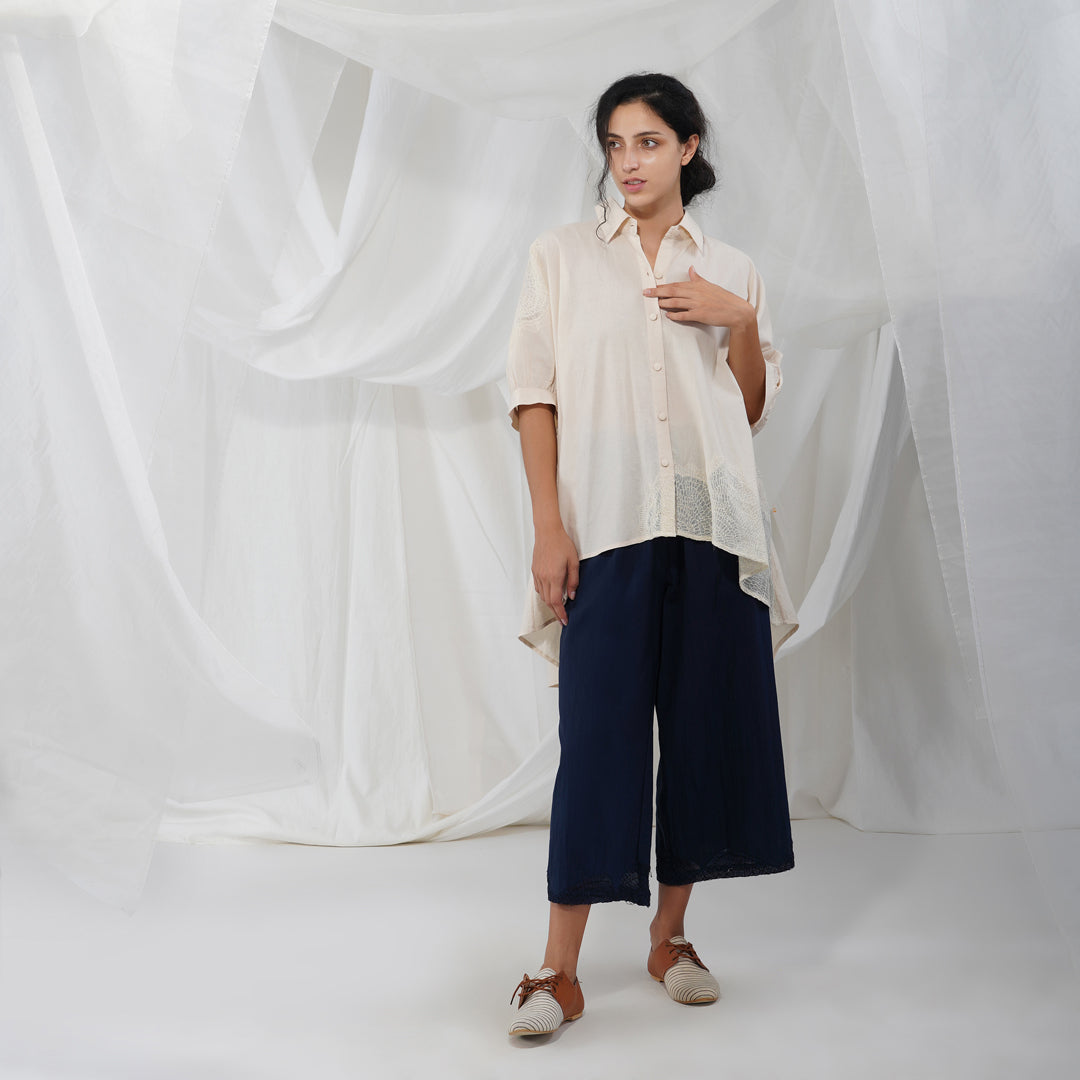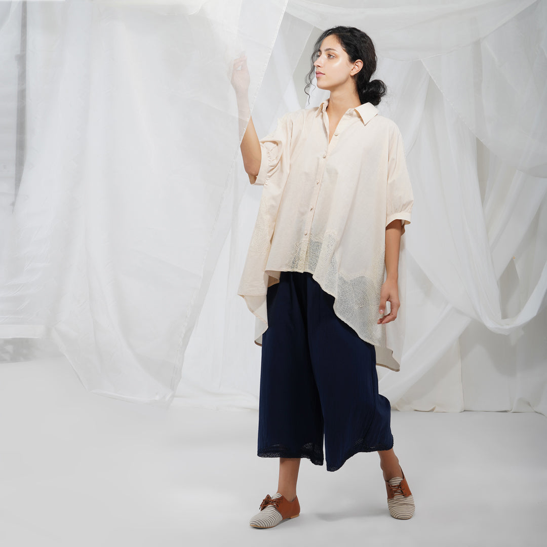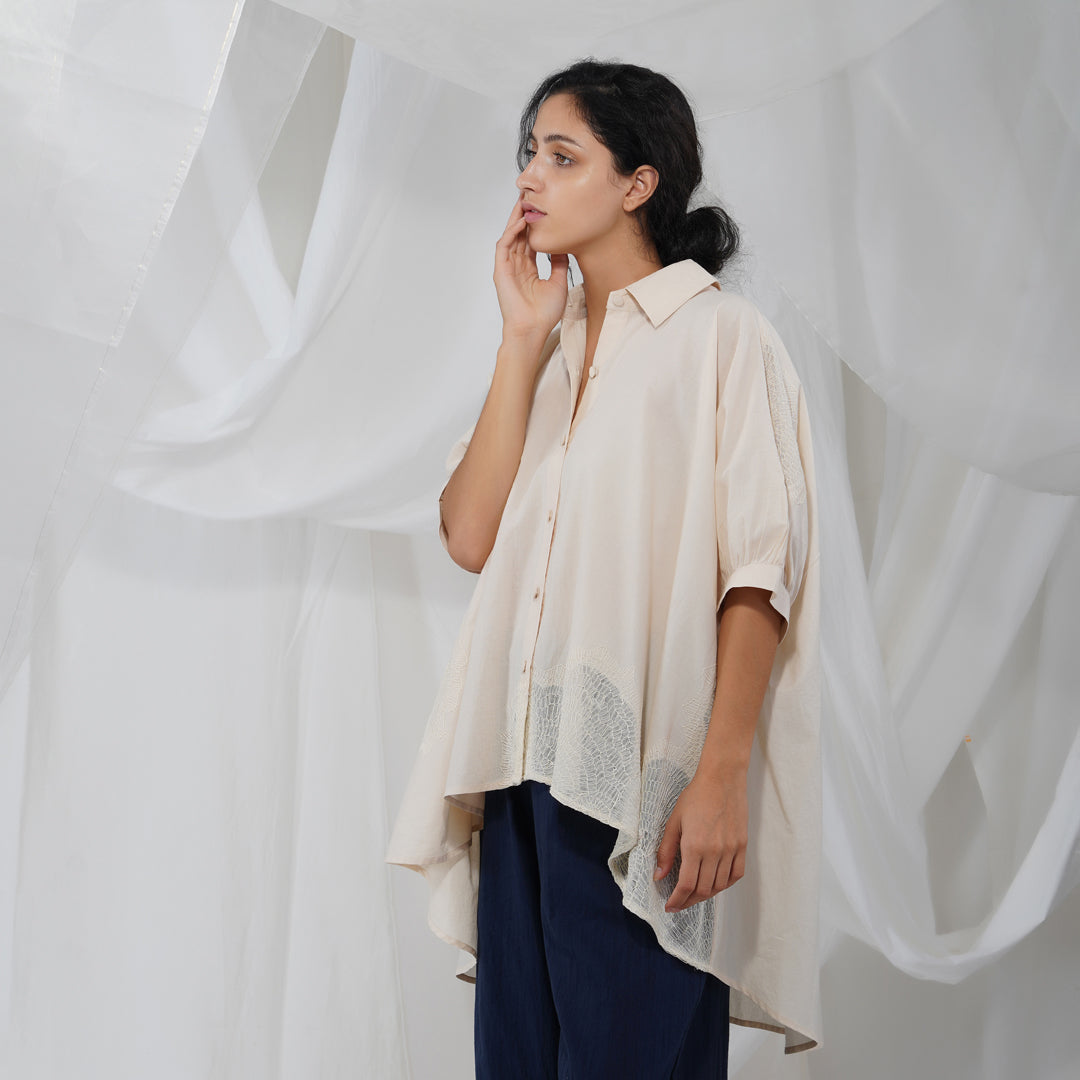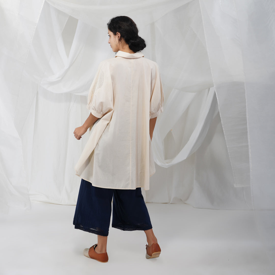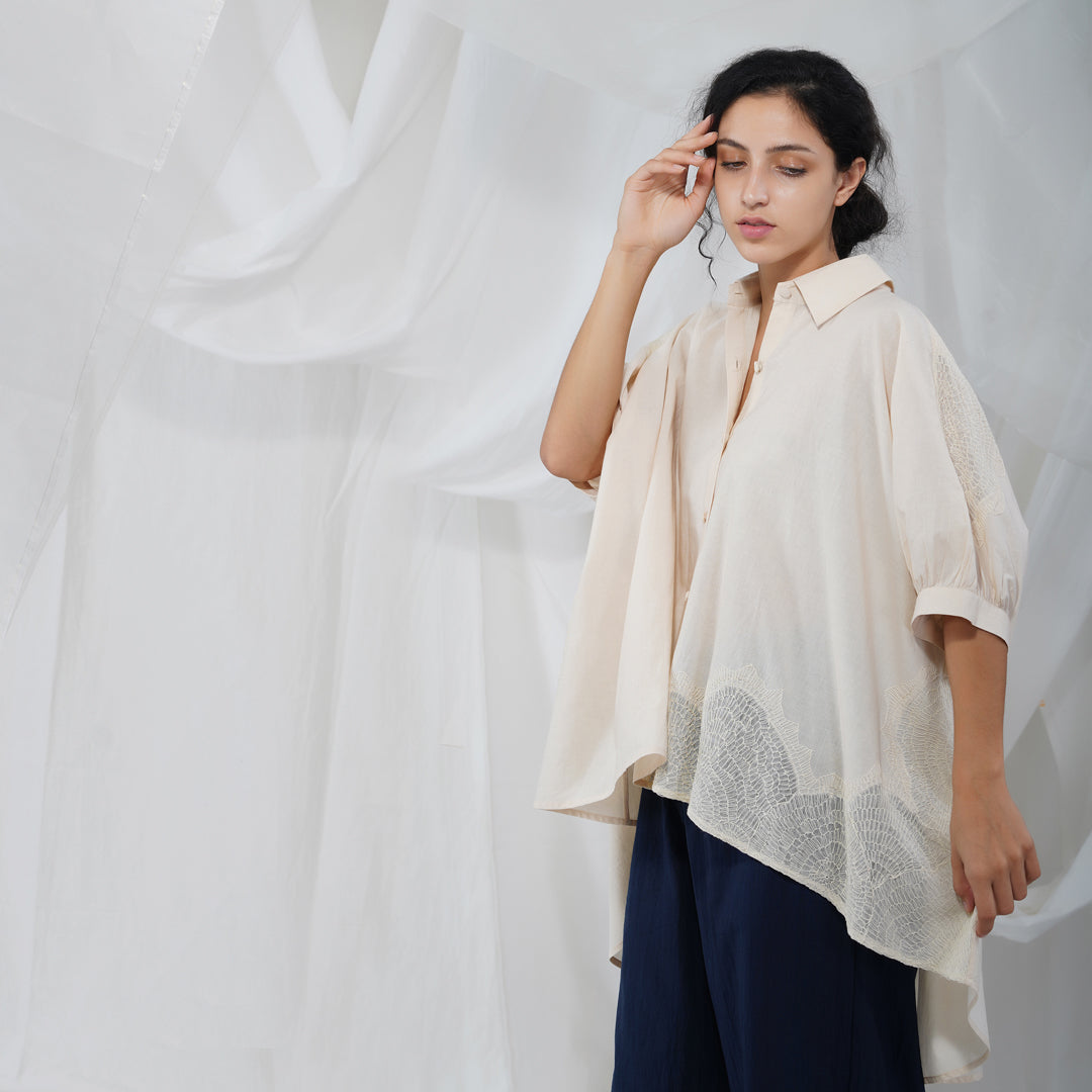 Button down puffed sleeved cotton shirt with hand embroidered details. The flared Akari shirt is part of our new White-on-White collection that is reflective of the quiet beauty of the natural world, and each stitch is a labour of love.