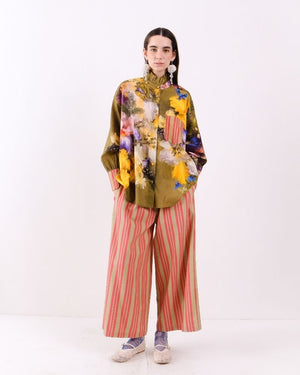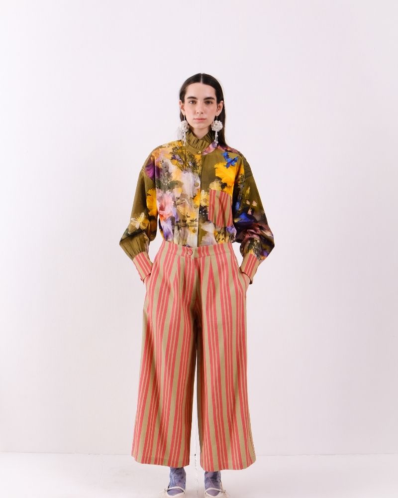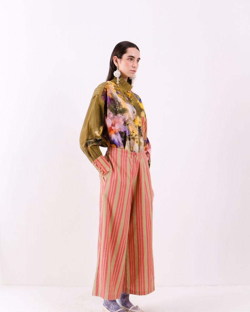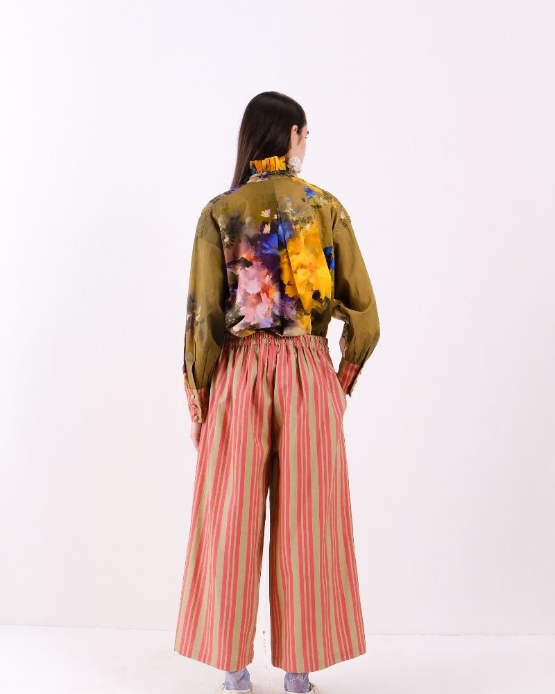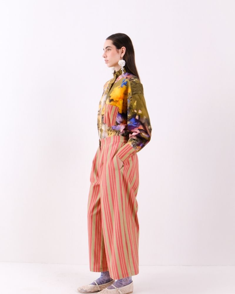 Pants in stripes story with elasticated back and side pockets in cotton canvas.