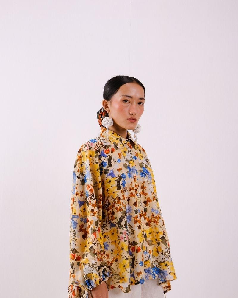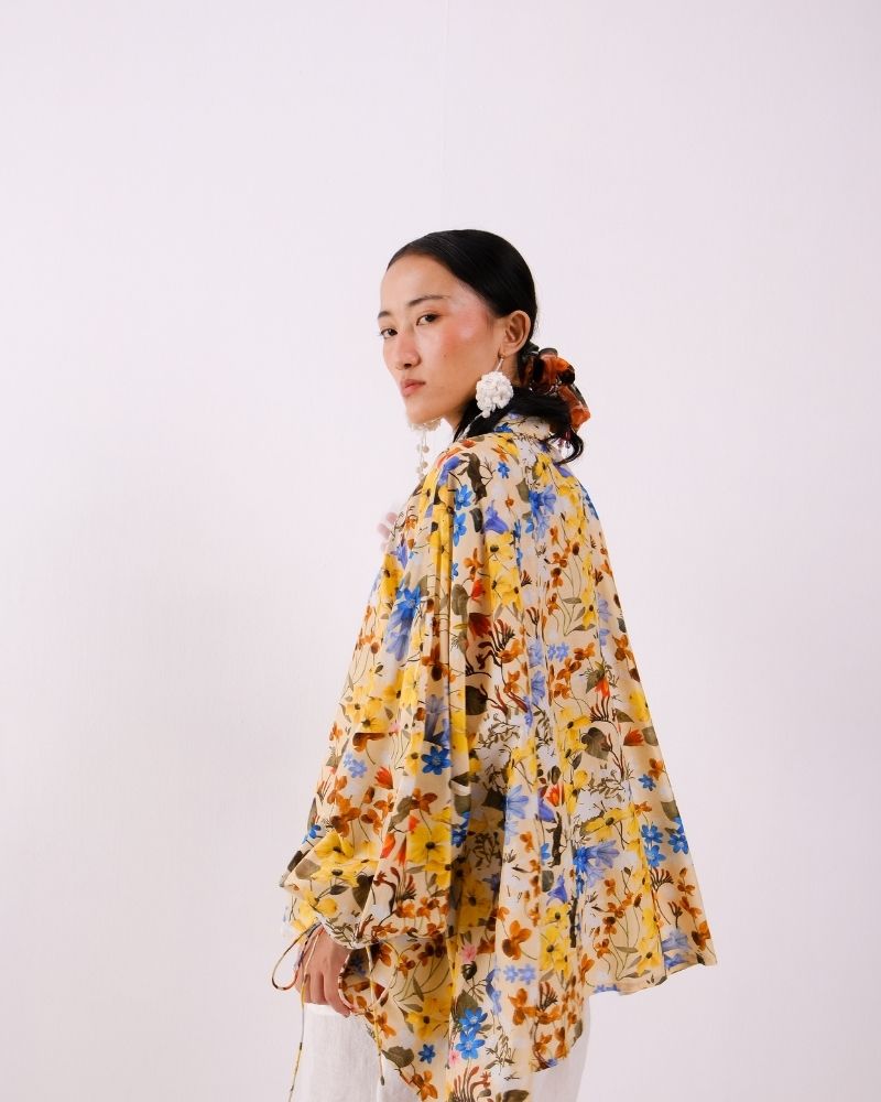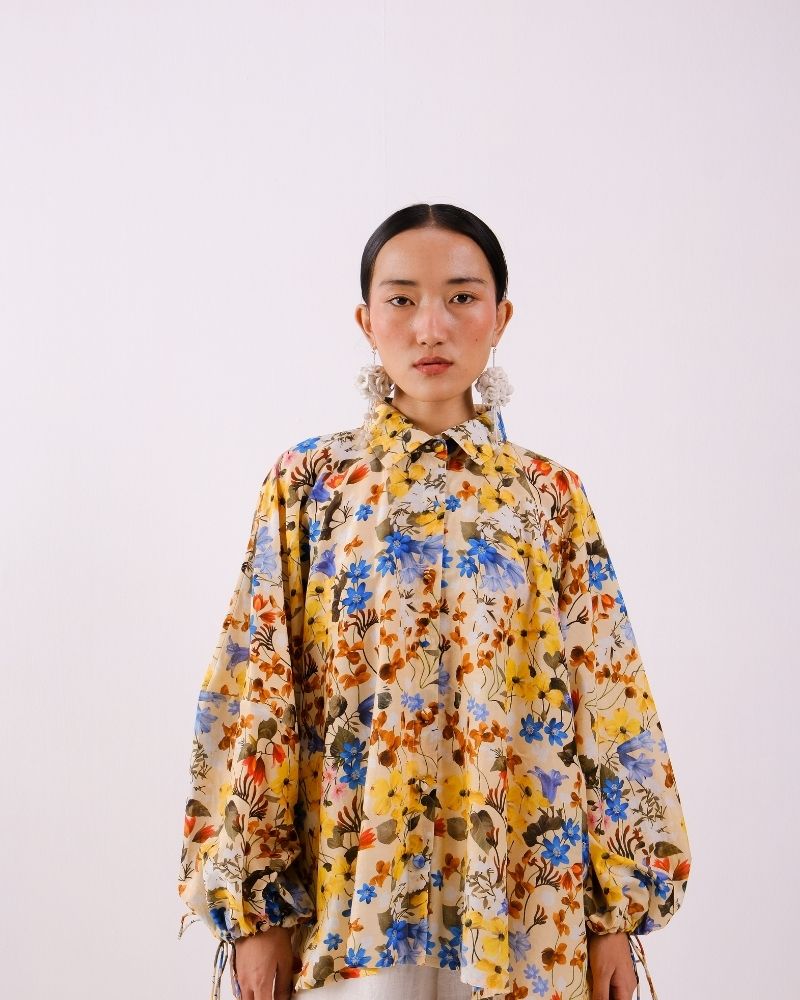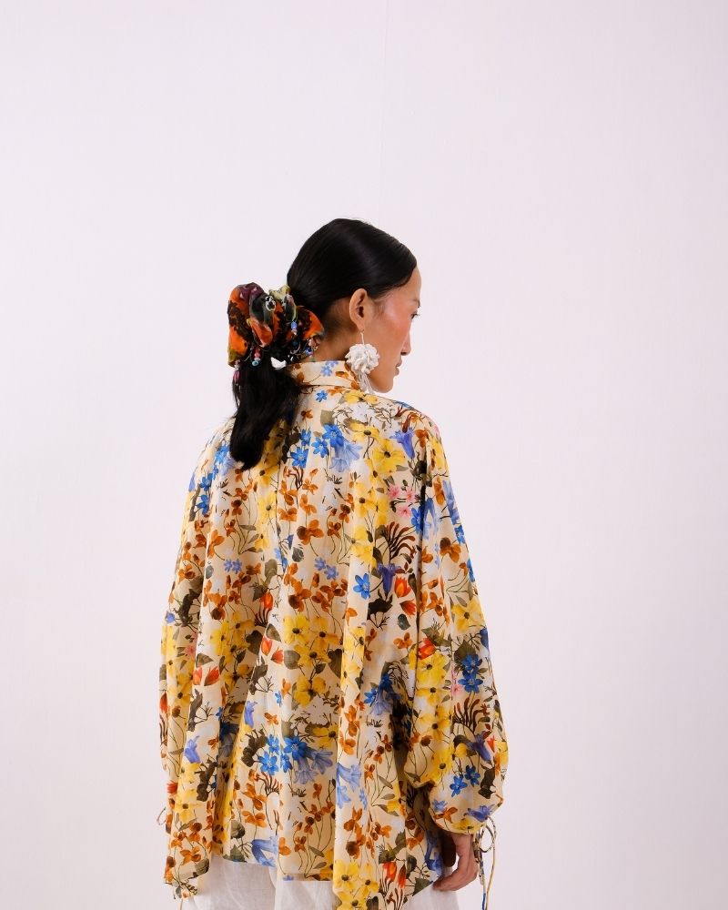 The garden of Grace button down collared shirt with drawstring sleeves in Cotton Silk.