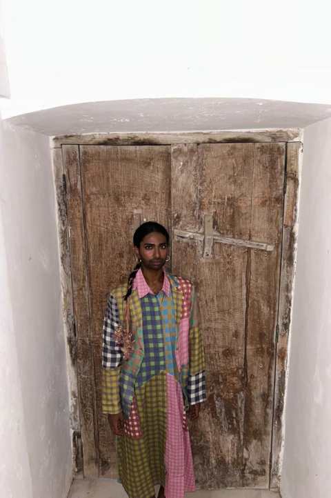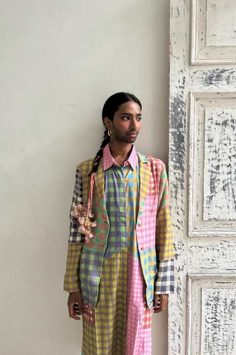 Yavi's multi checks in linen jacket with lapel and button and screen printed lining.