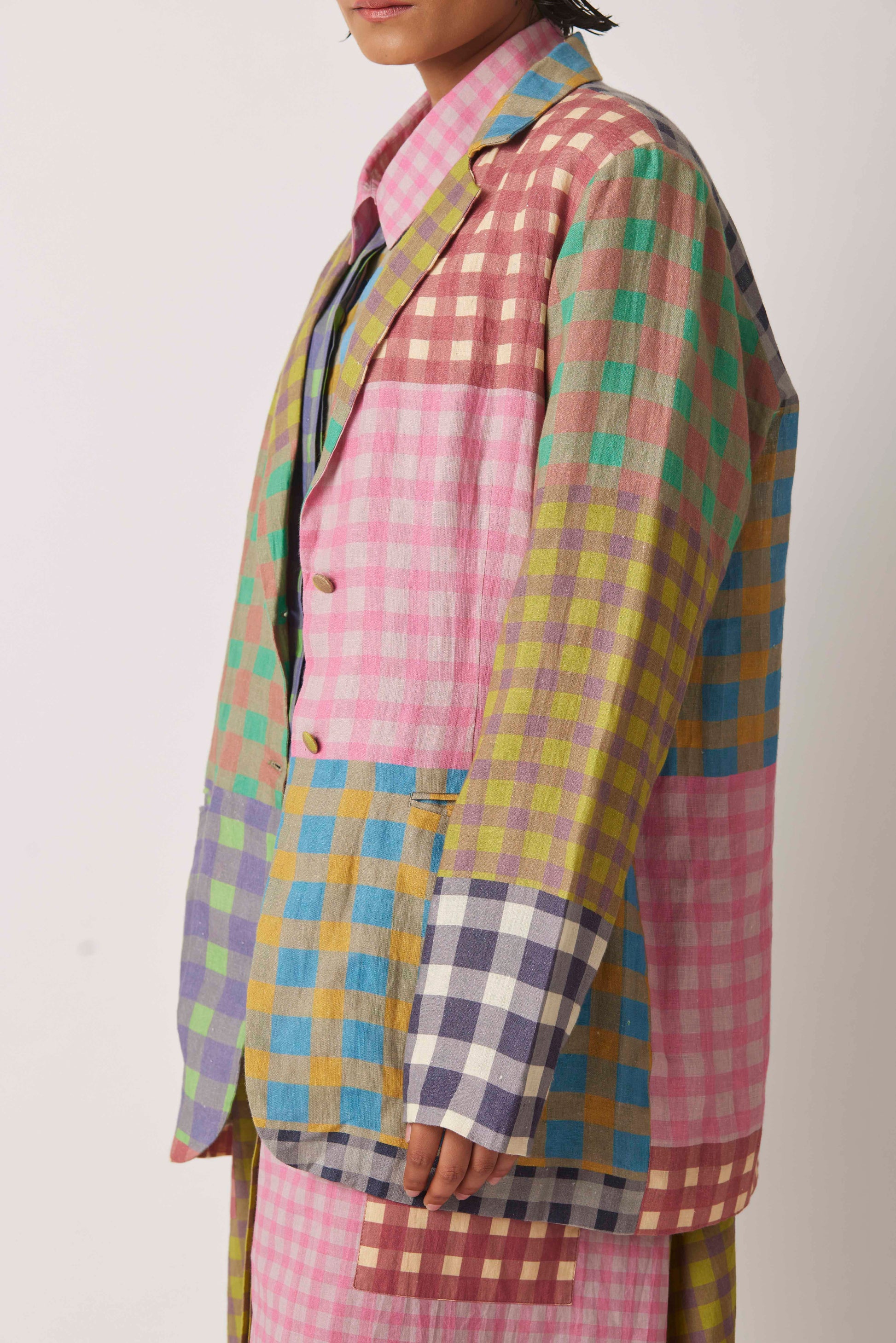 Yavi's multichecks in linen jacket with lapel and button and screen printed lining.