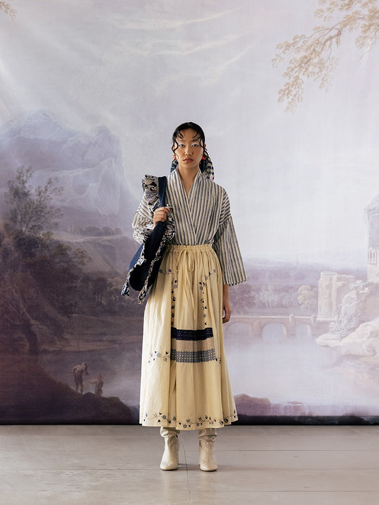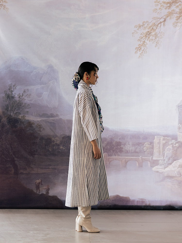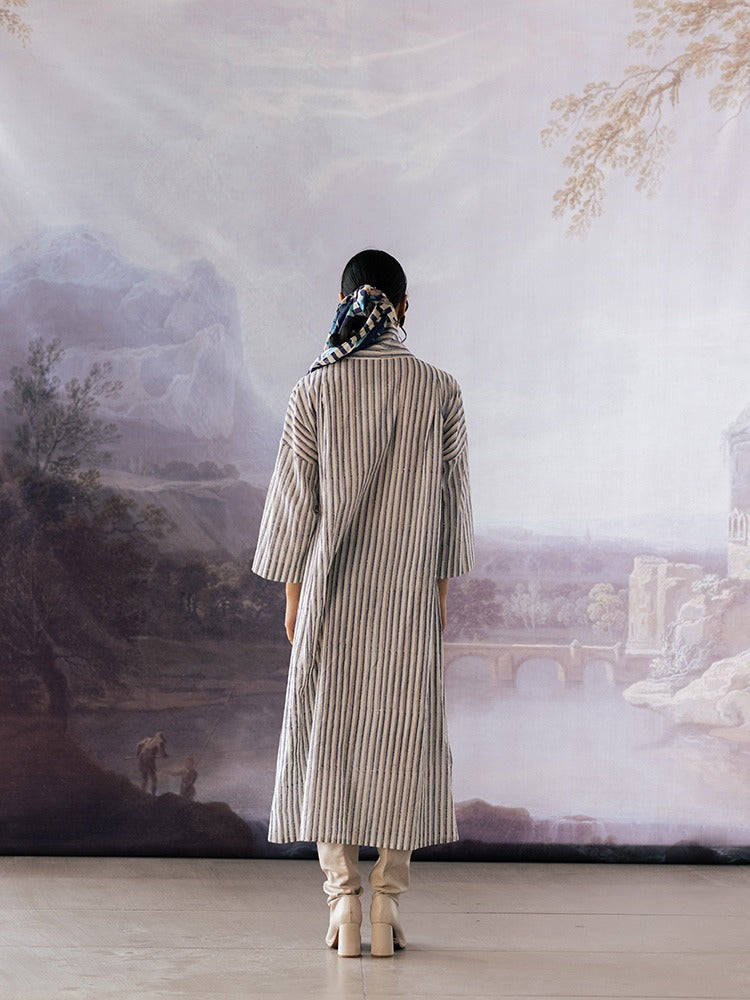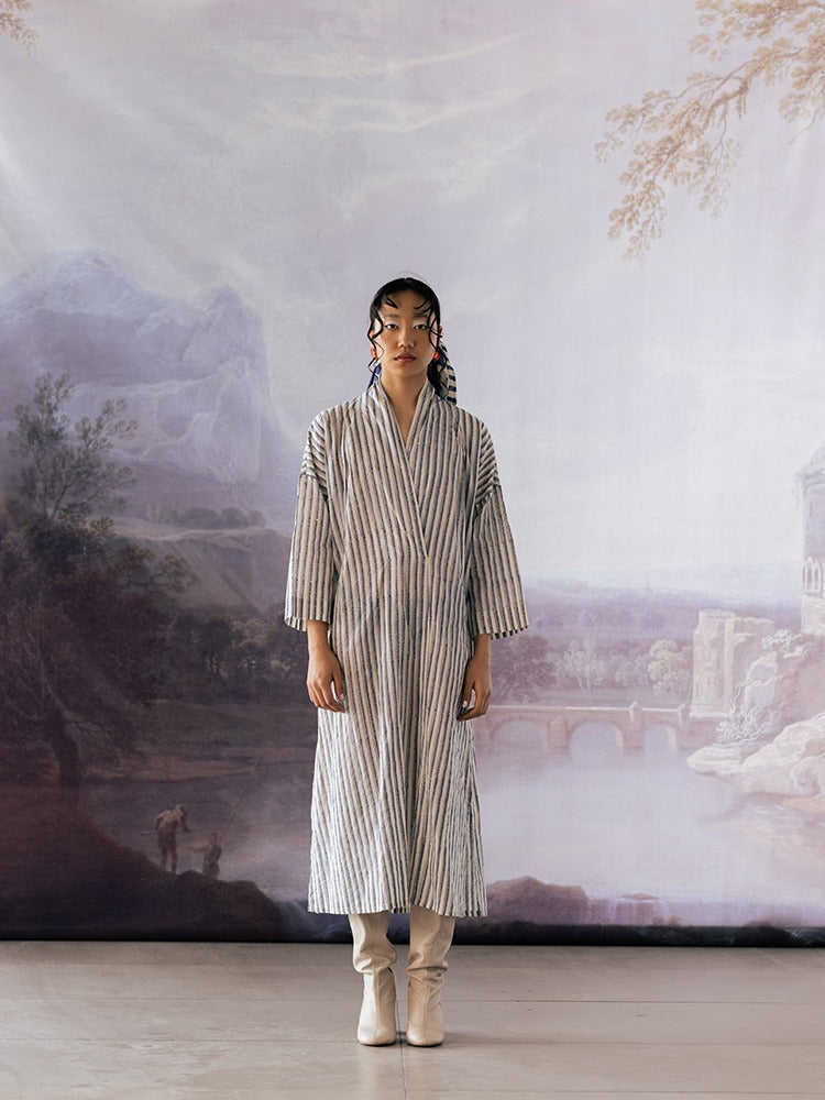Our Shadow Stripes Shawl Neck Dress, crafted in cotton with box pleats, featuring a striking combination of white and indigo hues. Elevate your wardrobe with this elegant piece that effortlessly blends style and comfort.