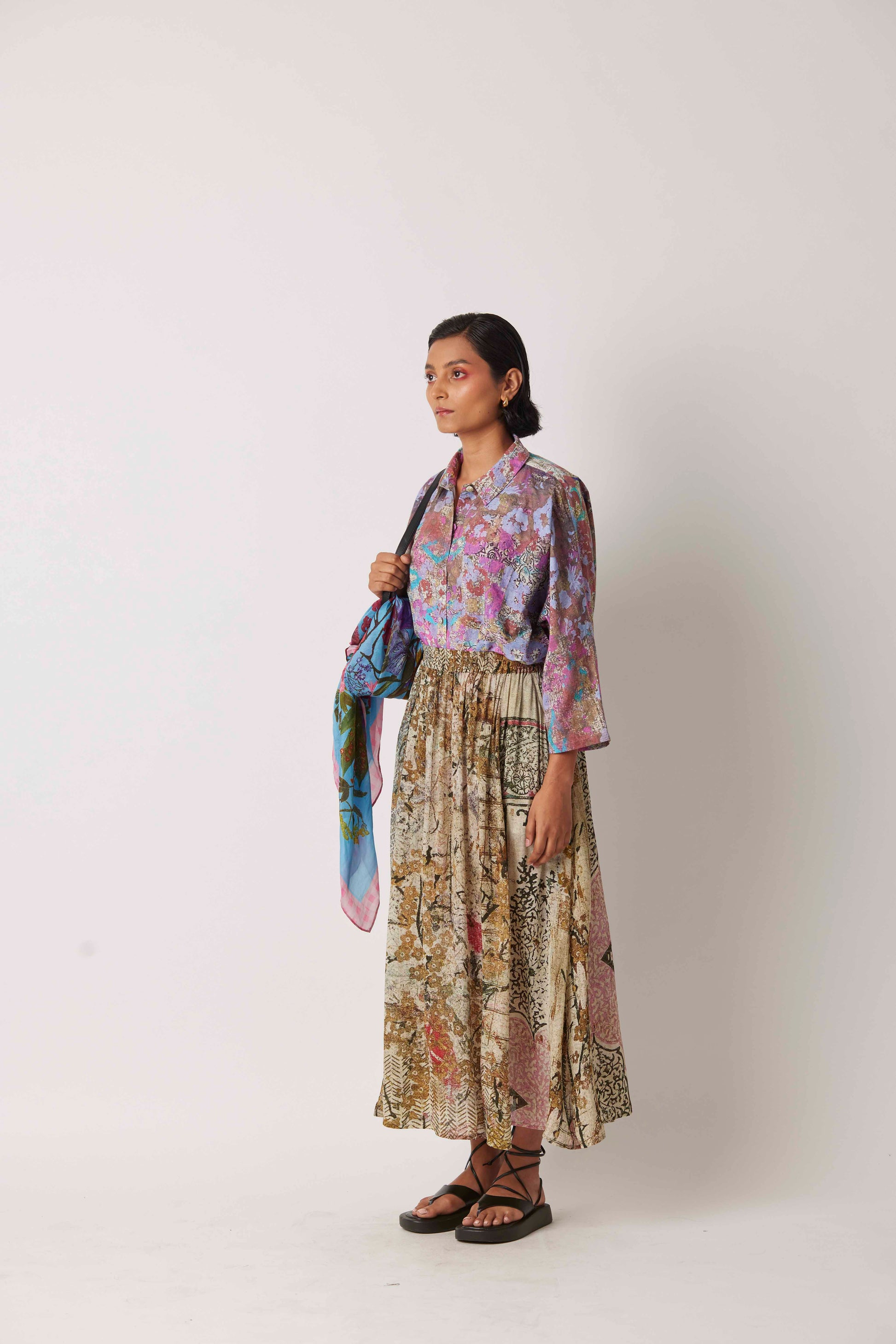 The sleeves of yavi's classic shirt are cut in a slightly loose, comfortable fit allows for ease of movement and adds to the relaxed feel of the garment. This print catches light in a way that accentuates its delicate hues.