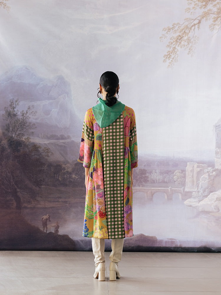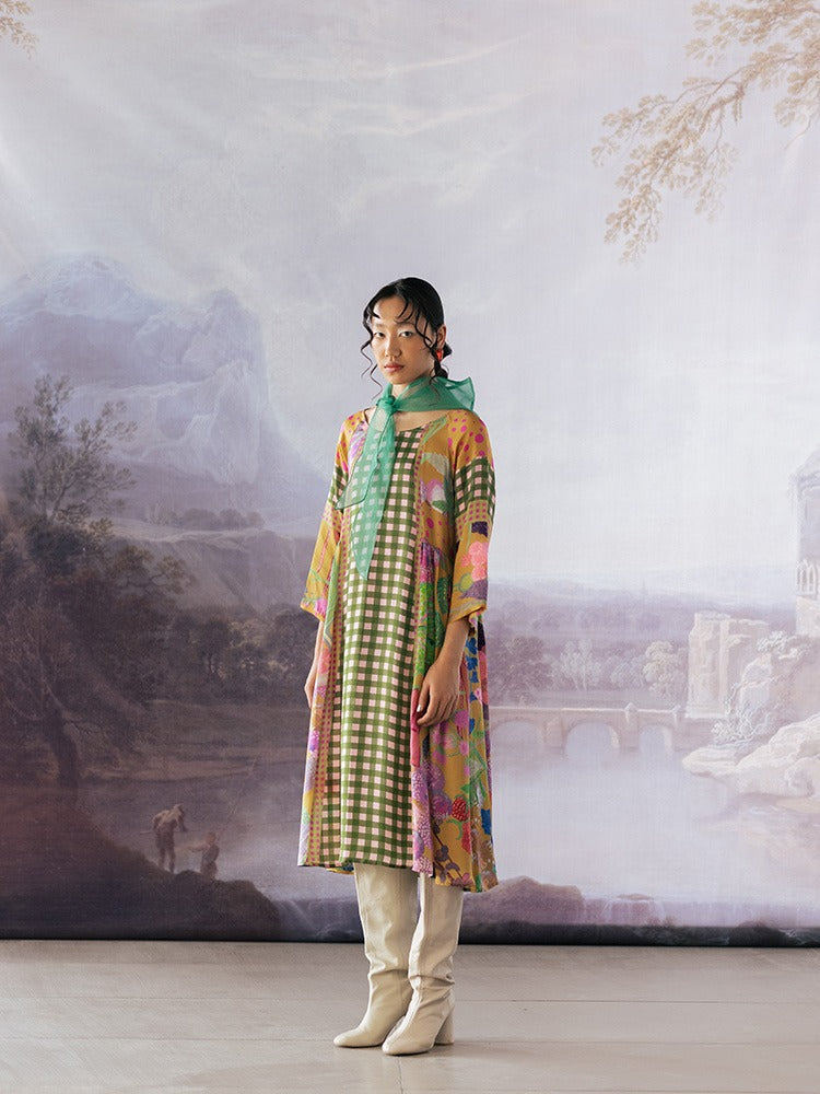 This stunning dress features a captivating print inspired by the charm of kitchen gardens, adorned with delightful checks. Designed with 3/4th sleeves for added elegance, its gathered sides create a flattering silhouette that effortlessly complements any figure. Elevate your style with this enchanting piece that blends botanical beauty with timeless sophistication.