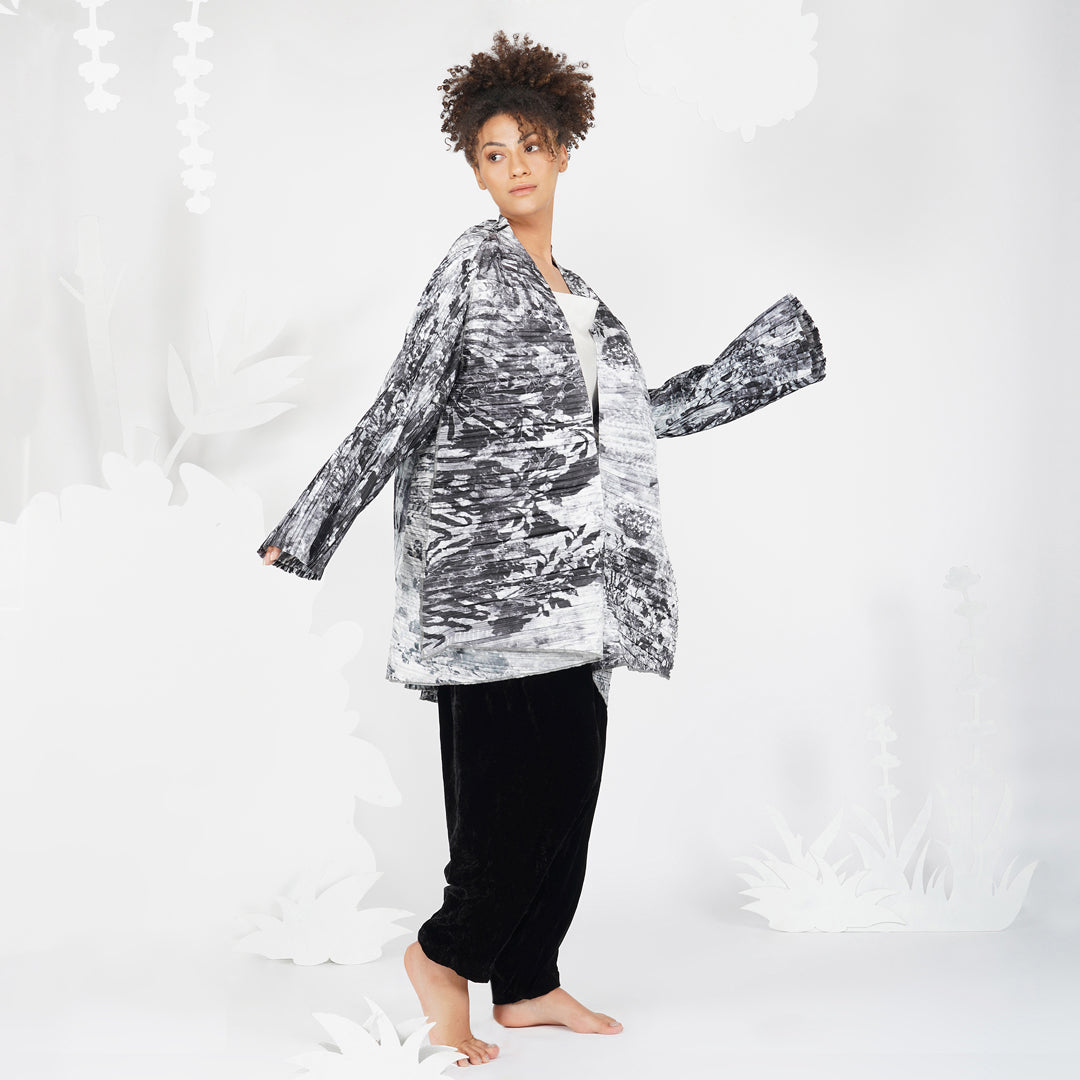 Yavi's impressionist prints take on the world of light and shadow with these monochrome printed on pleated silk . This fabric adds to its allure by catching light at certain areas and reflecting it.