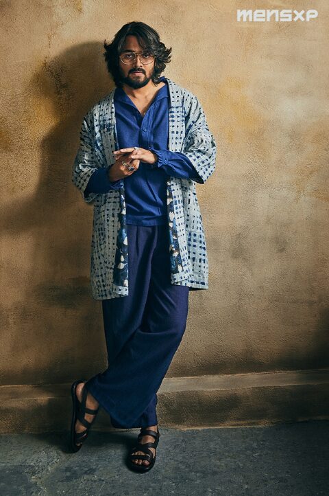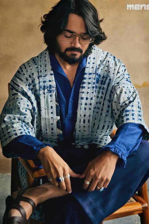 Lapel collar jacket in hues of blue done with shibori technique of tye n dye
