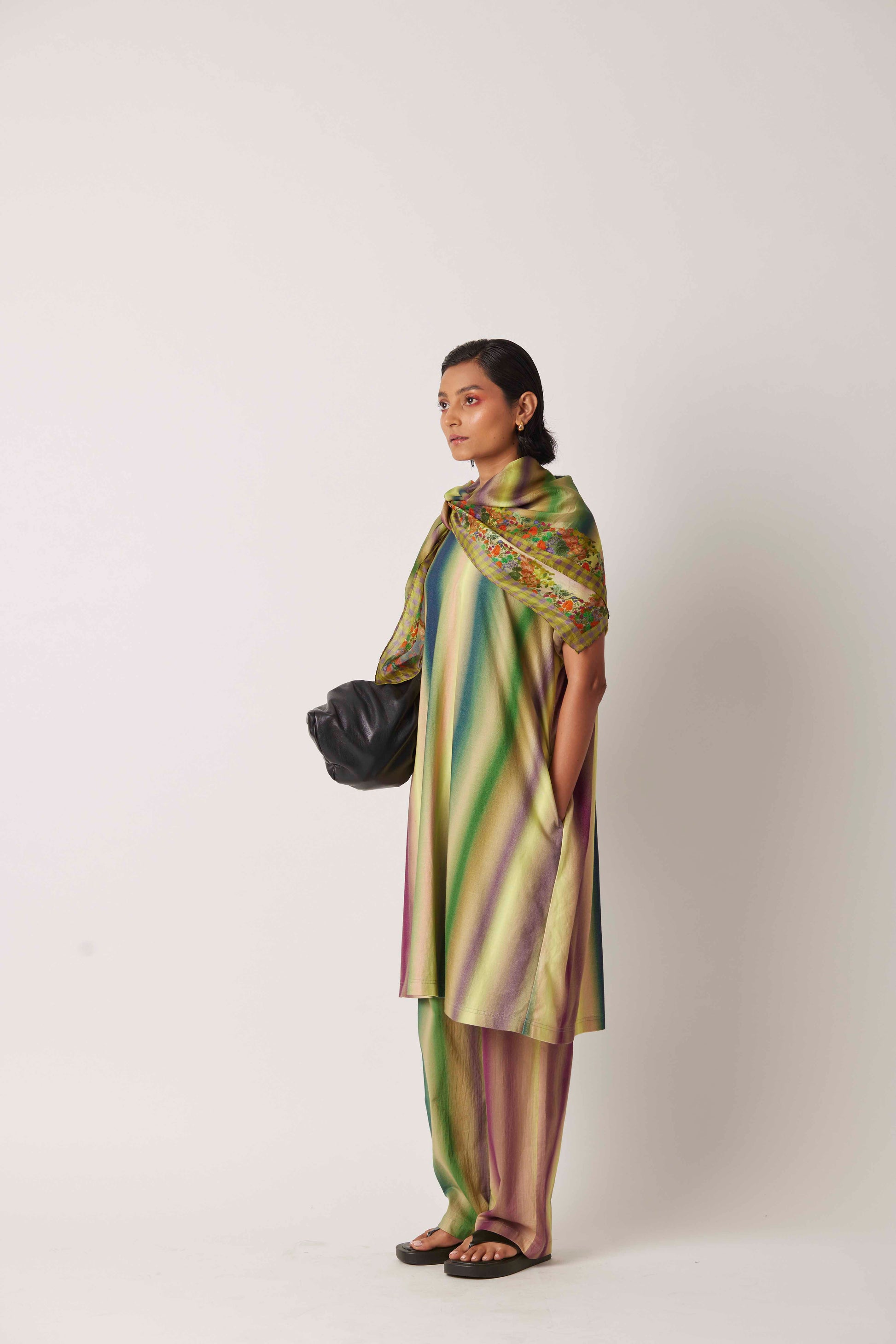 Straight pants with elastic all around the waist digitally printed with merging lines of chalks creating a melange of violet, green,lime green and blue.