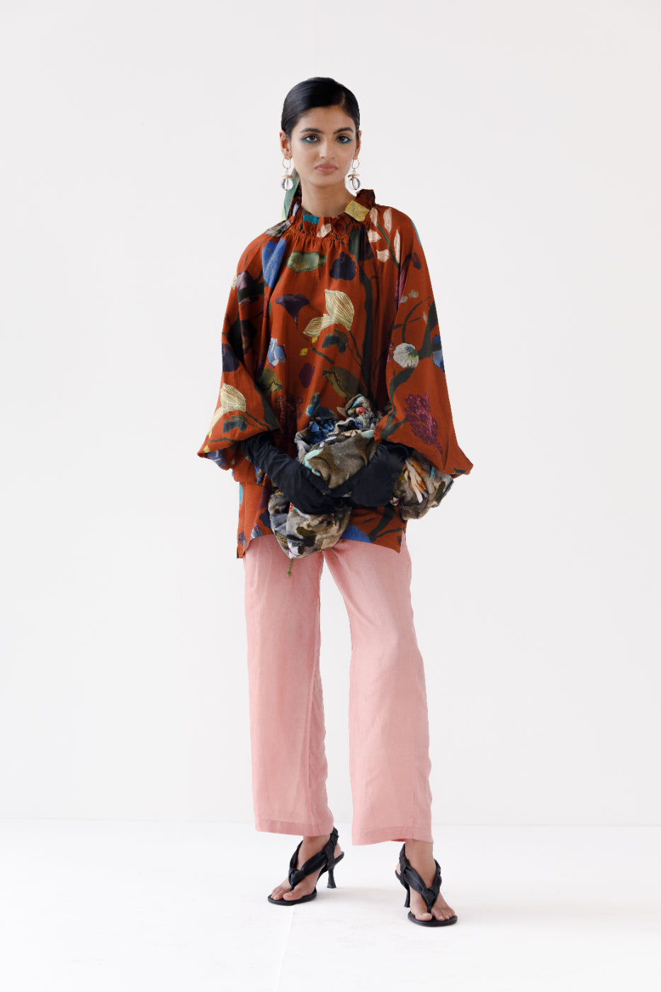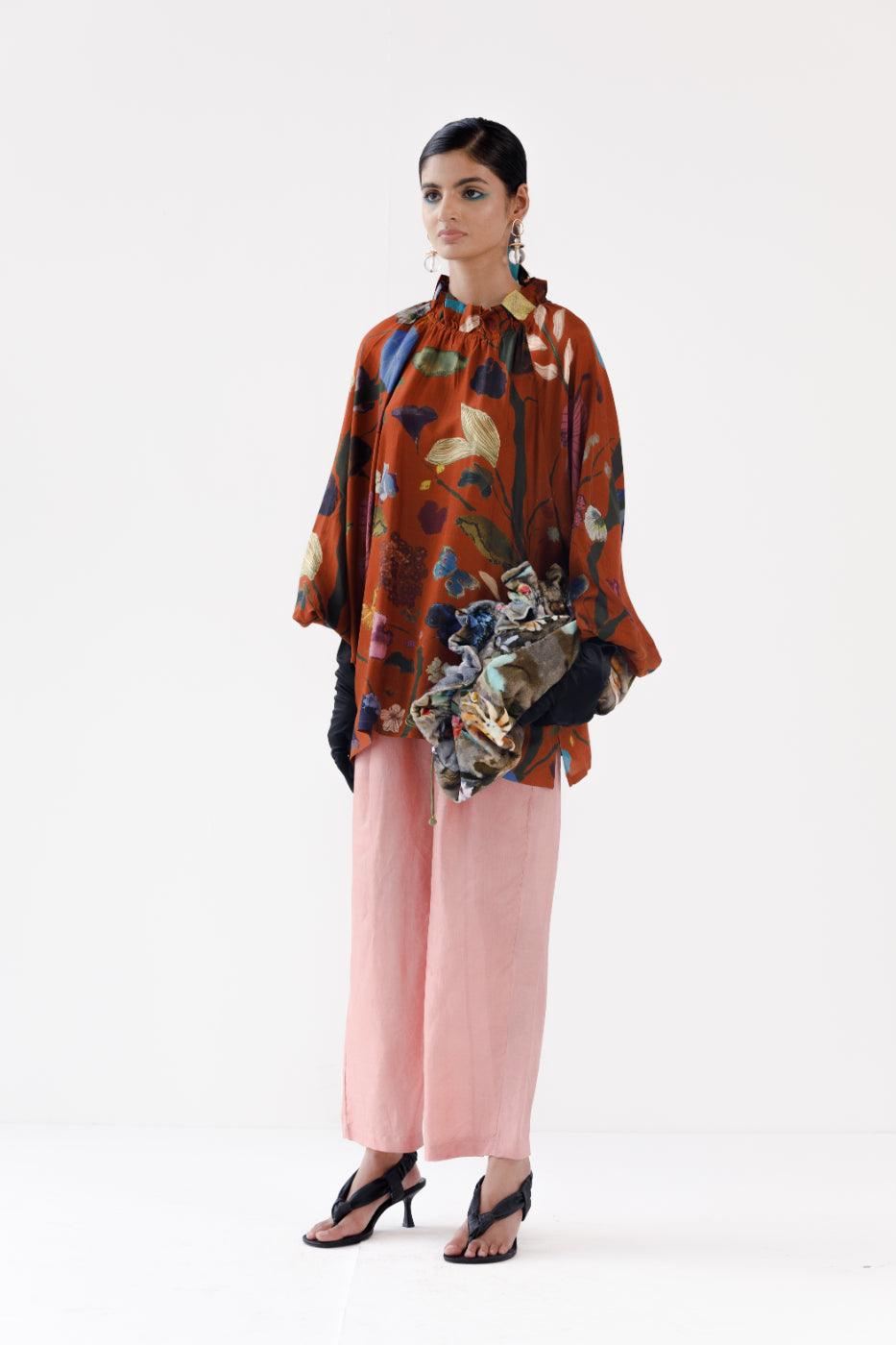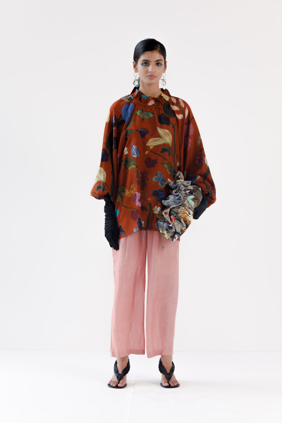 Floral inspired from the charm of a vine garden in a 100% silk top with puff sleeves and elasticated ruffle neckline.