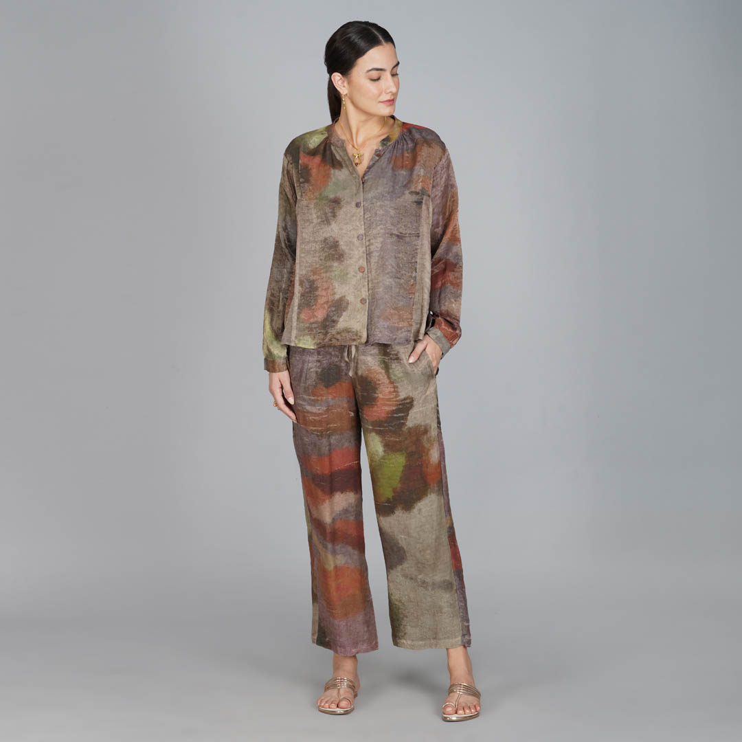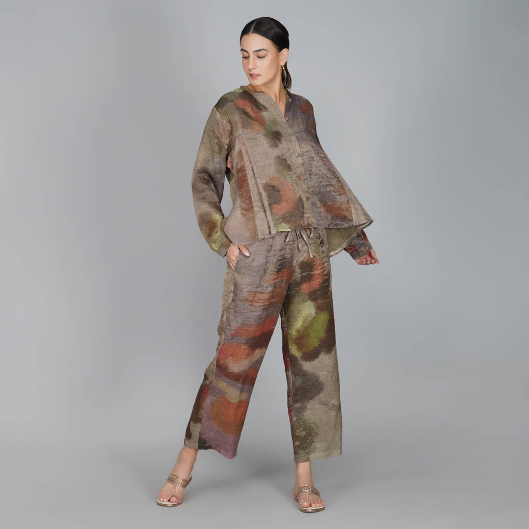 - Impressionist brush strokes amalgamates with handwoven Cotton zari fabric. Bene Trouser with utility pockets and drawstrings on waist makes it functional yet chic.