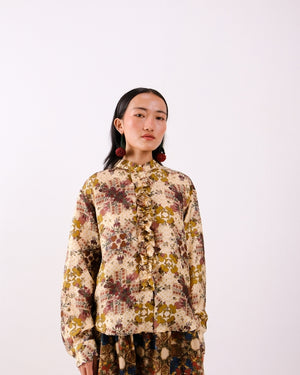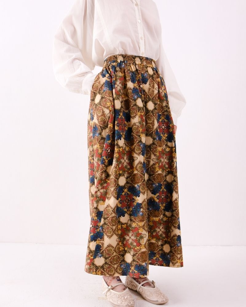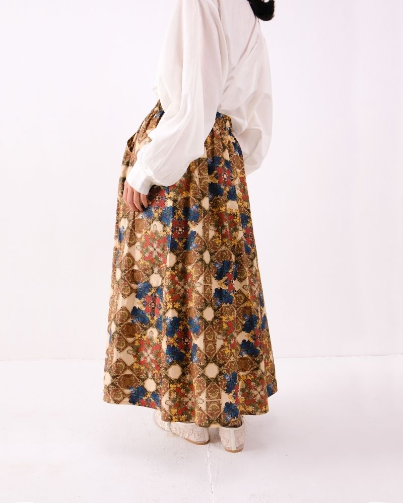 High-waisted midi skirt featuring an intricate floral print in rich earthy tones. Designed with soft gathers and a fluid silhouette, it offers effortless movement while adding a touch of vintage-inspired elegance. Skirt is sold as a separate.