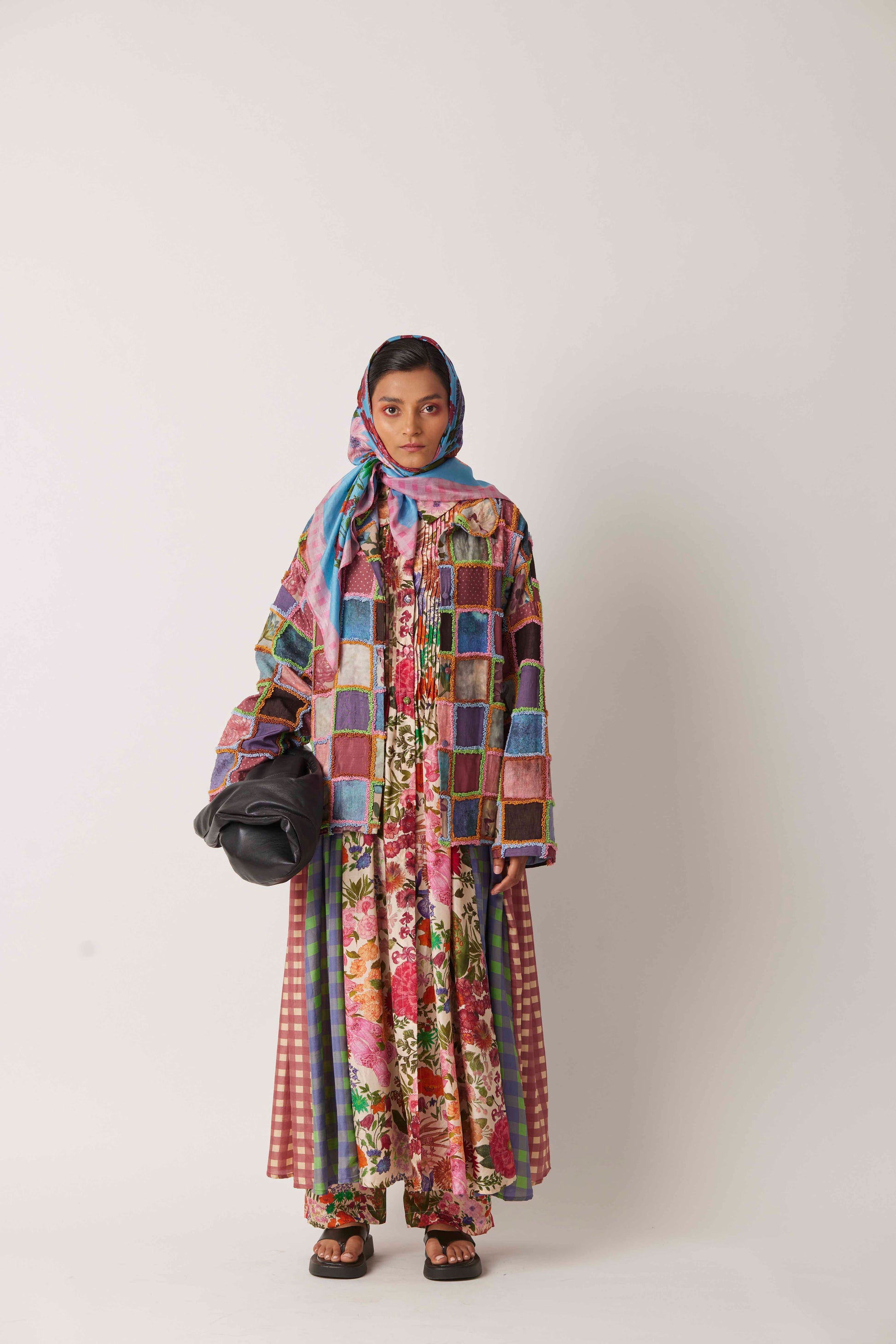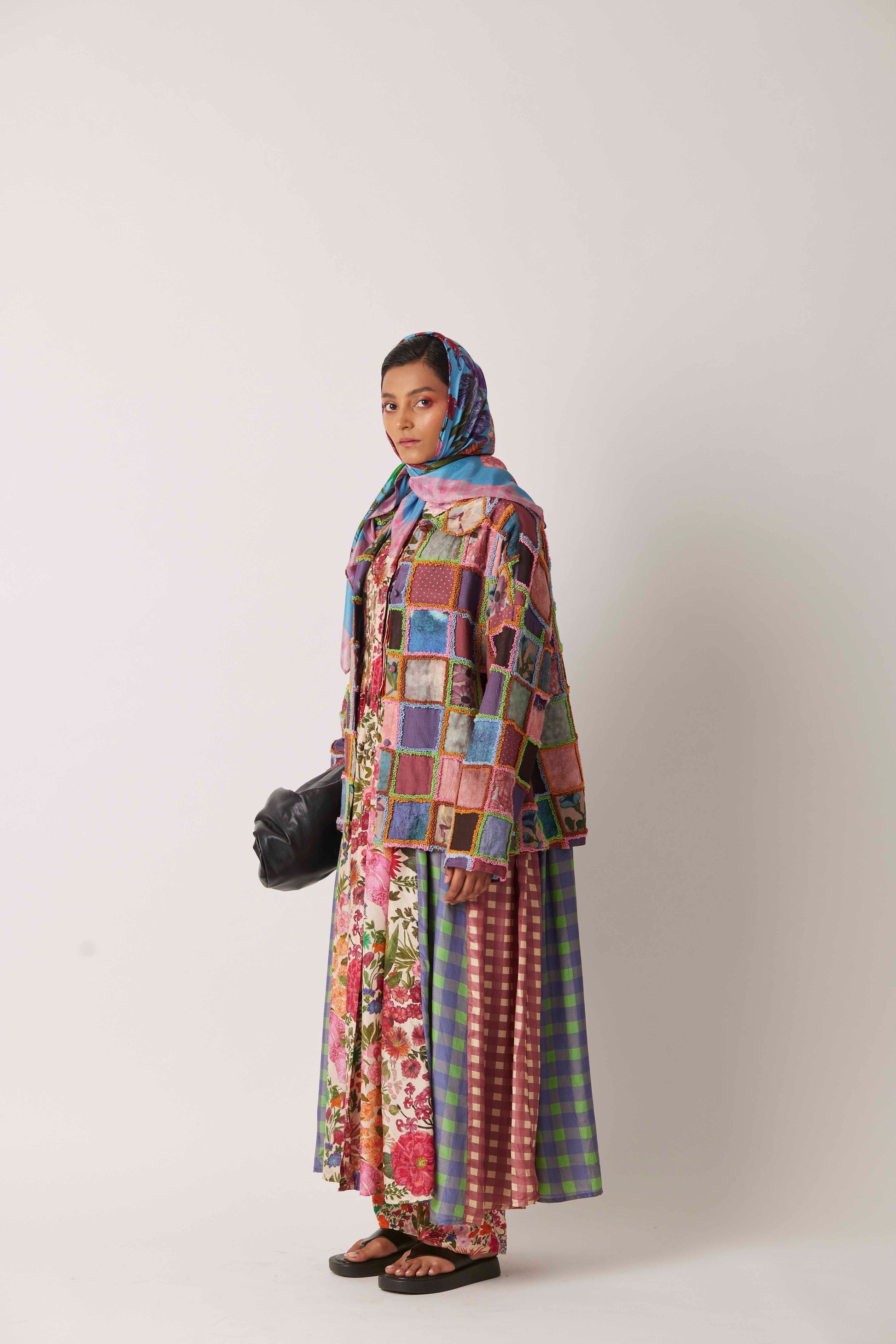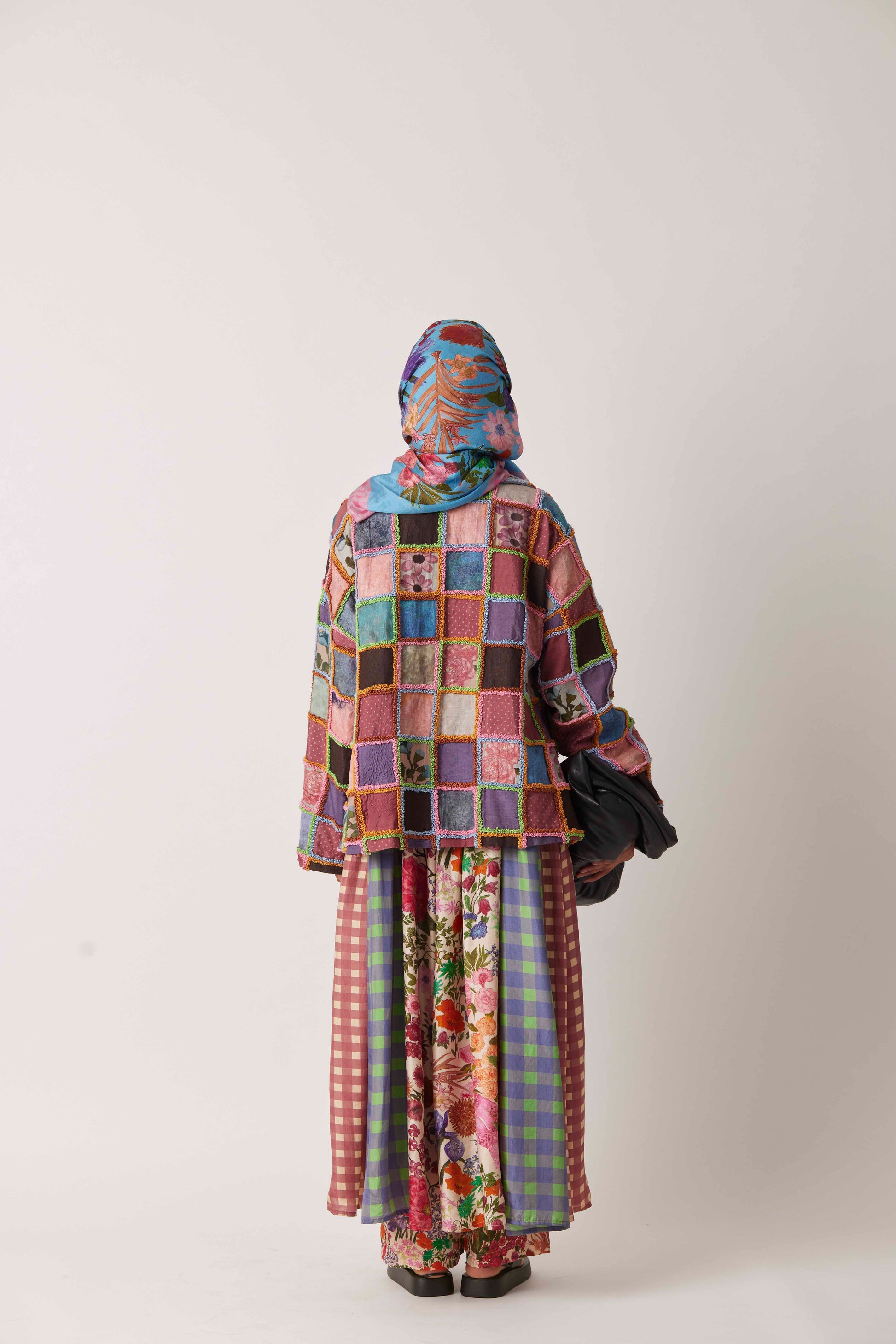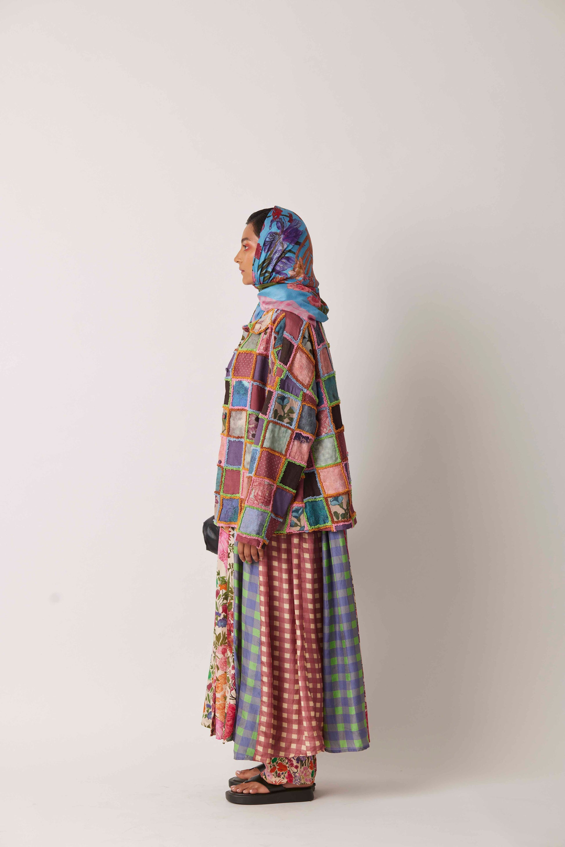 A jacket made my using upcycled fabric stiched together with hand embroidery loops all along the joinery making it a remarkable statement Yavi jacket.