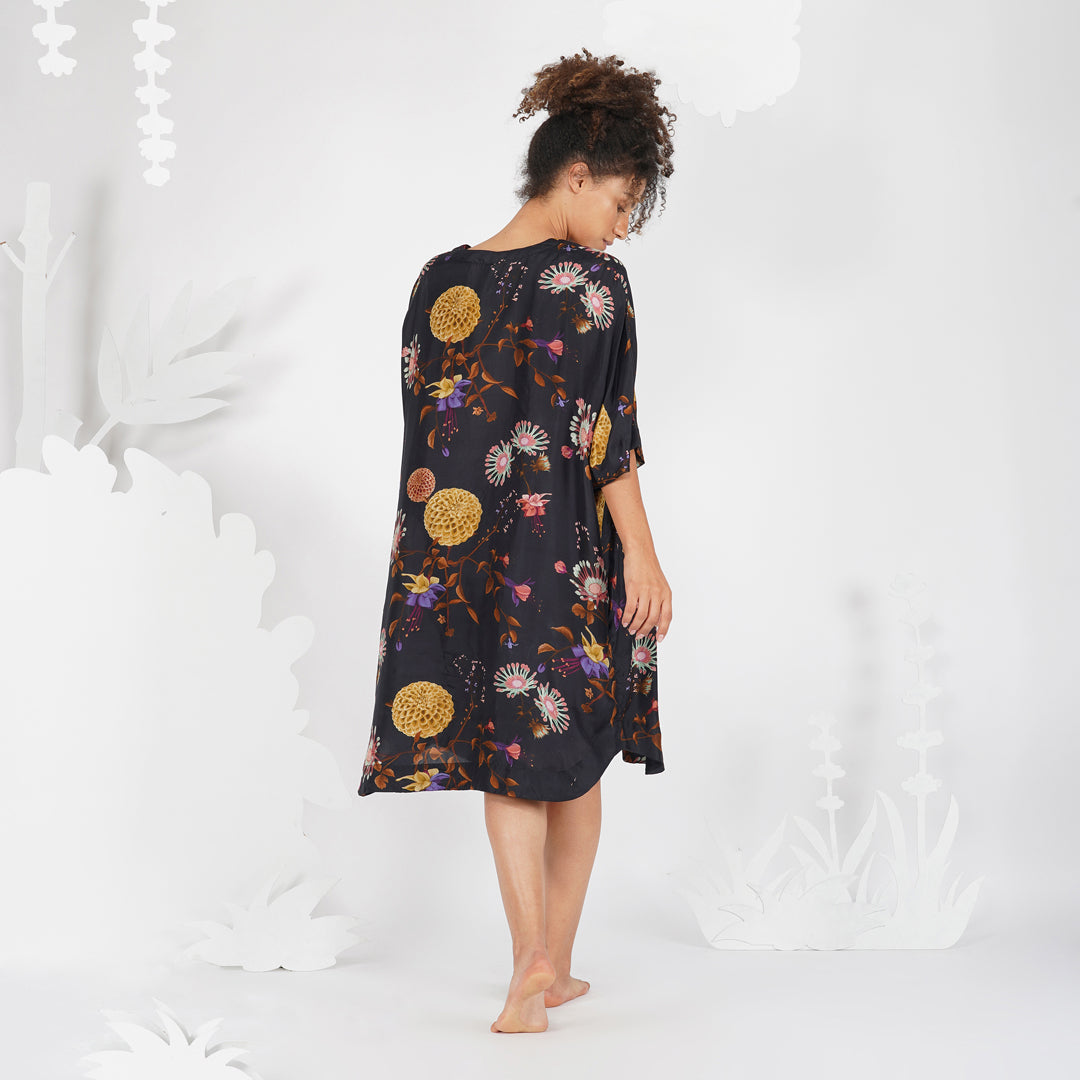 - Floral printed silk dress. Kimono Sleeves.