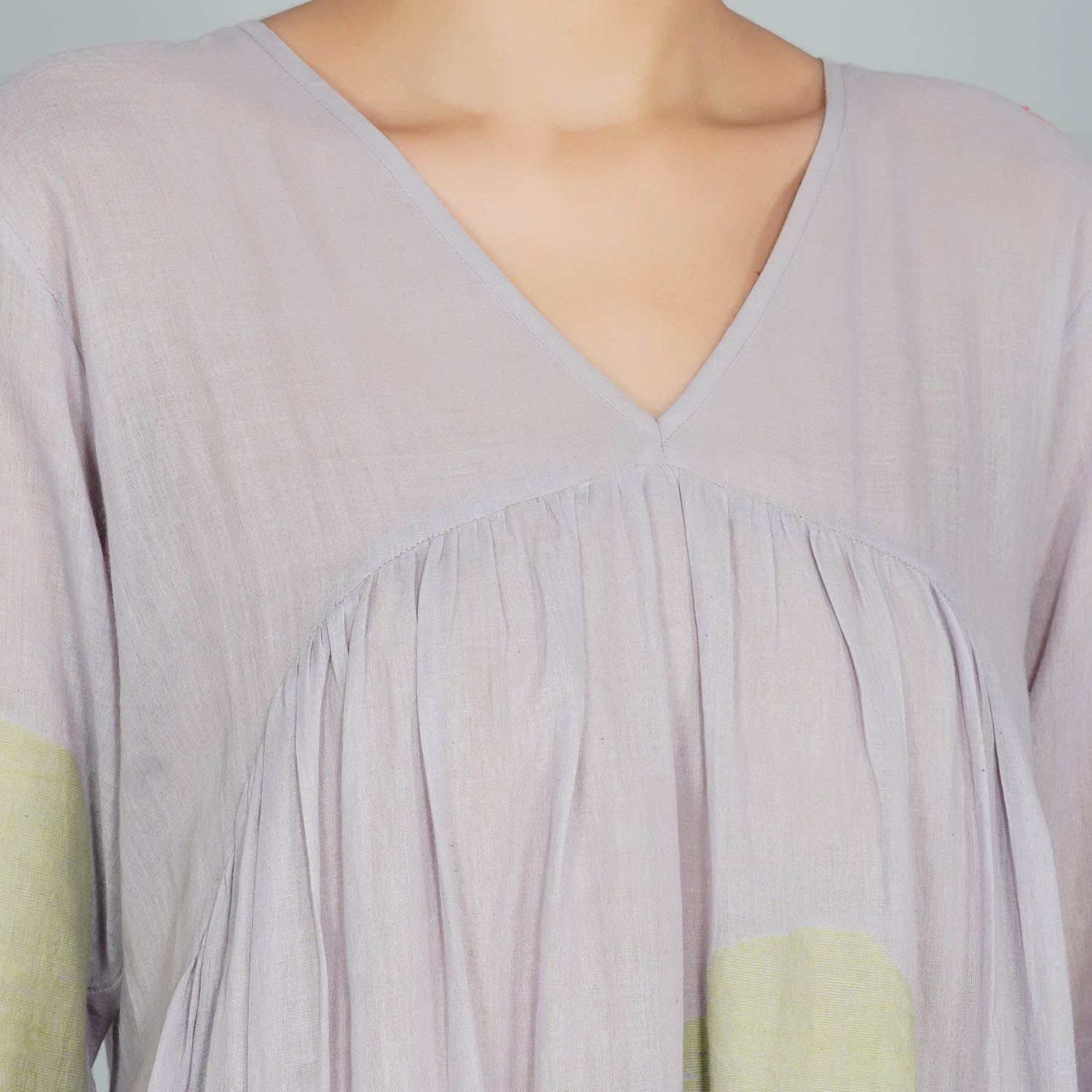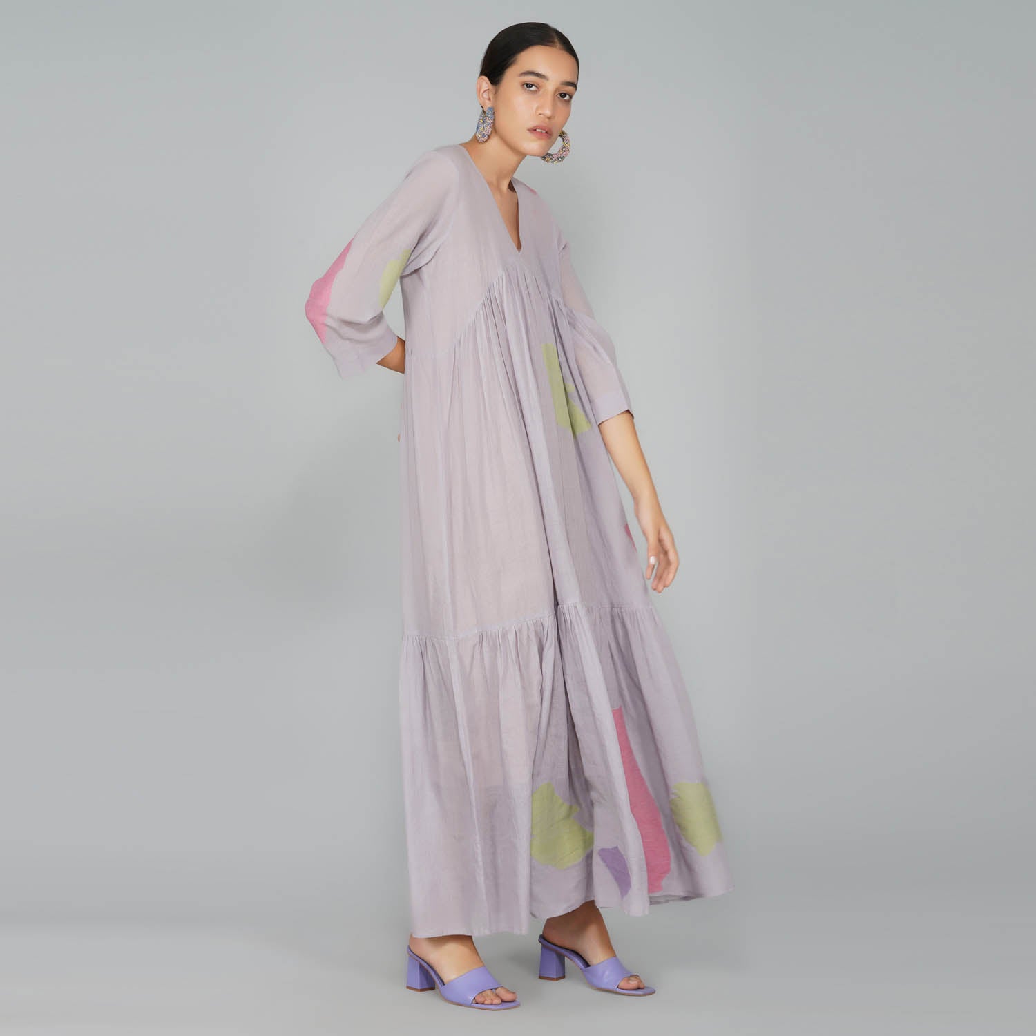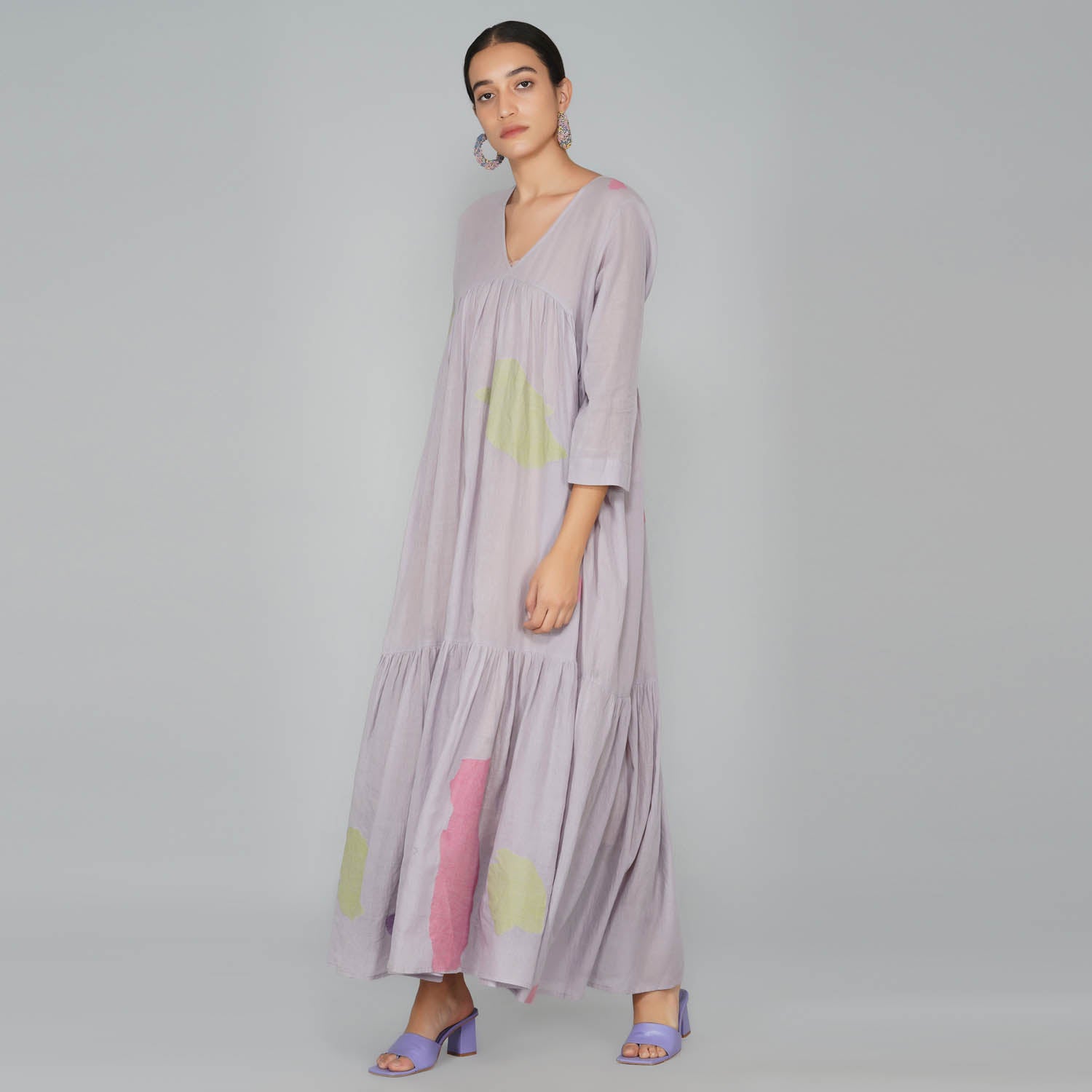 - V-neck gathered 3 tier voluminous cotton jamdani dress