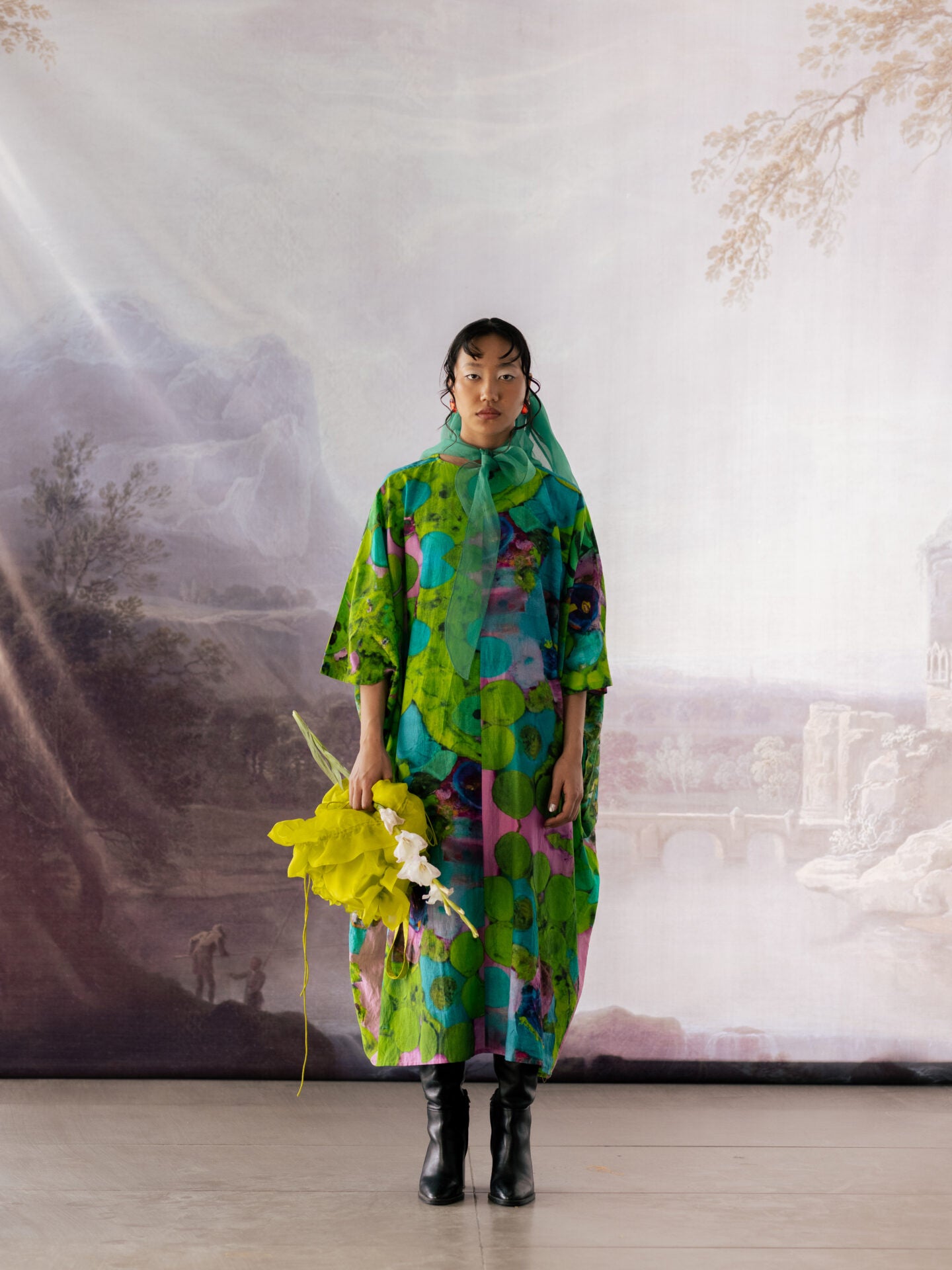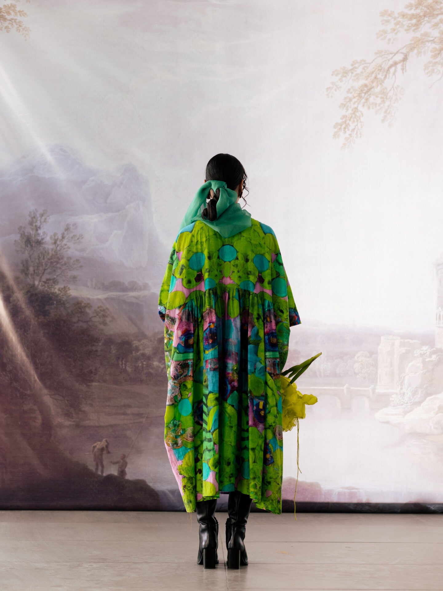 Our AI Art Printed Dress, a masterpiece of creativity and style. This dress features pockets for added convenience, waist gathers for a flattering silhouette, and an asymmetric hem for a unique touch.