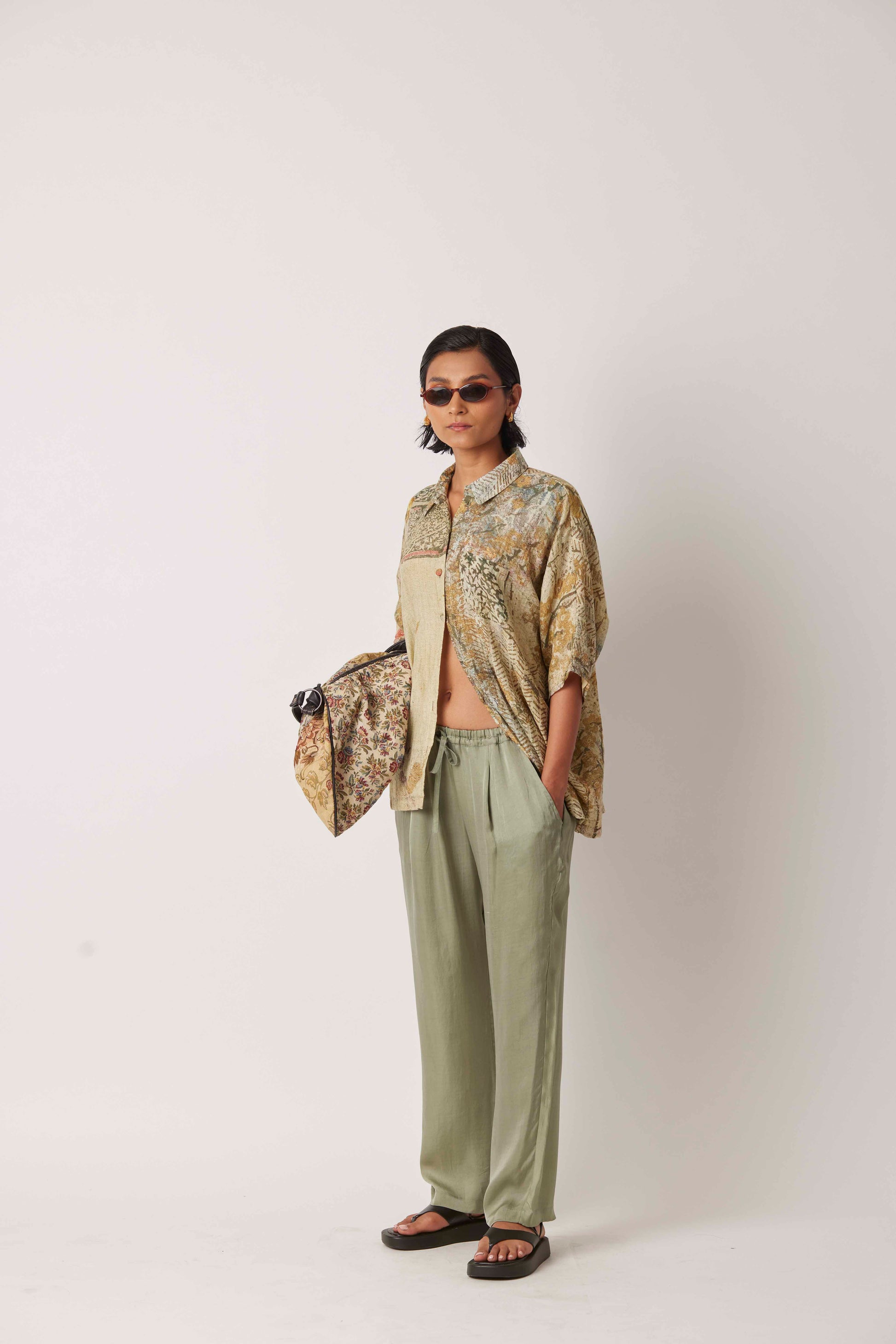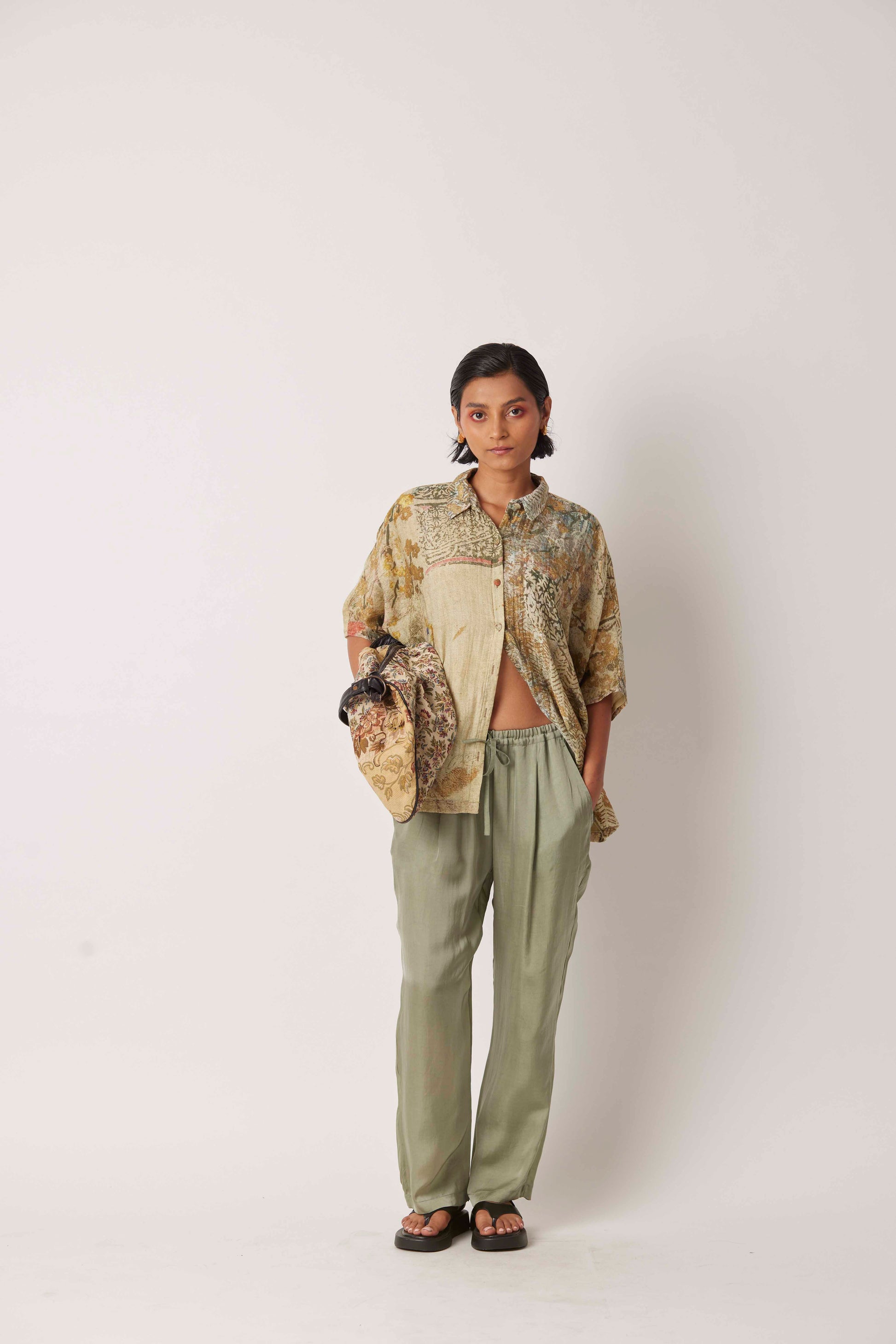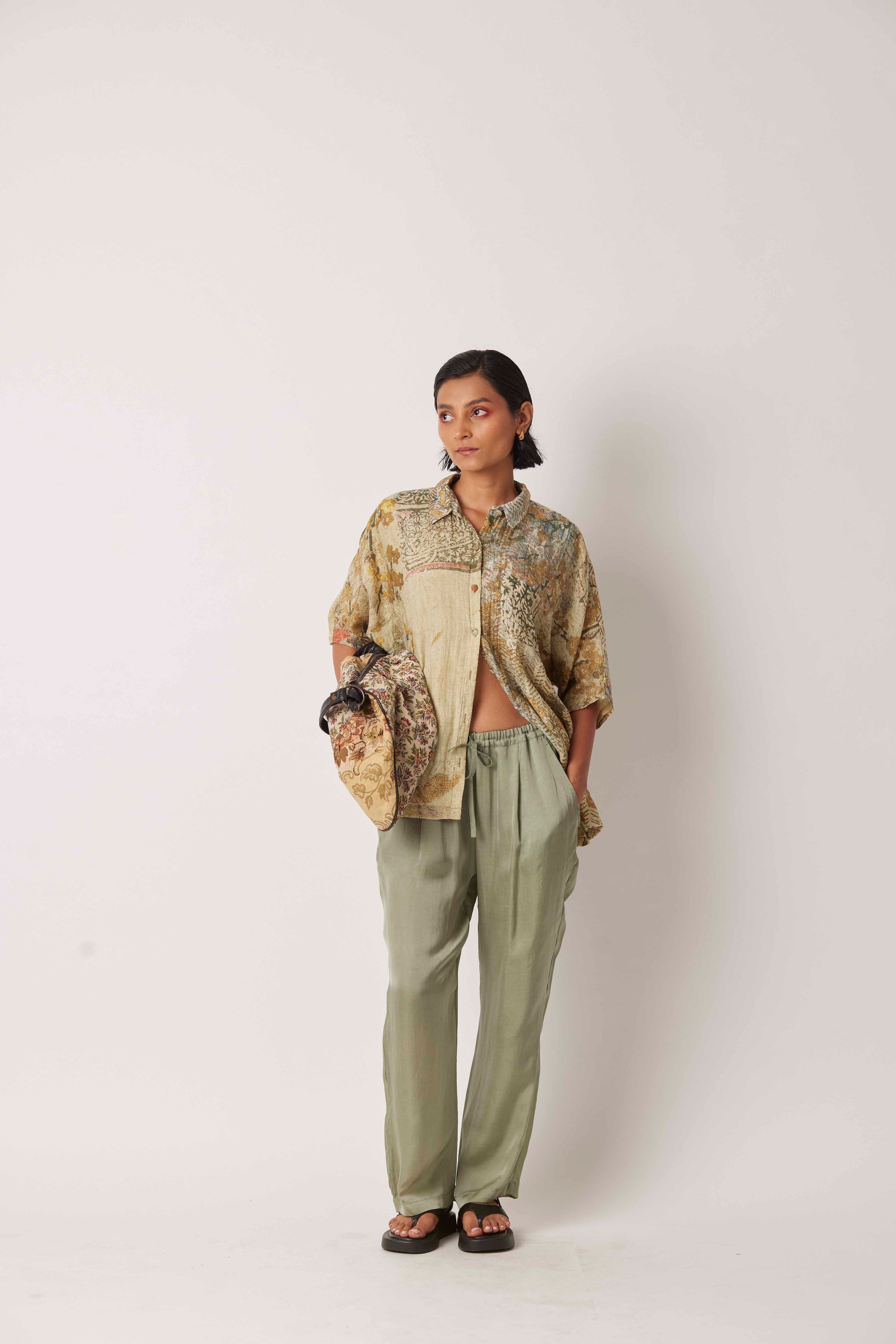 Yavi's IMPRESSIONIST story printed on a relaxed shirt with fabric buttons and pocket.