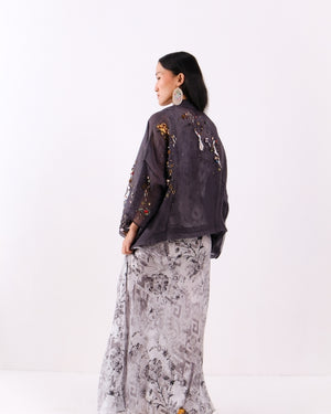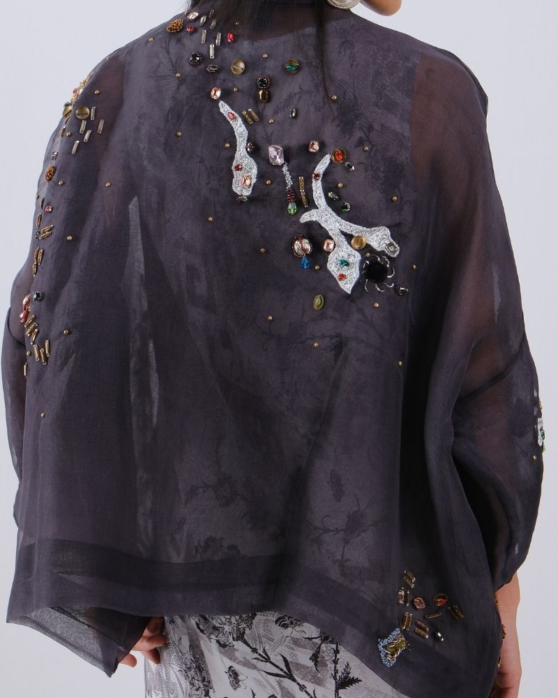 Lightweight organza jacket crafted in a sheer black finish, featuring delicate embroidery that adds subtle texture and depth. The airy silhouette layers effortlessly, bringing an elegant and refined touch to the look. Jacket is sold as a separate.