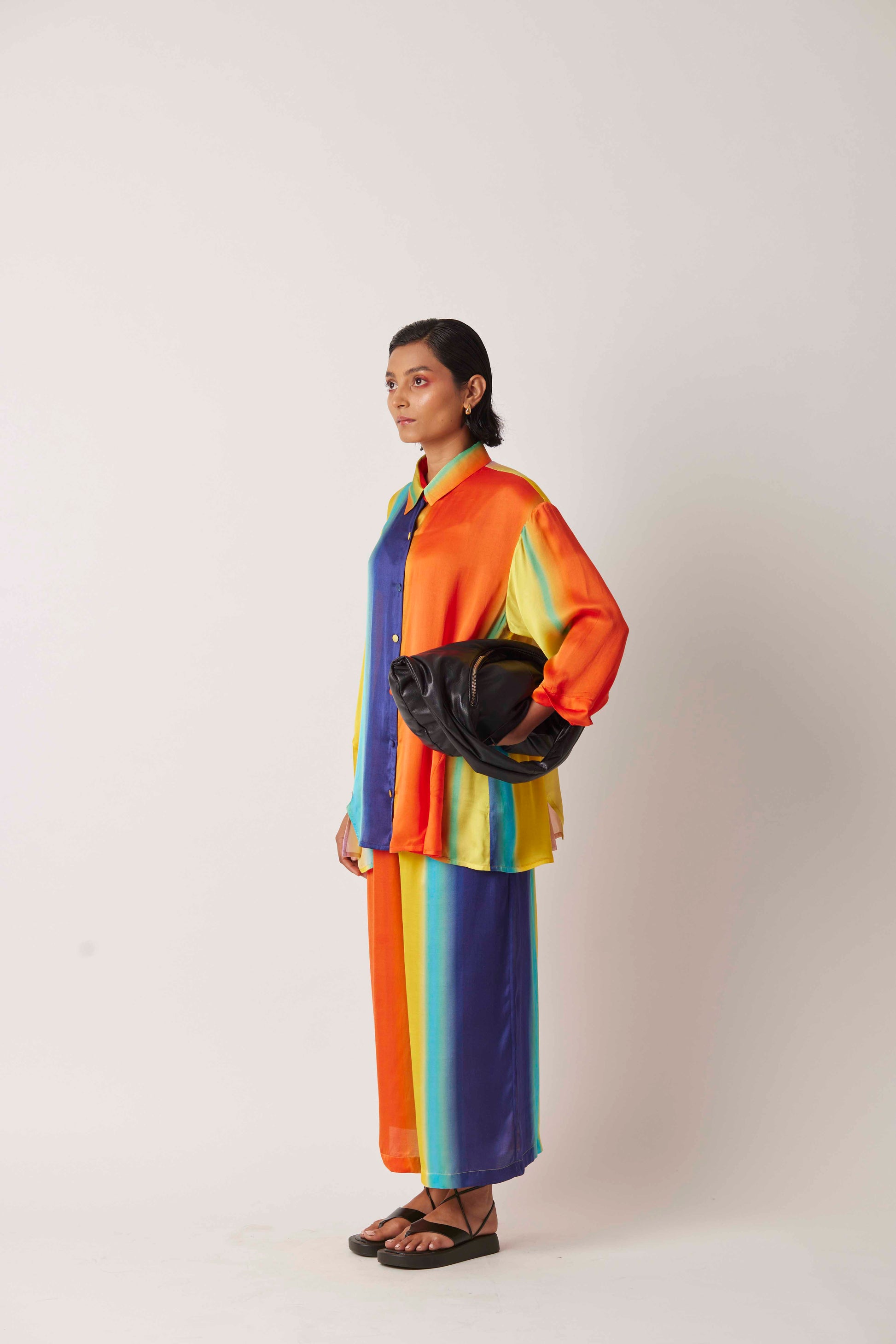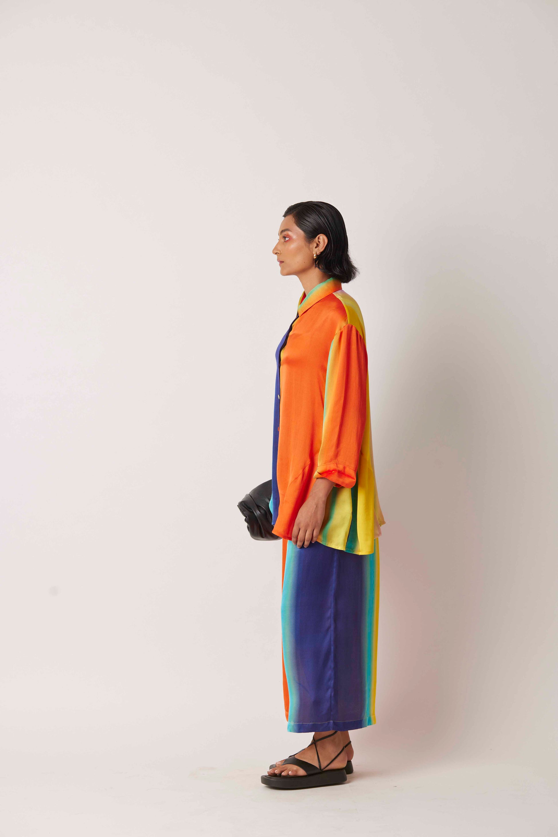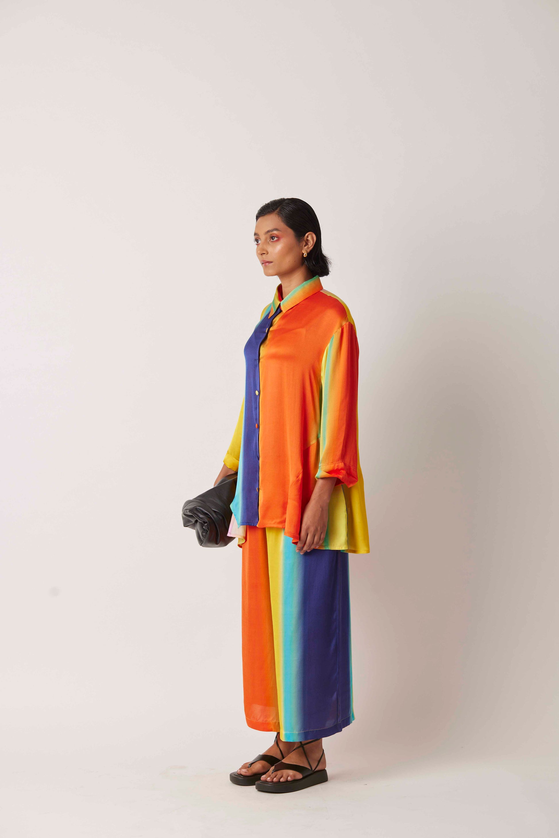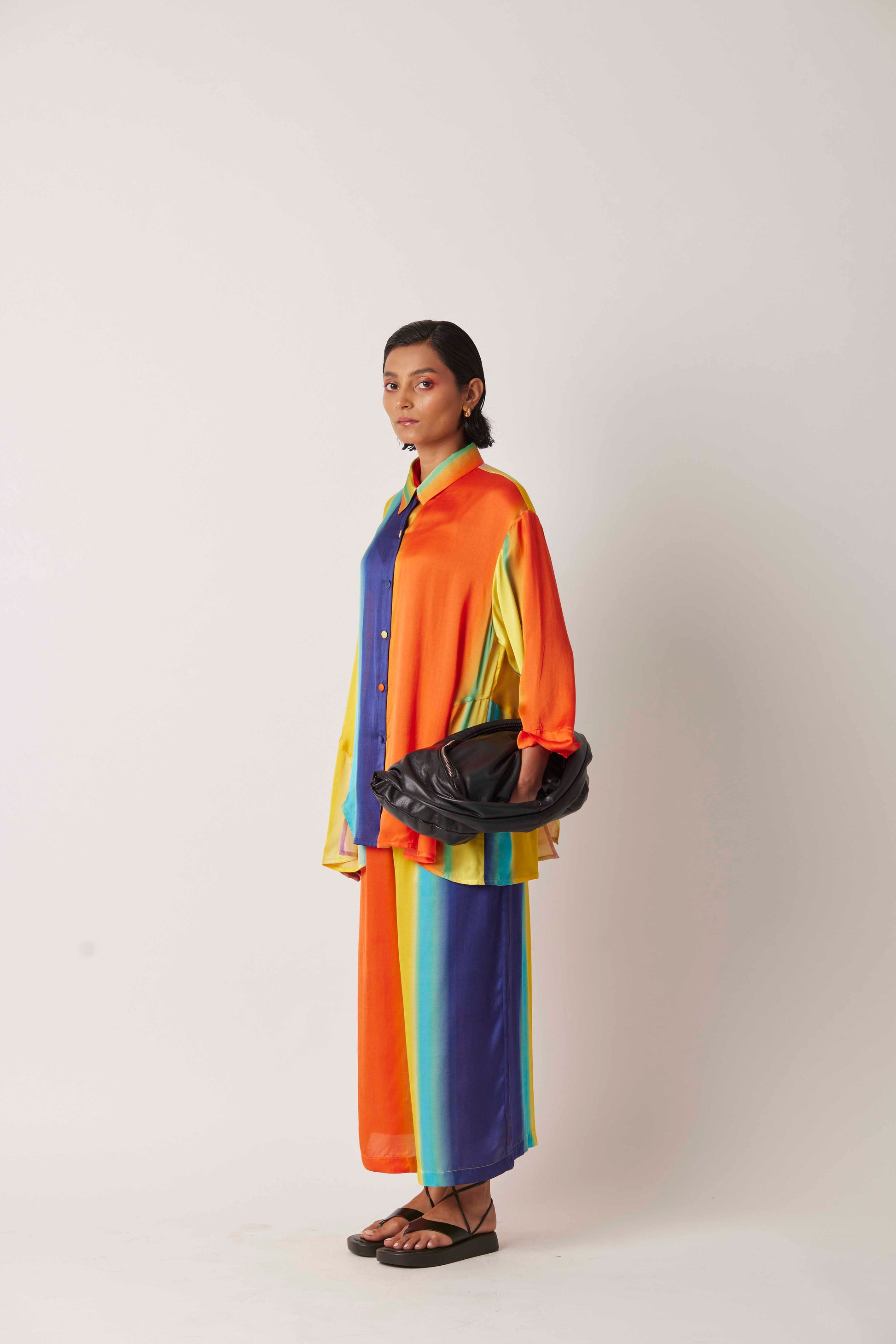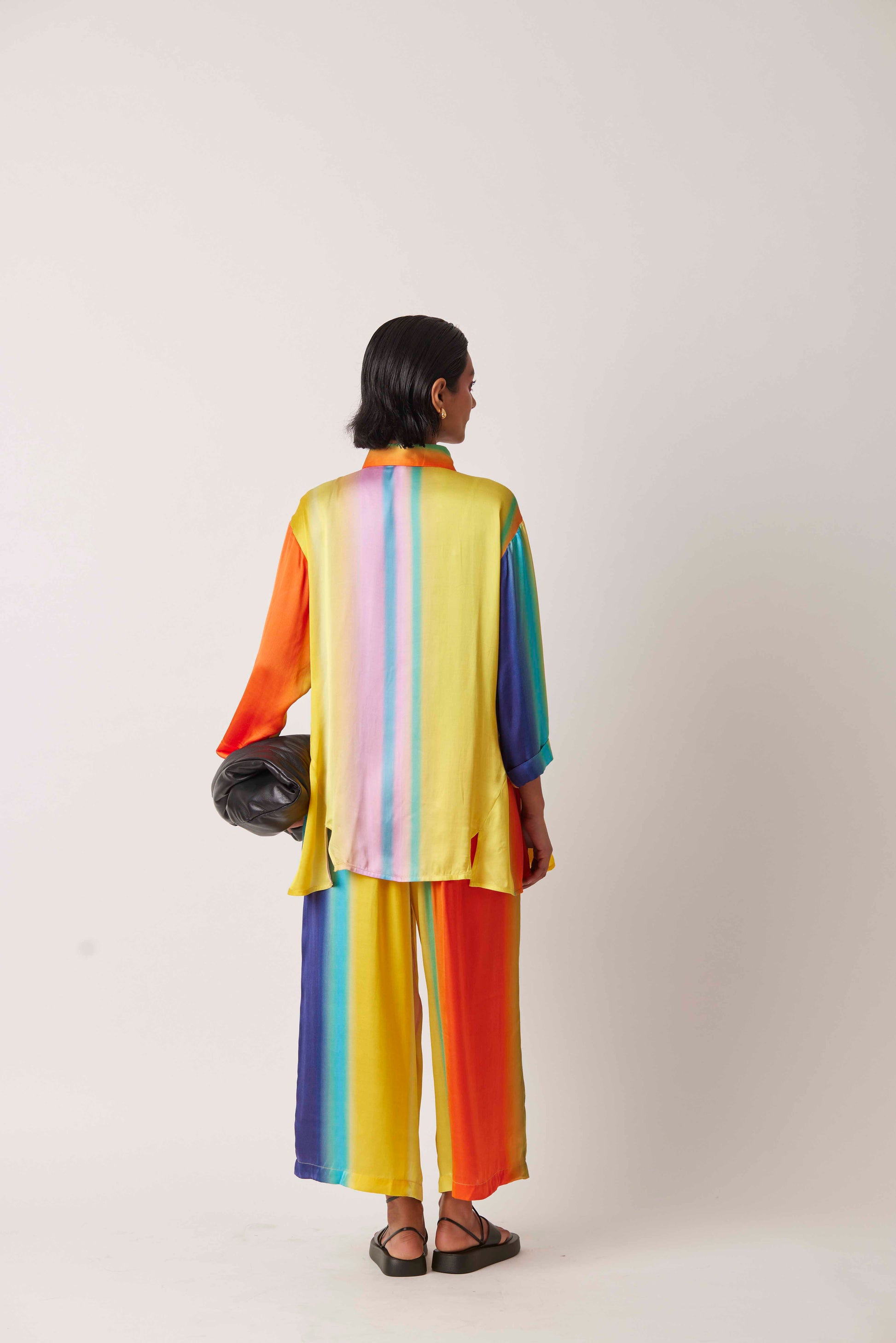 Asymmetrical side panel collared shirt with a soft spectrum of captivating colors, one merging into another in yavi's HAZY STRIPE story.