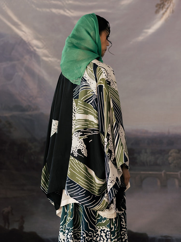 Engineered print jacket with broad sleevs and shantoon block printed lining