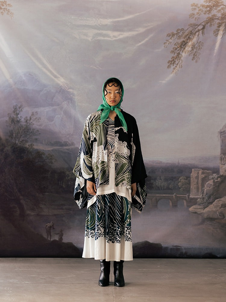 Hakusai Engineered Print V-Neck Top, crafted in luxurious silk for a touch of elegance. Featuring side pockets for added functionality, this top is both stylish and practical.