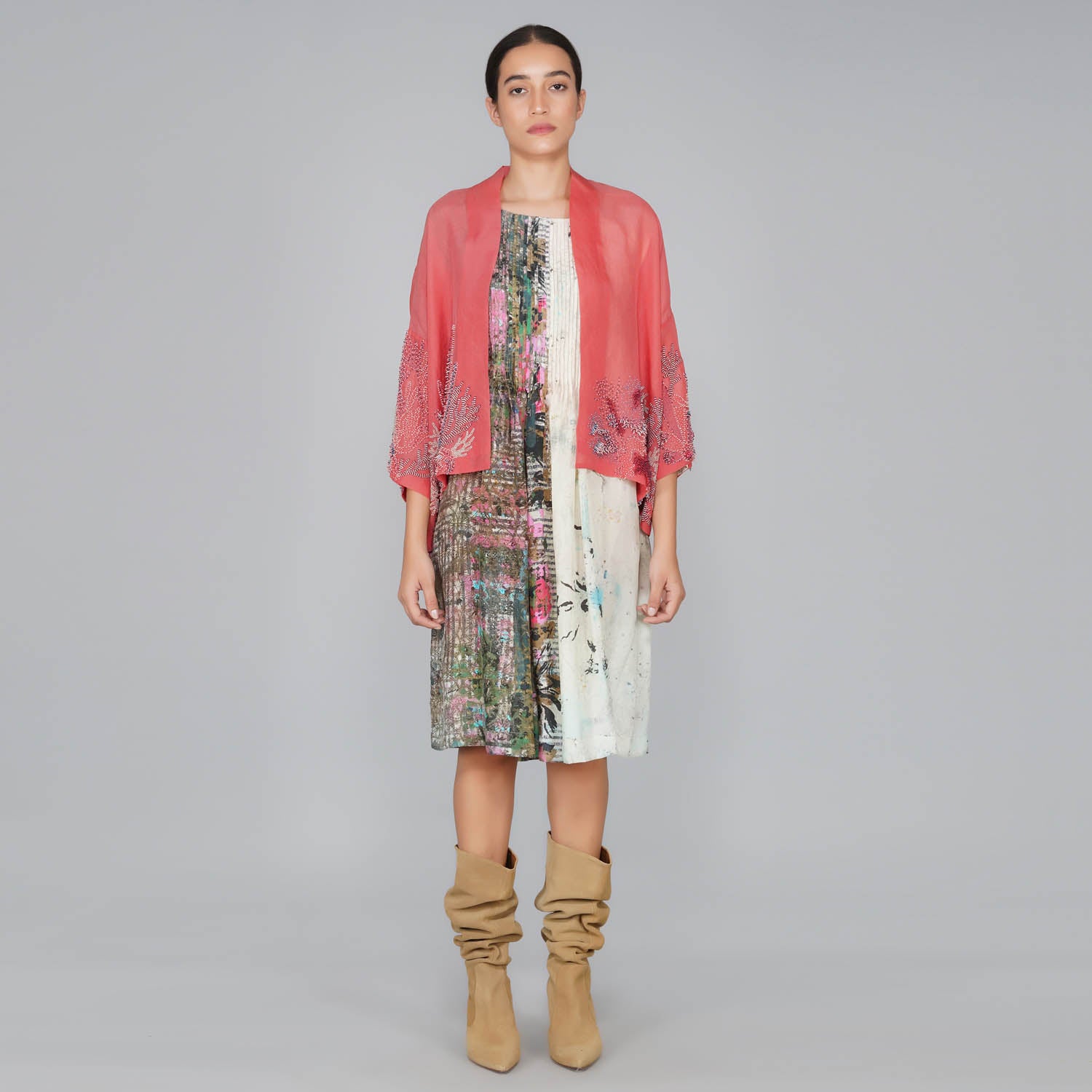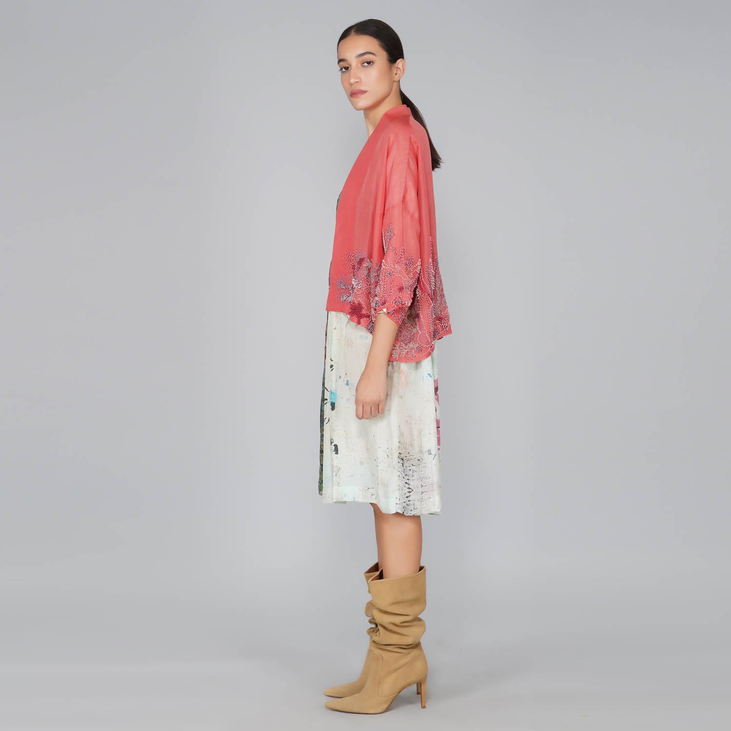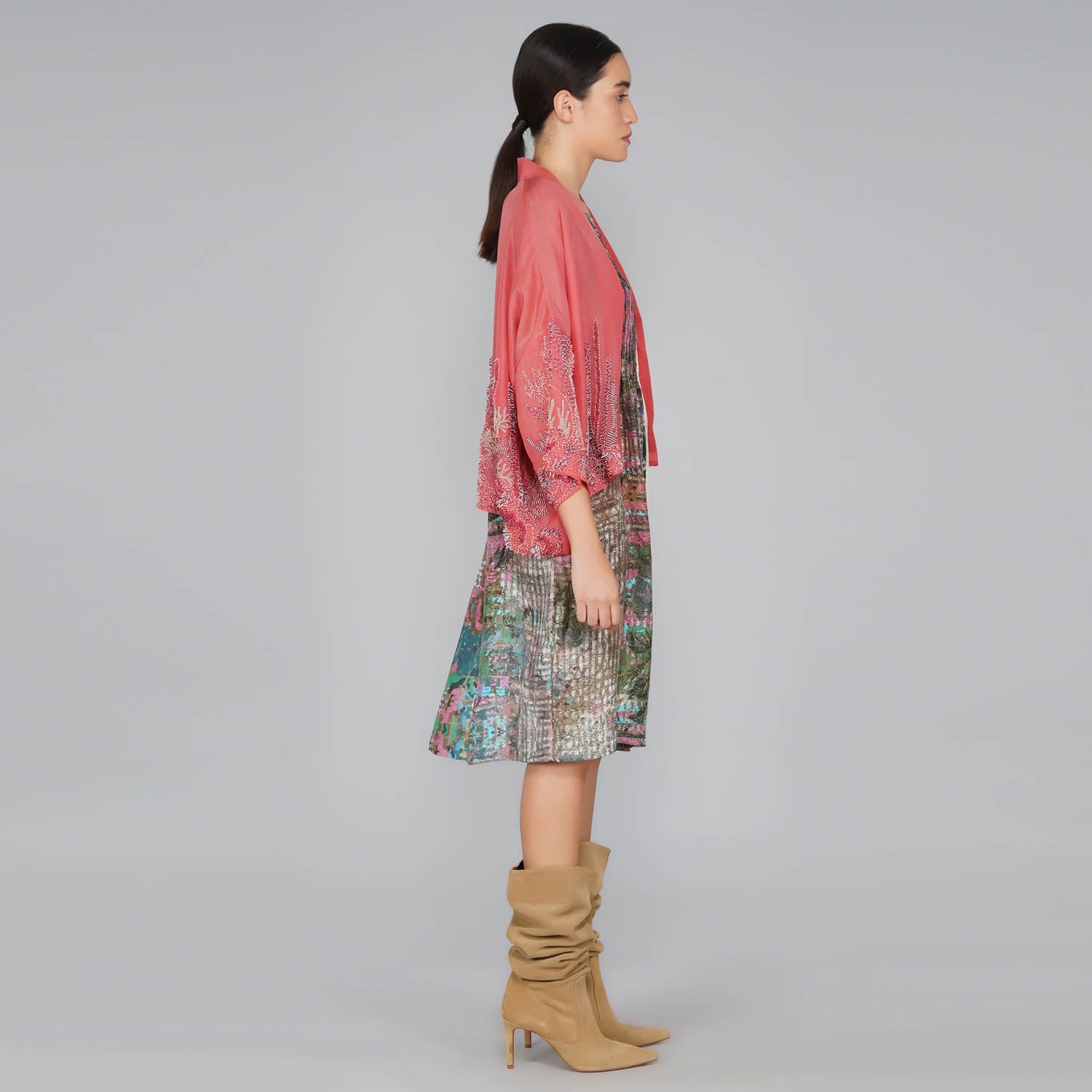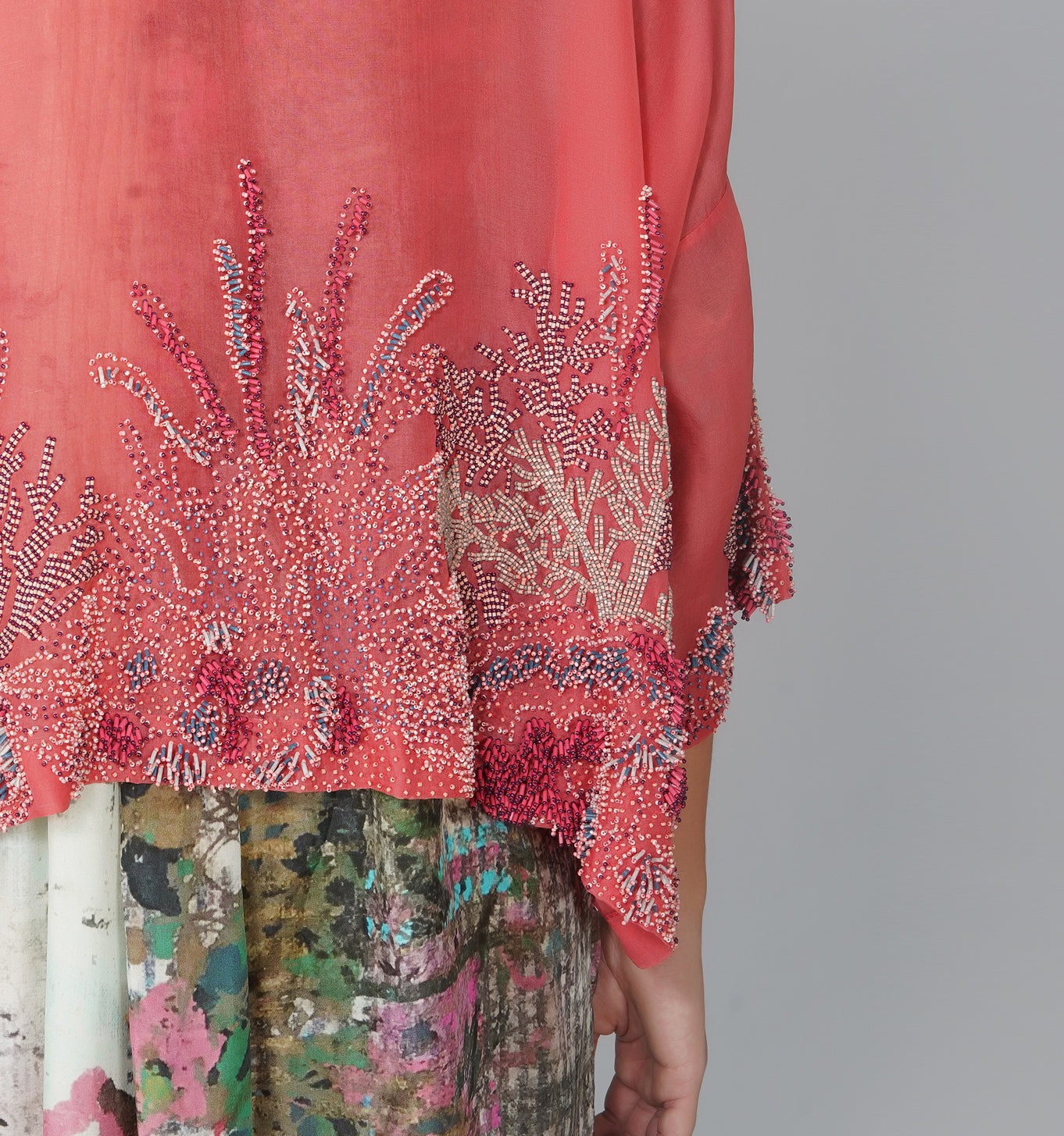 - Coral beaded silk organza kimono jacket