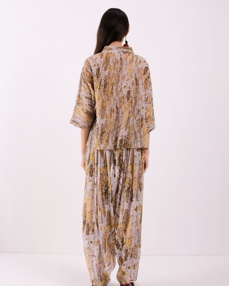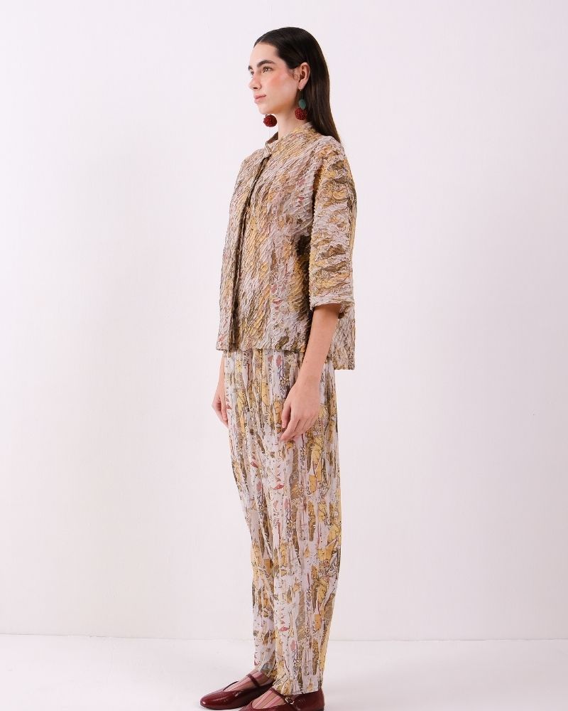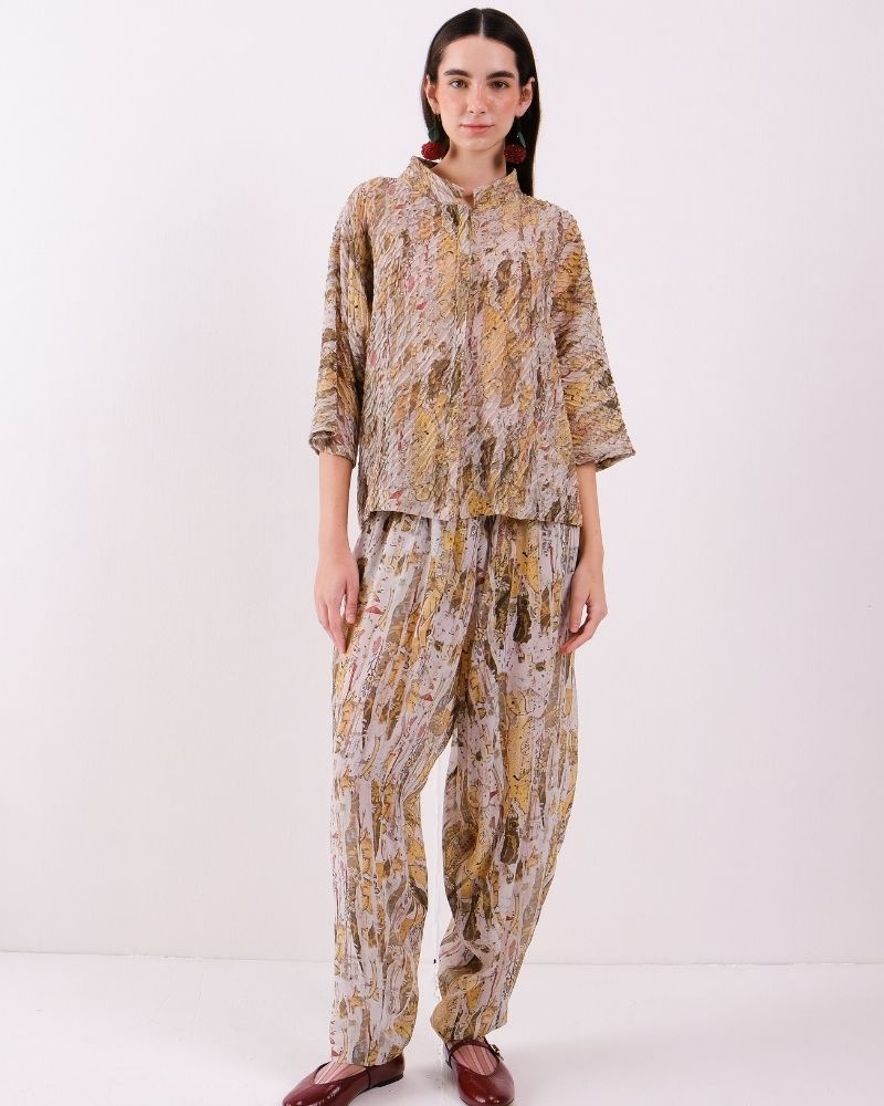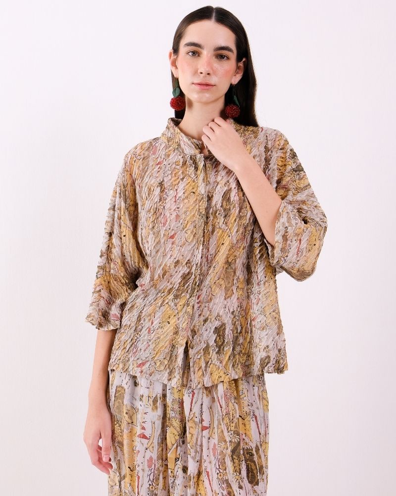 A relaxed, A-line top with a mandarin collar and three-quarter sleeves, crafted in a lightweight, fluid fabric with a soft textured finish. The Atelier Collage print tells a story of an artist’s studio, featuring layered abstract brush strokes and torn-paper effects in warm earthy tones, creating a modern, handcrafted feel. Shirt is sold as a separate.