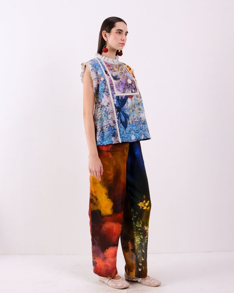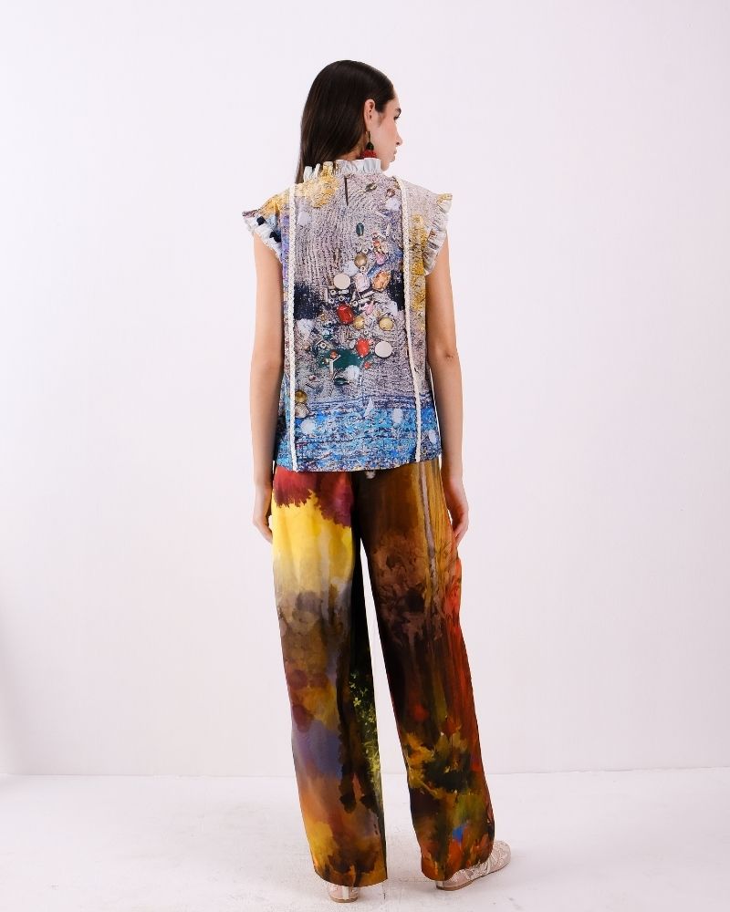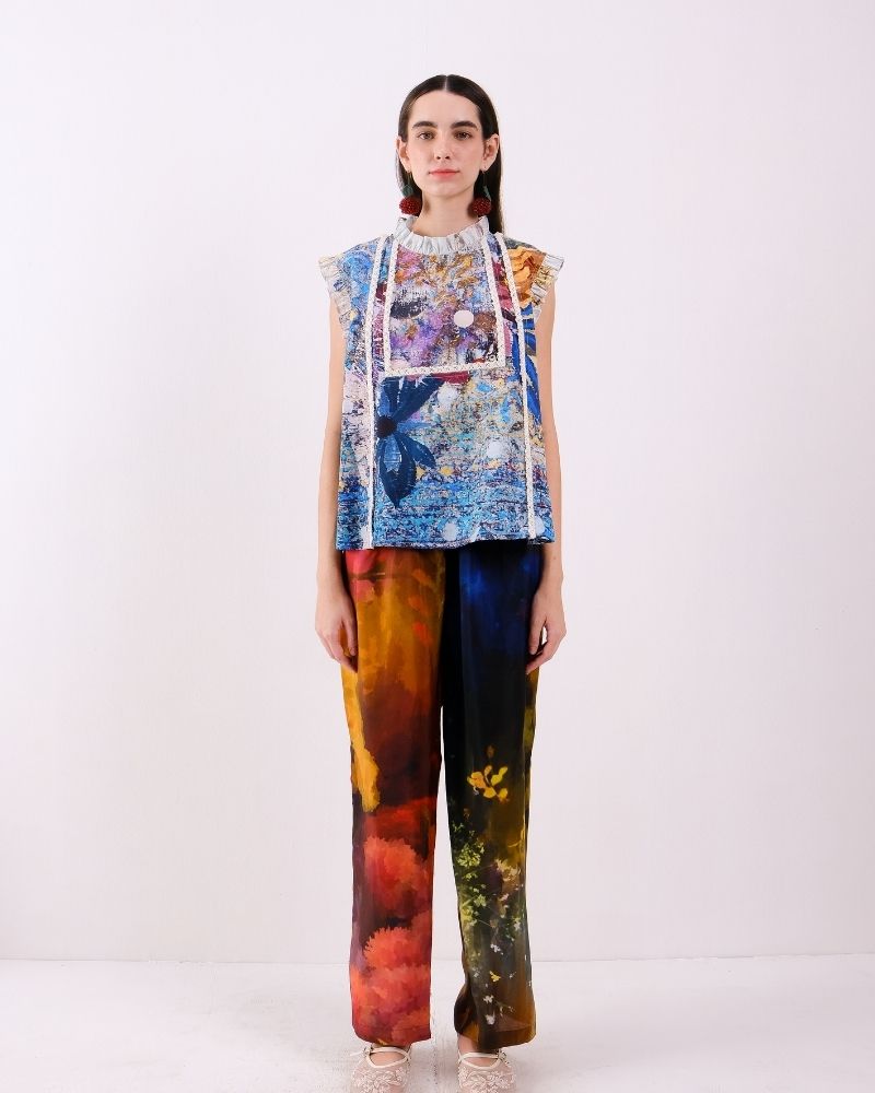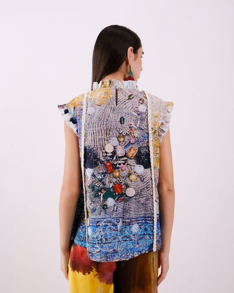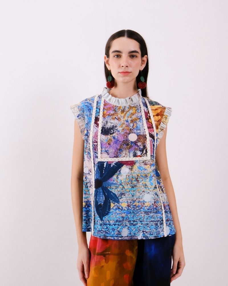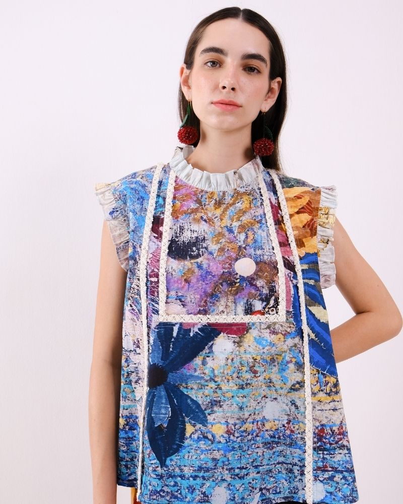 Impressionist reinvented top with ruffled neckline and sleeves, accentuated with lace detail in Poplin.