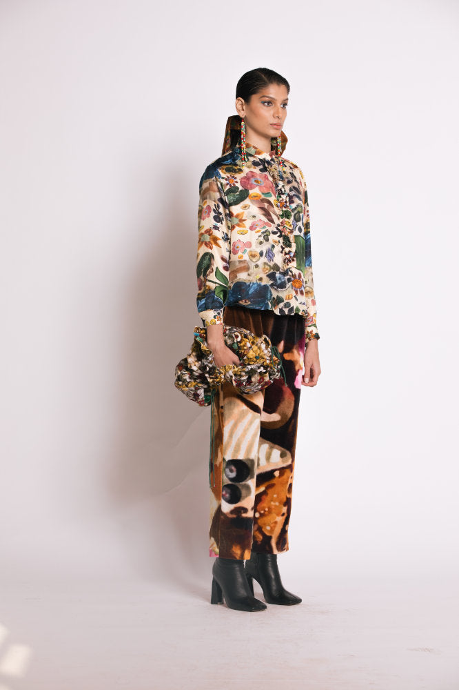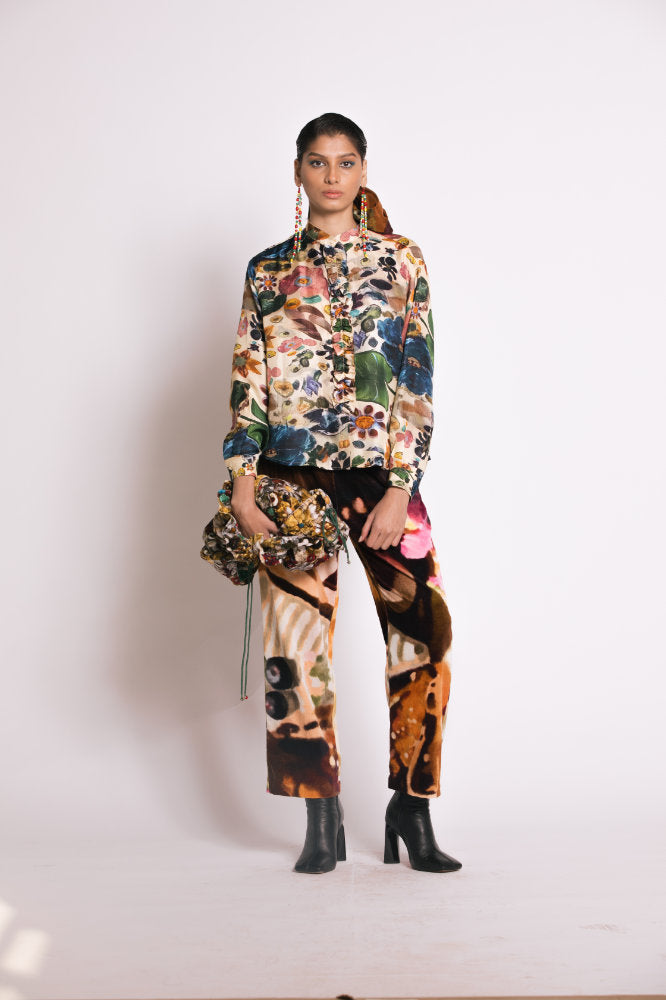 Ai art Full sleeve shirt with hidden placket and frills as a detailing Shell Fabric- Silk Soft hand feel Top is sold as separate Comfortable fit Print placement may vary piece to piece SHIPPING & DELIVERY Shipped in 10 DAYS CARE DRY CLEAN