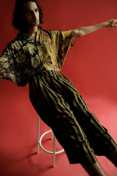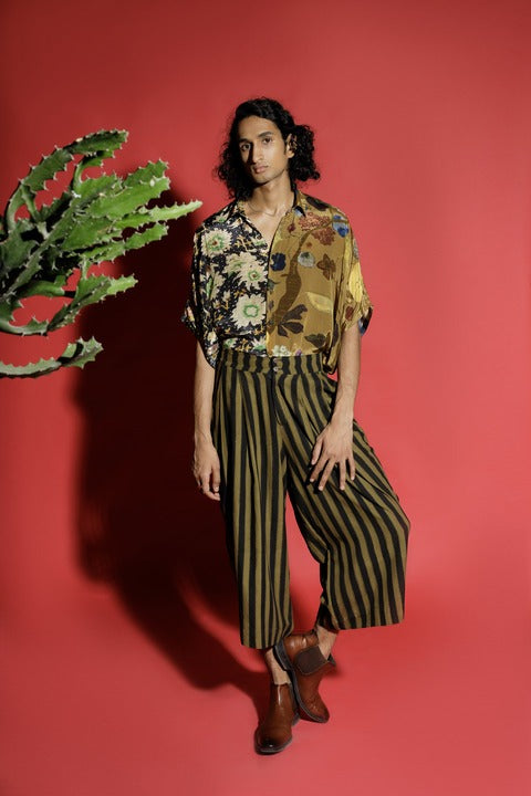 Yavi's impressionist story printed on a relaxed shirt with fabric buttons and pocket in front combining two different prints together.