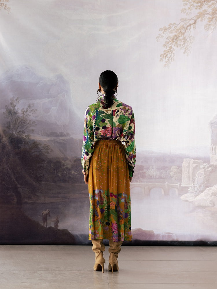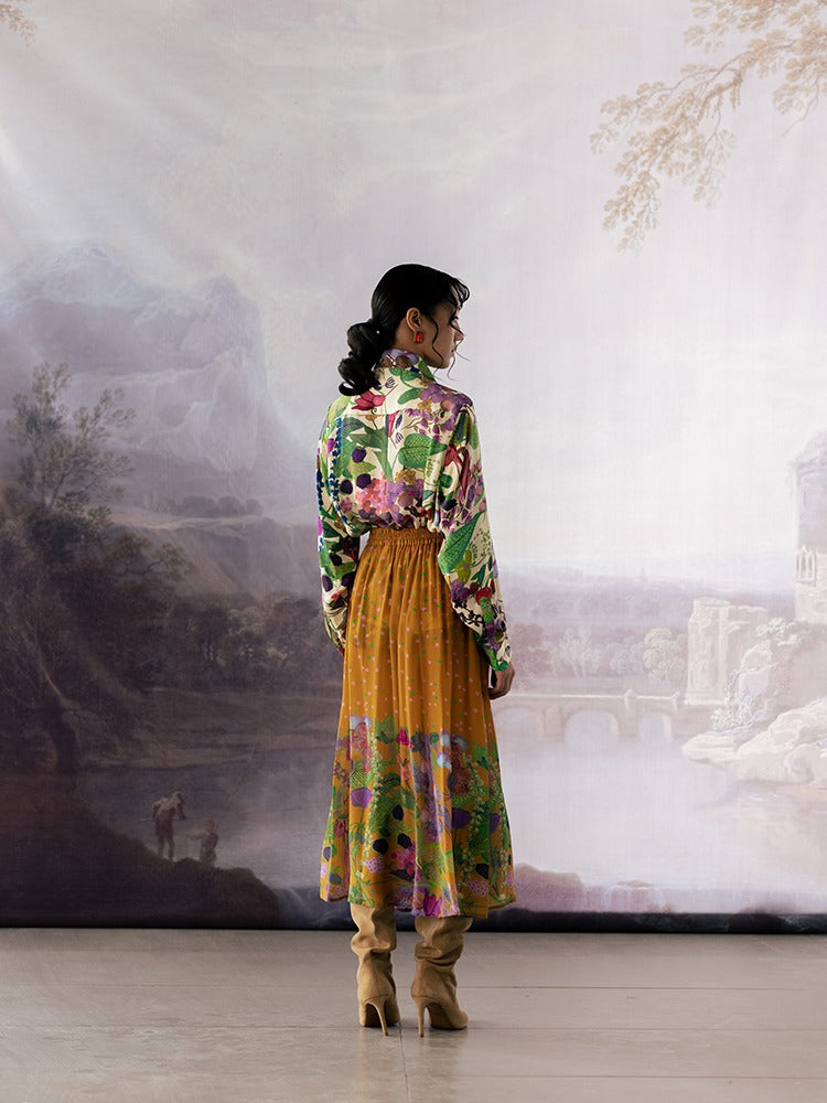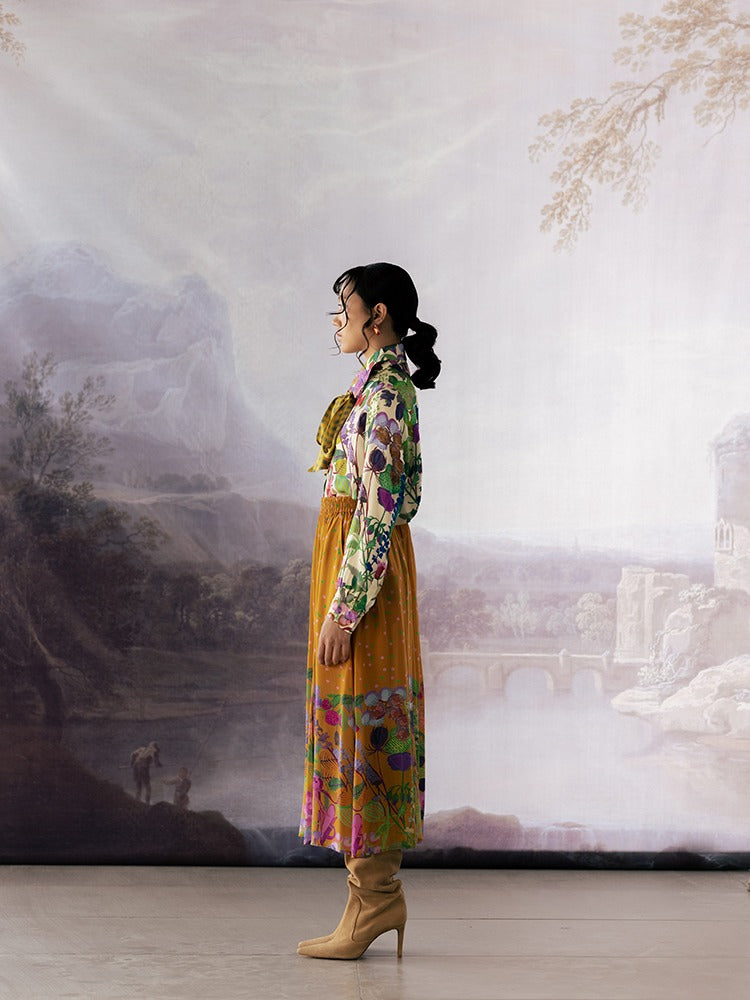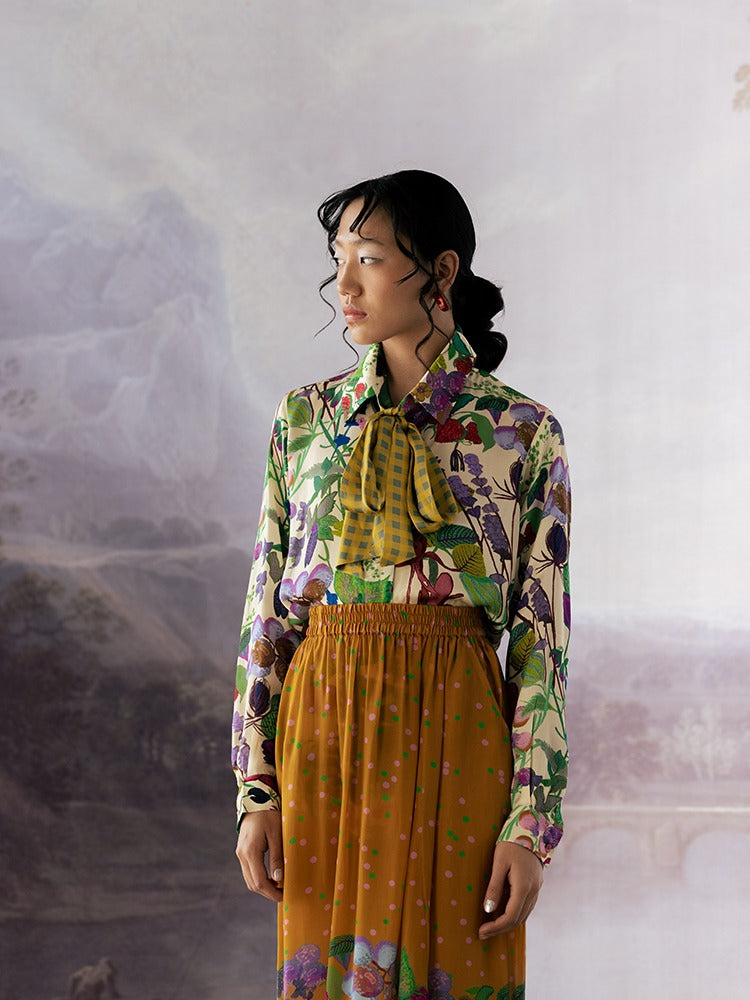 Printed Shirt crafted in 100% silk, featuring charming bow tie in check detailing at the collar, inspired by Yavi's Kitchen Garden Story. This elegant piece combines luxurious silk with delightful kitchen garden motifs, creating a timeless and sophisticated look.