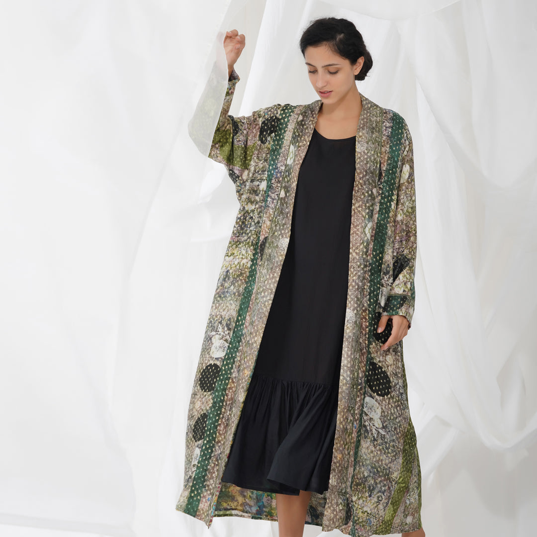 The Fae reversible silk jacket sports two distinct abstract Impressionist prints; a rich assortment of greens and geometric shapes reminiscent of a summer evening, paired with a joyous bouquet of spring colour.