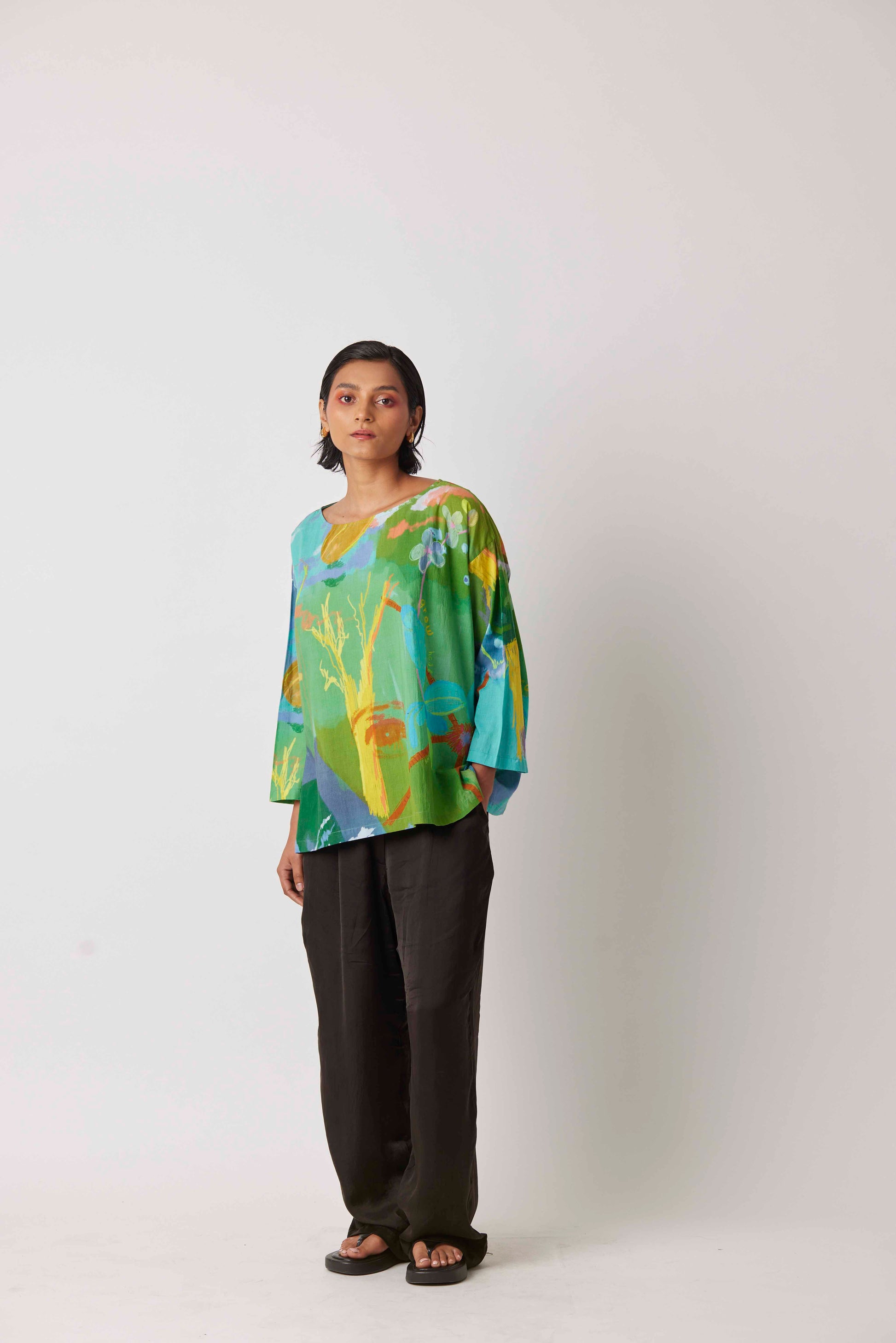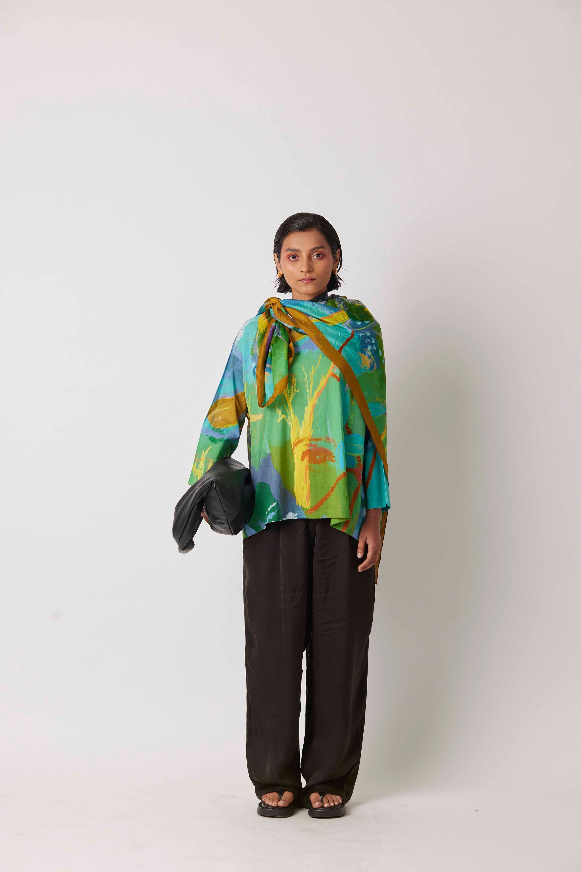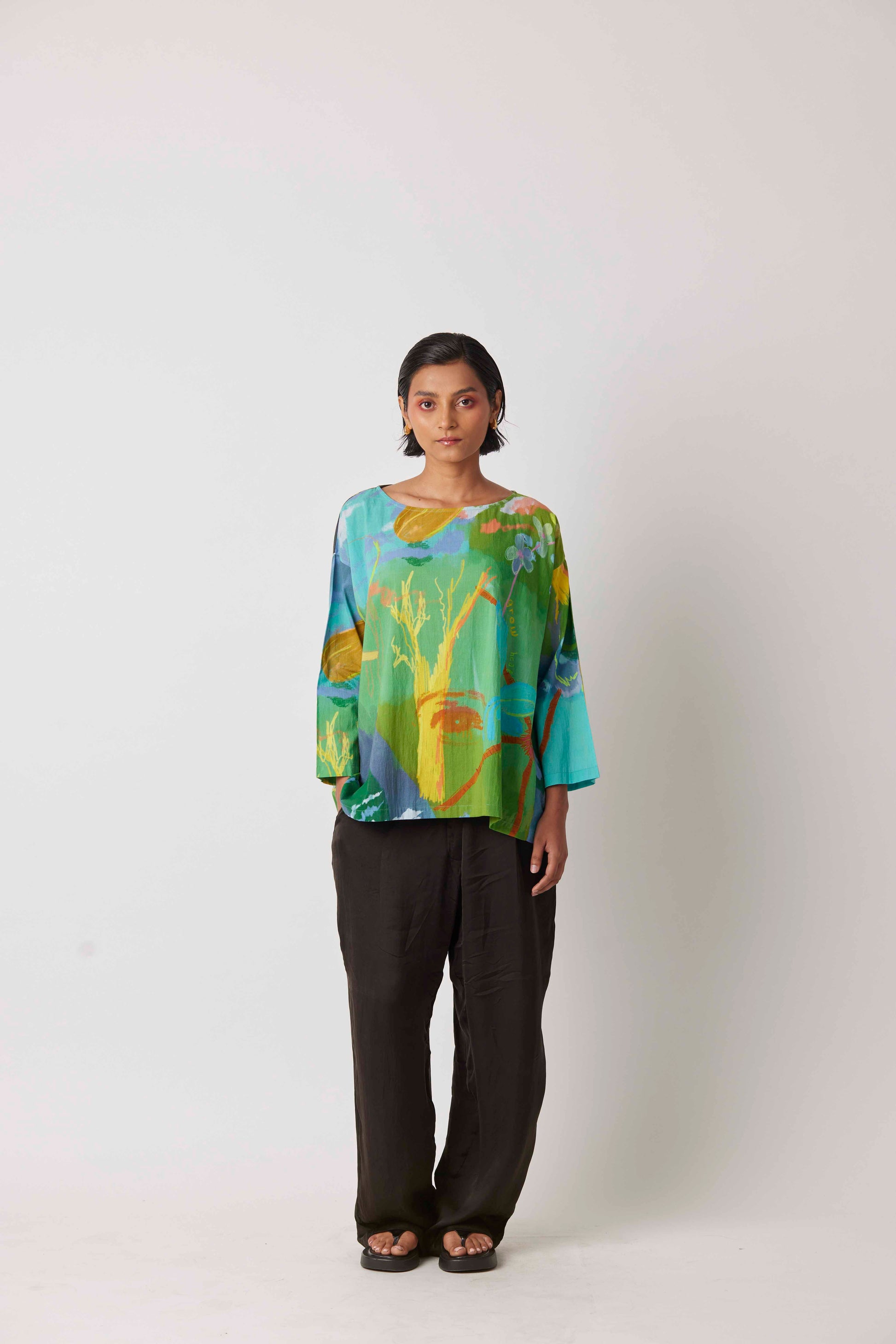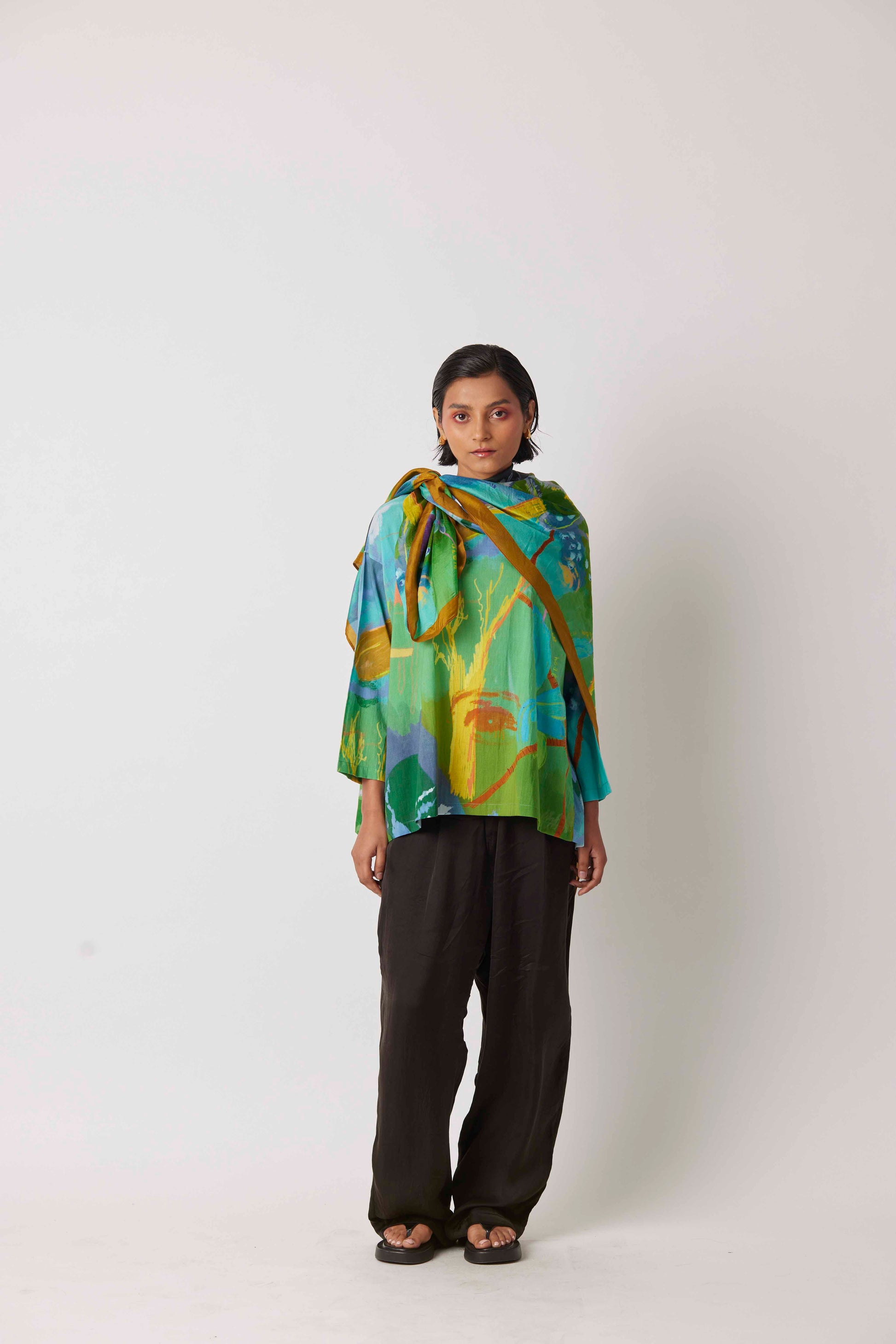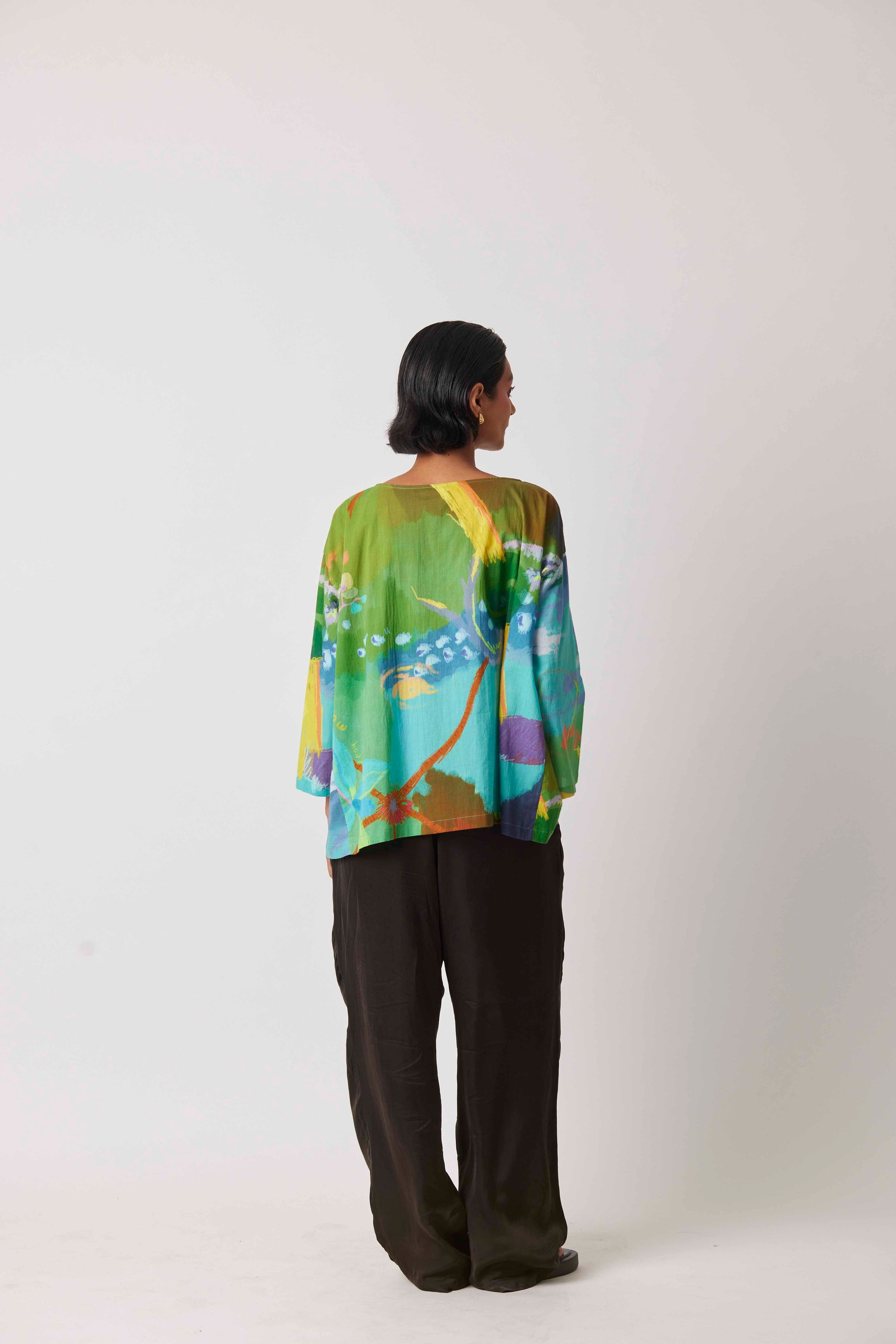There's a lot to take and lot to give in life depicted by the UNWILLTED story digitally printed on yavi's signature anaconda top in teal green hues.