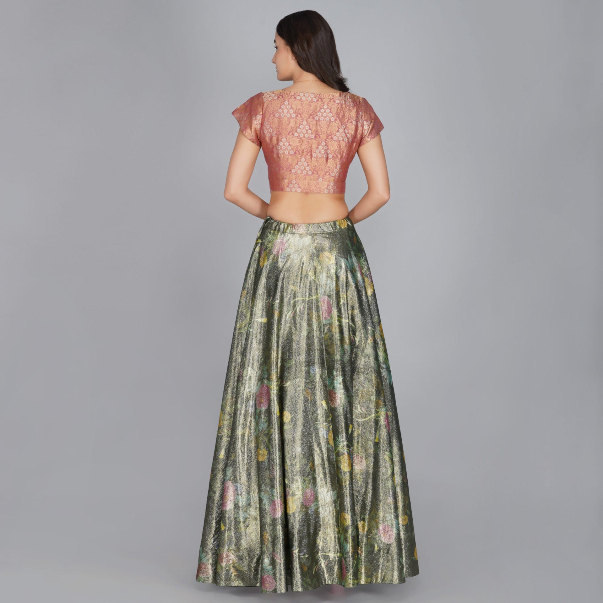 Blending the beauty of elegant florals with the alluring glitter and the breathtaking smooth drapes creates this timeless piece . Adding on the luxury are handcrafted beads latkan details .