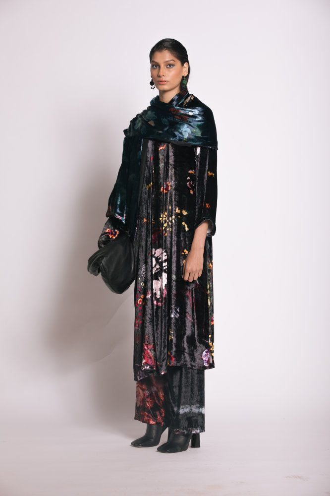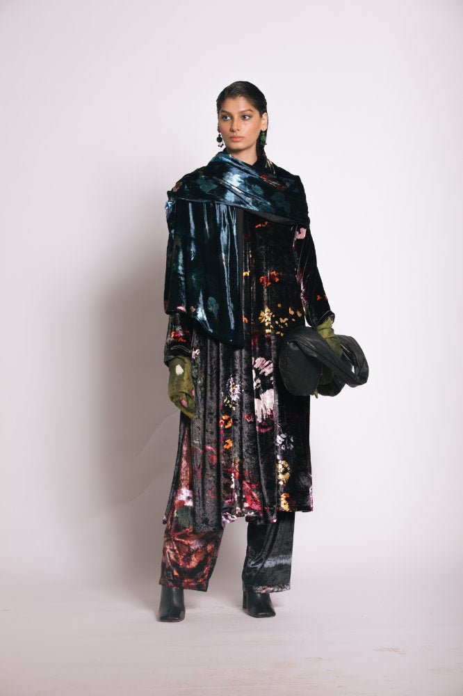 Vintage Long kimono jacket with contrasting black printed lining Shell Fabric- SILK VELVET Soft hand feel Jacket is sold as separate Comfortable fit Pockets on the side SHIPPING & DELIVERY Shipped in 10 DAYS CARE DRY CLEAN
