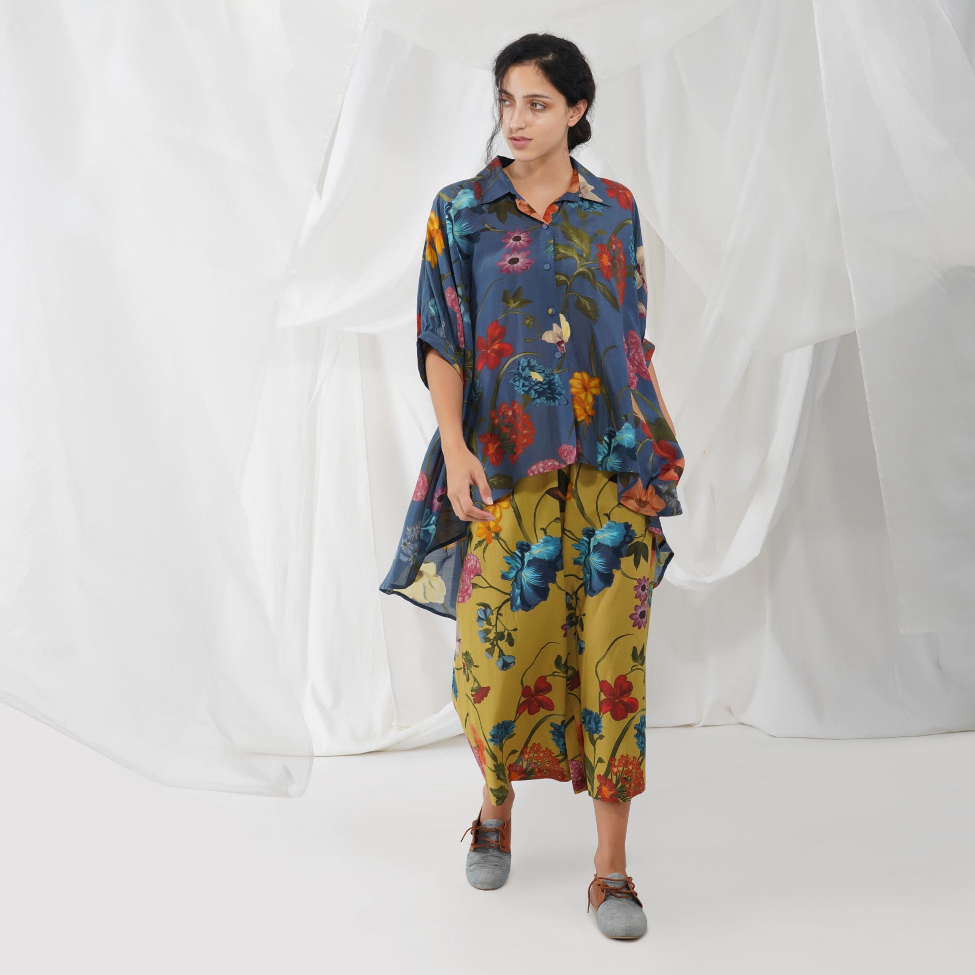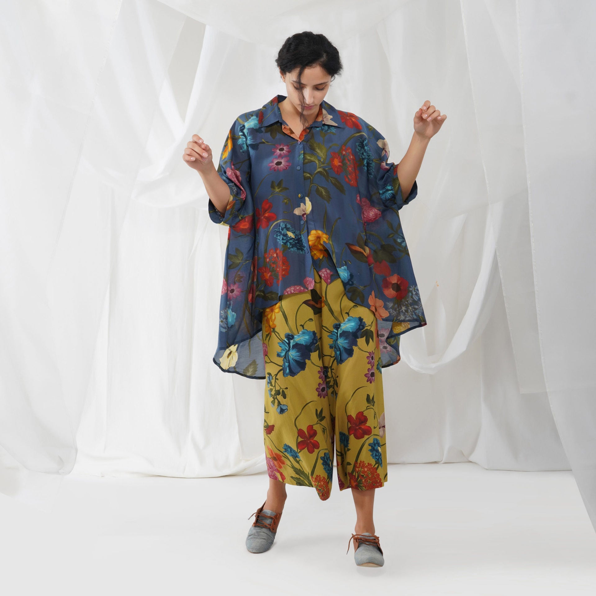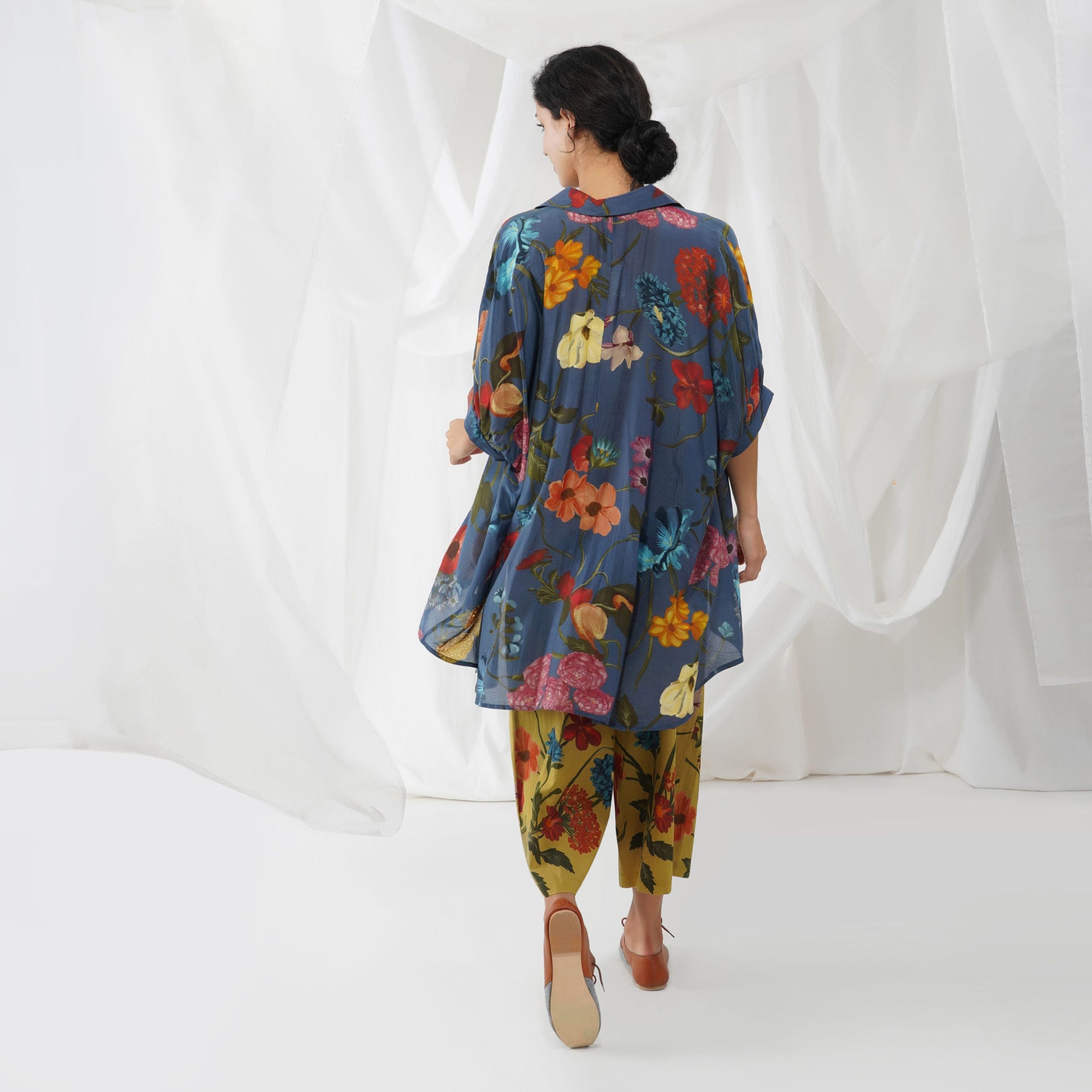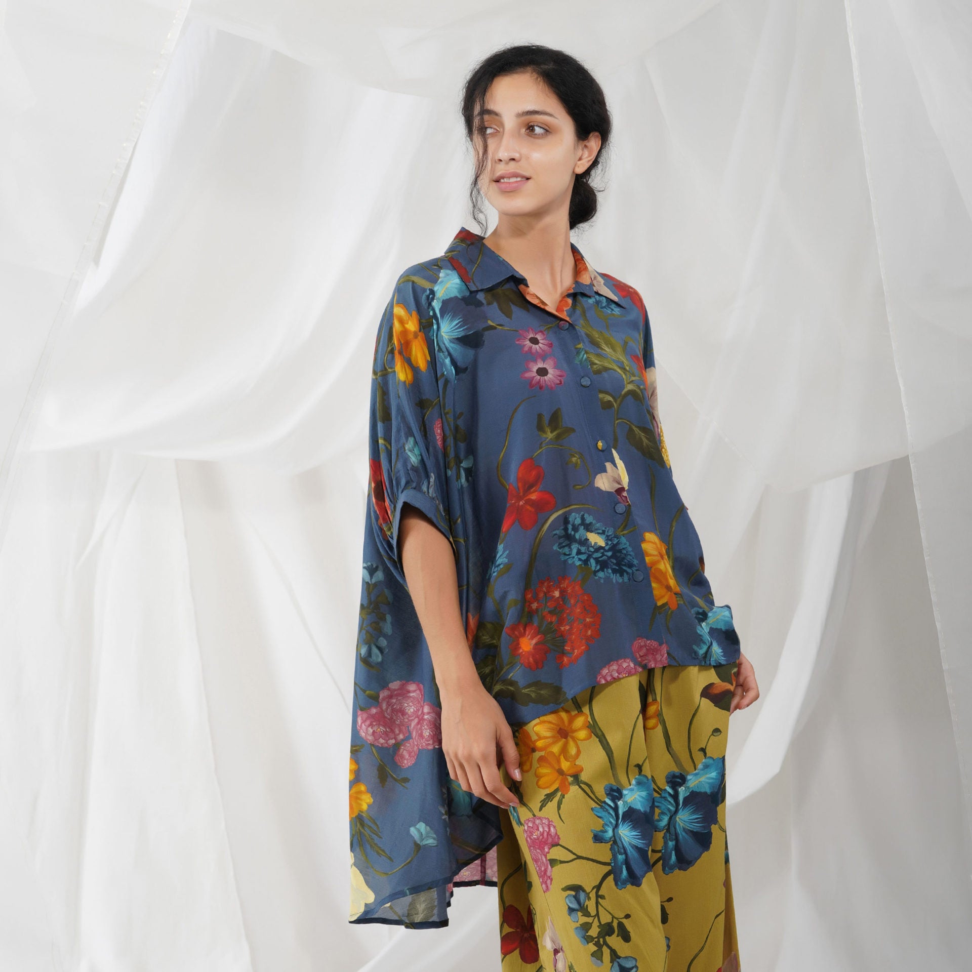 The Hana floral printed flared button down shirt in royal blue is a contemporary take on a spring classic.