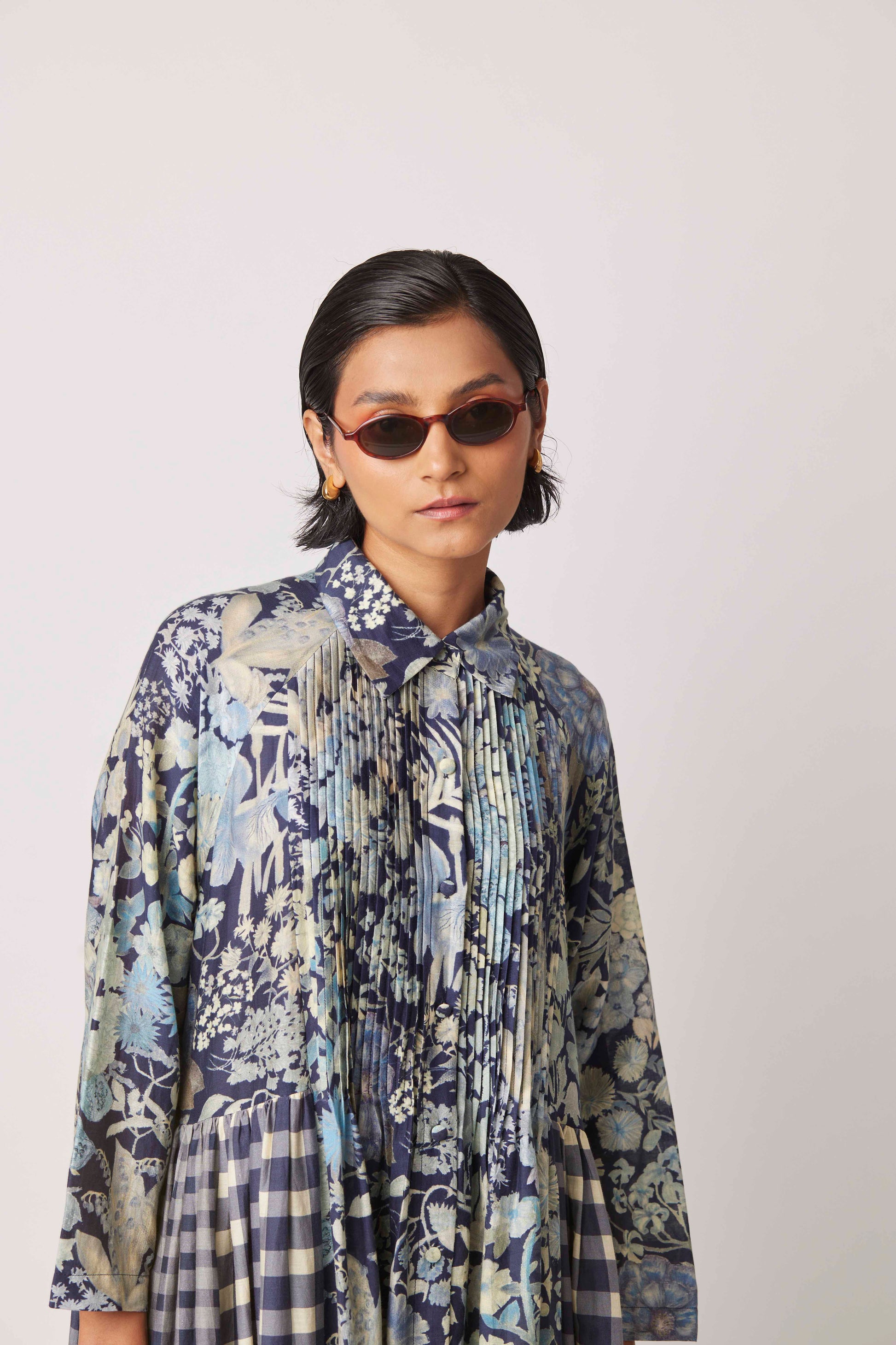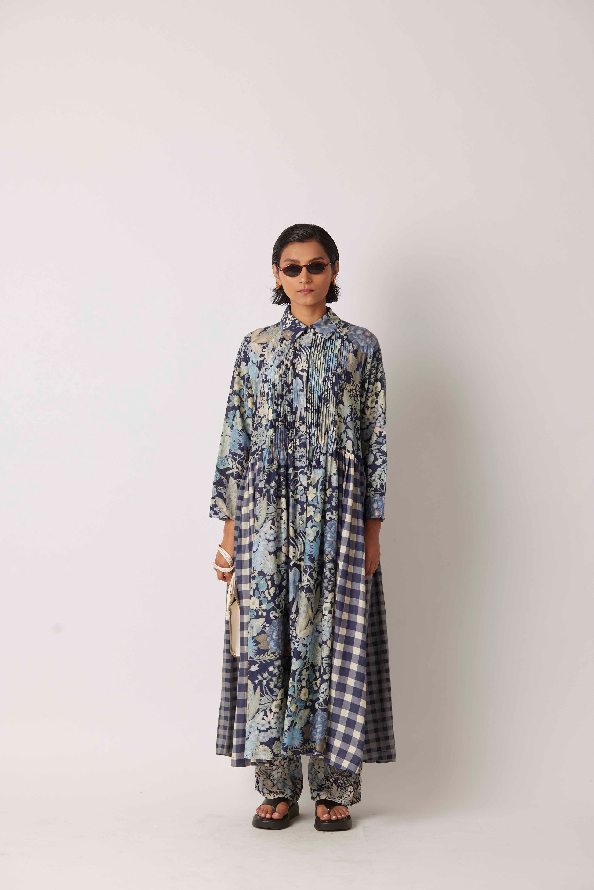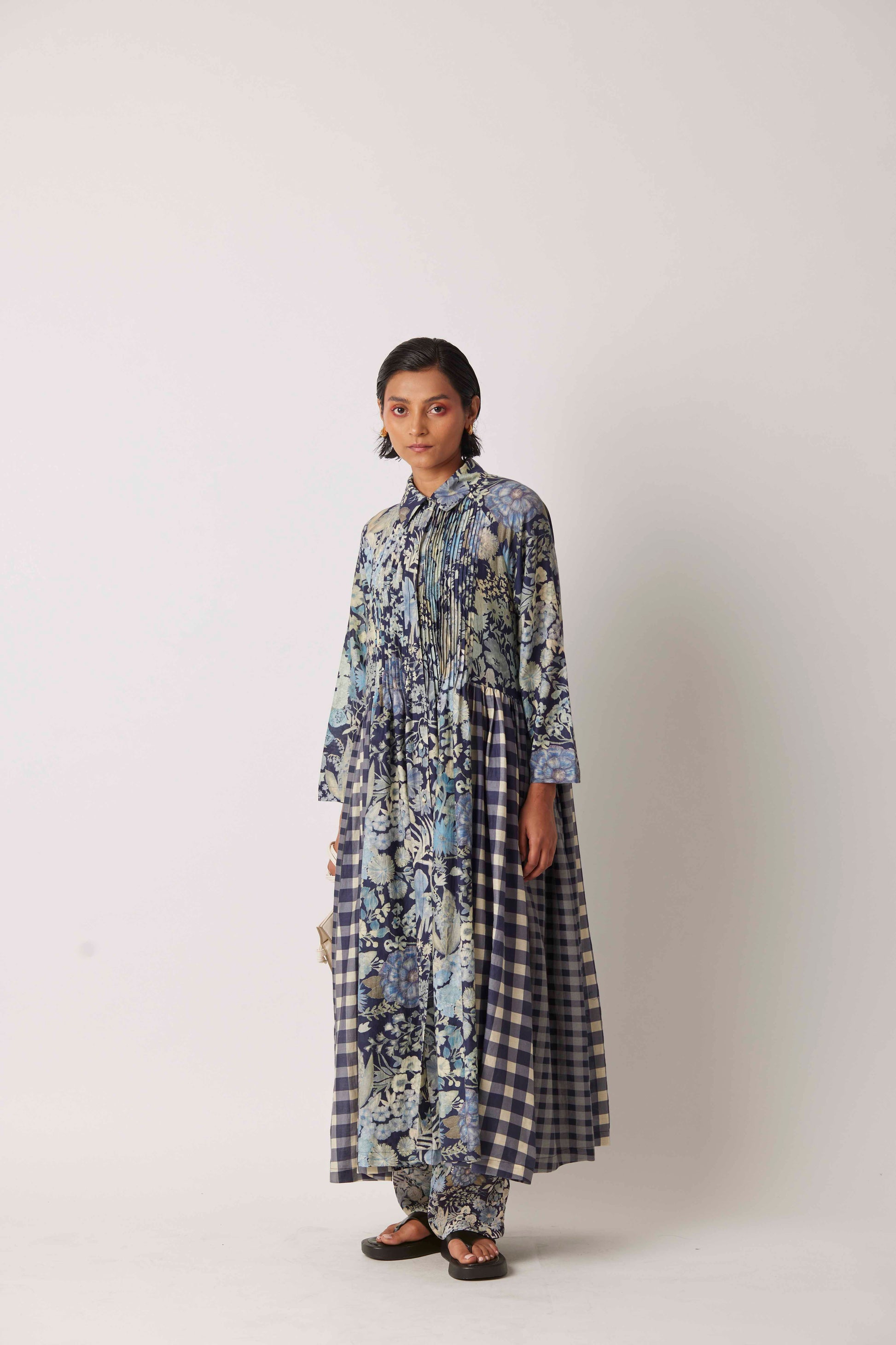 Combination of florals and checks in a long dress with side gathers in a monochromatic indigo color story inspired from kashmir's native flora illustrated with chalks.