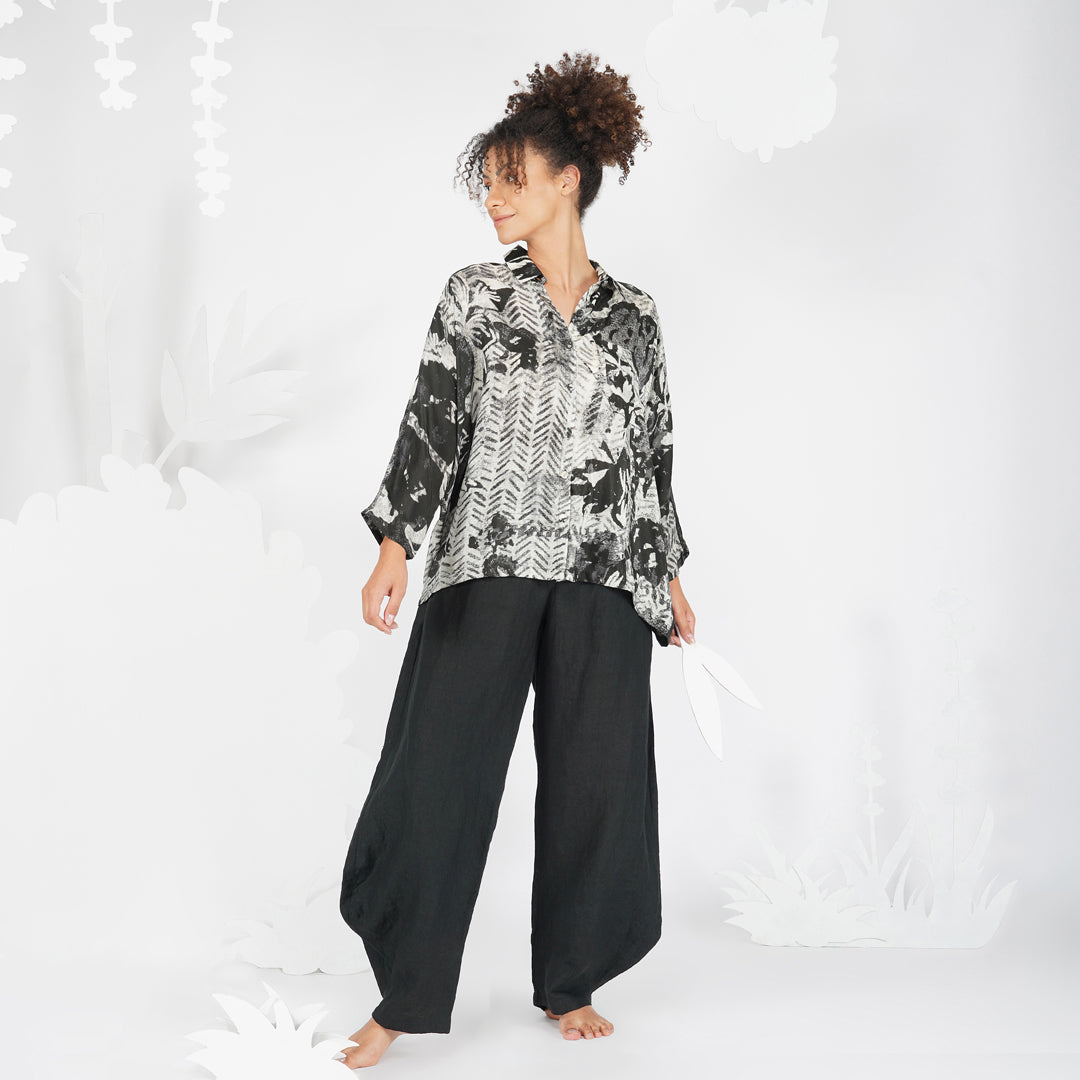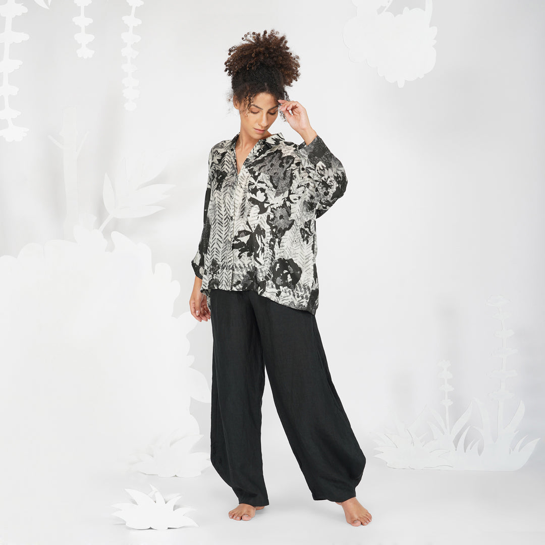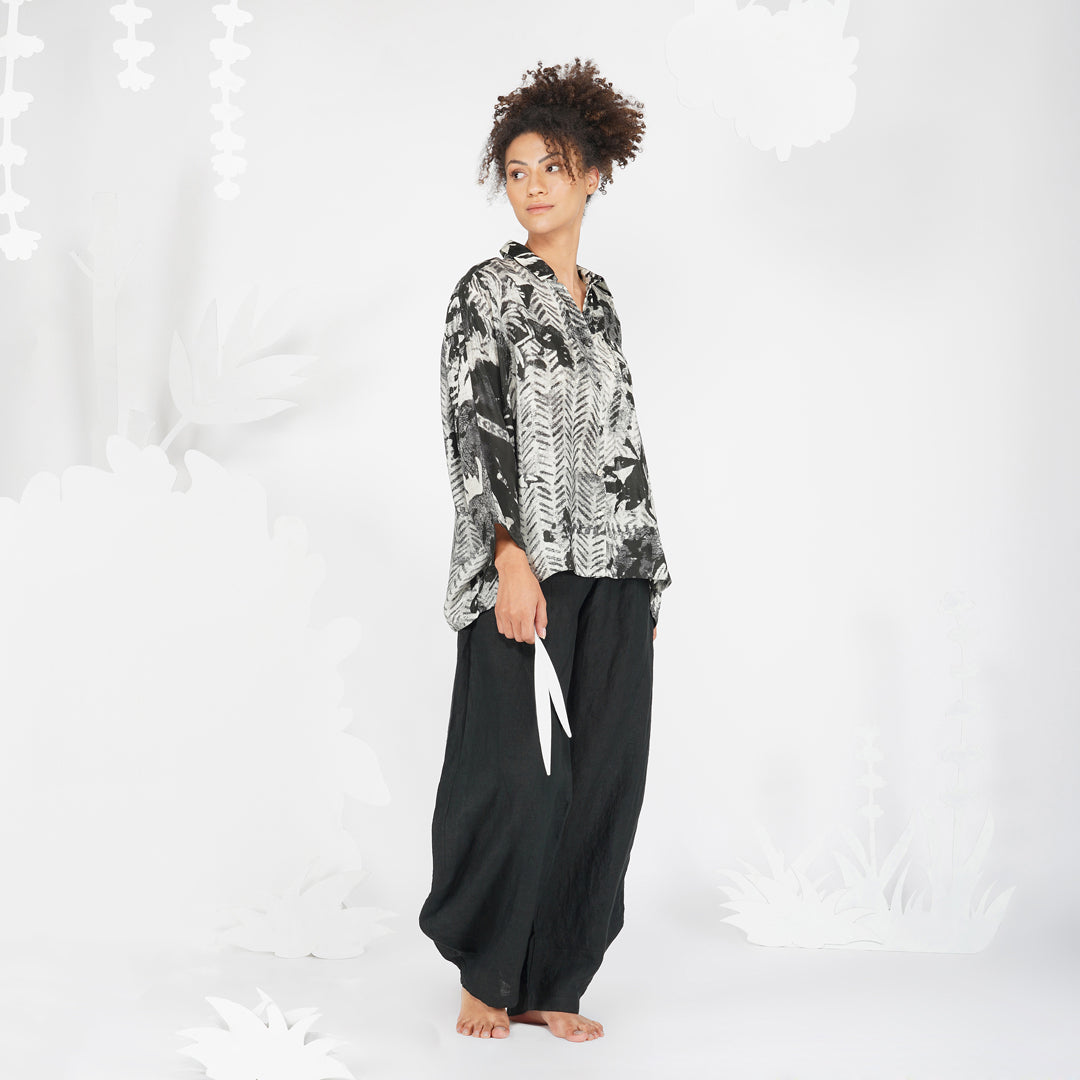 Impressionist print in monochrome, bringing attention to important details without the presence of colour, in a classic silhouette of a collared buttoned down shirt. A shirt that can be paired with anything to make a classic yet contemporary outfit.