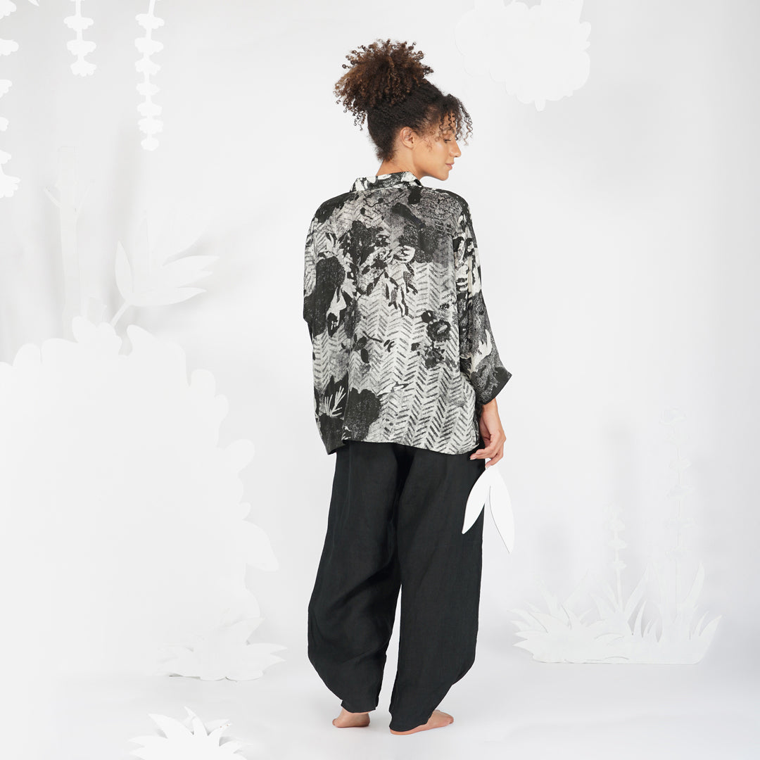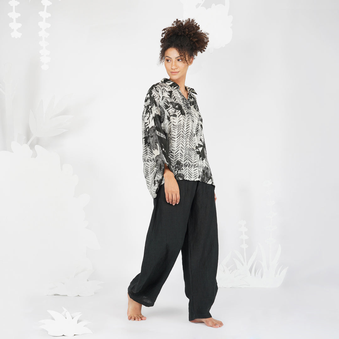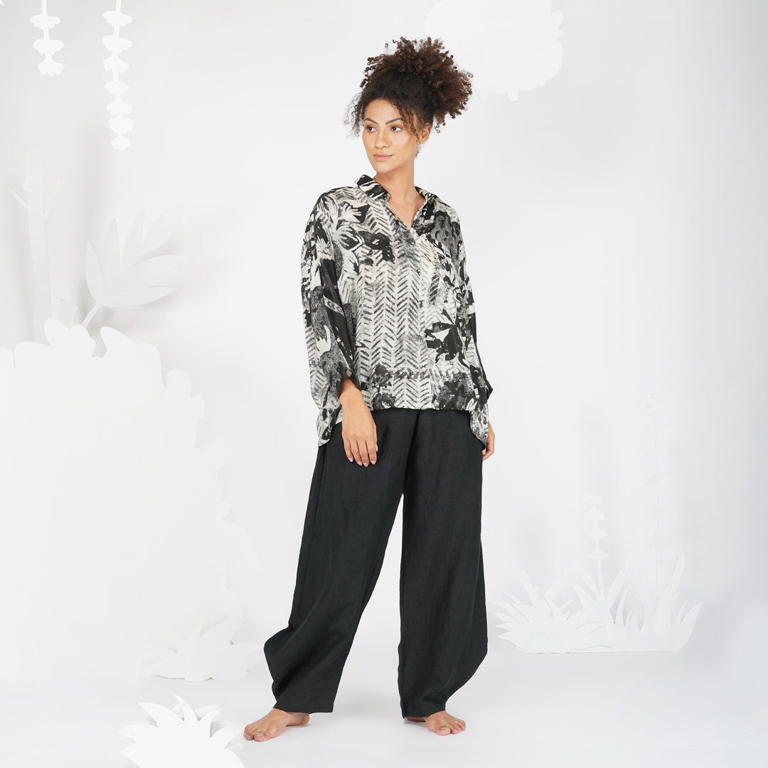 Impressionist print in monochrome, bringing attention to important details without the presence of colour, in a classic silhouette of a collared buttoned down shirt. A shirt that can be paired with anything to make a classic yet contemporary outfit.