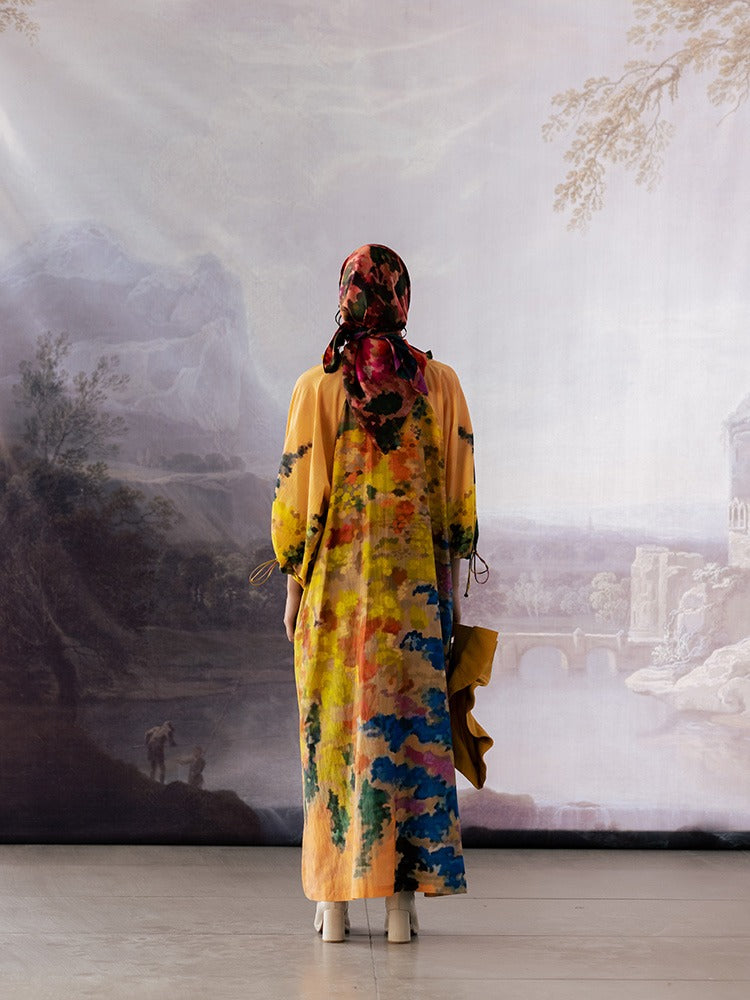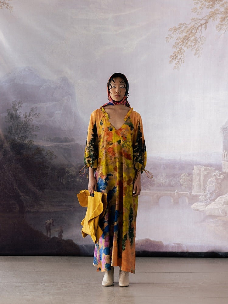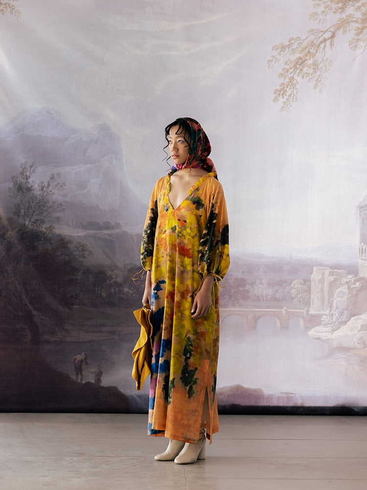 Raglan Sleeves dress, crafted in luxurious cotton silk for a touch of elegance. This dress features charming raglan sleeves and a frill at the neck, adding a playful and feminine touch. With adjustable sleeves and a flattering V-neckline, it offers both style and versatility.