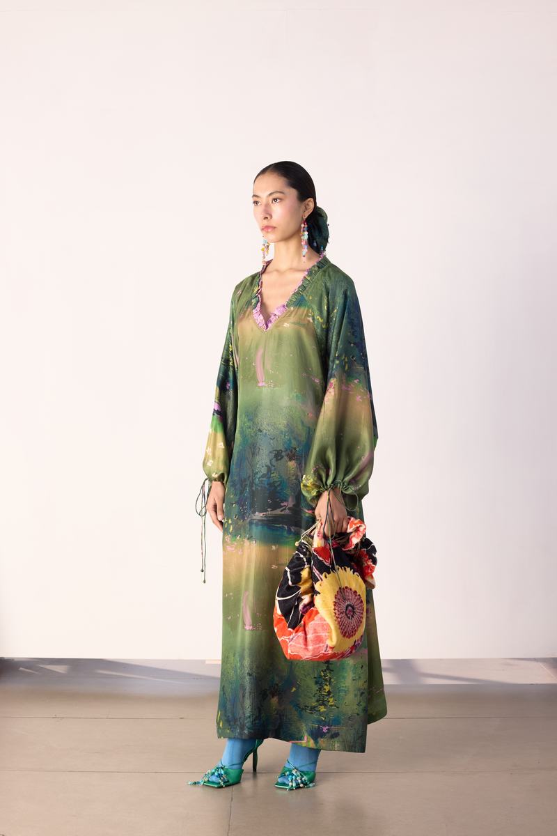 Enchanted woods dress with Ruffled neckline and draw string sleeves in silk twill.