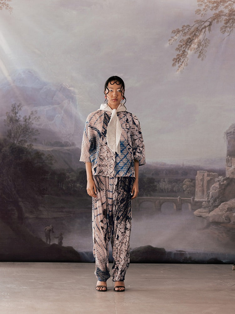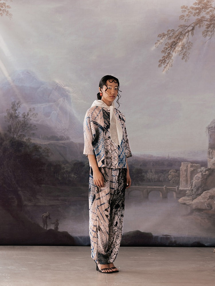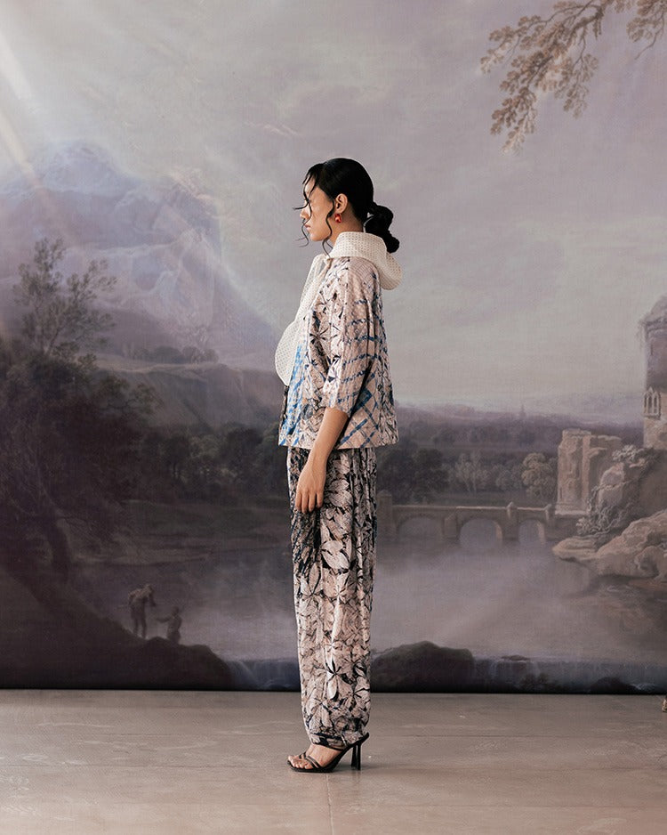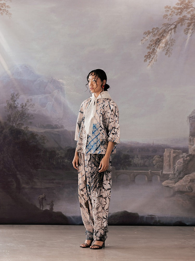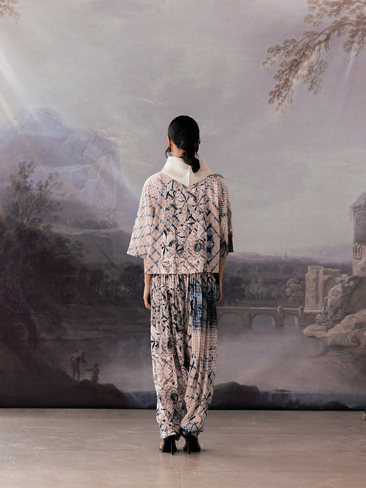 Patchwork Gathered Pants, designed with pockets and an elasticated waistband for comfort and style. Elevate your wardrobe with these statement pants that blend artistry and comfort.