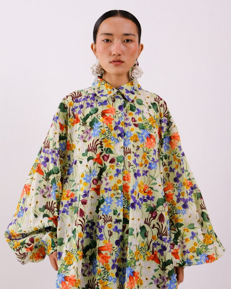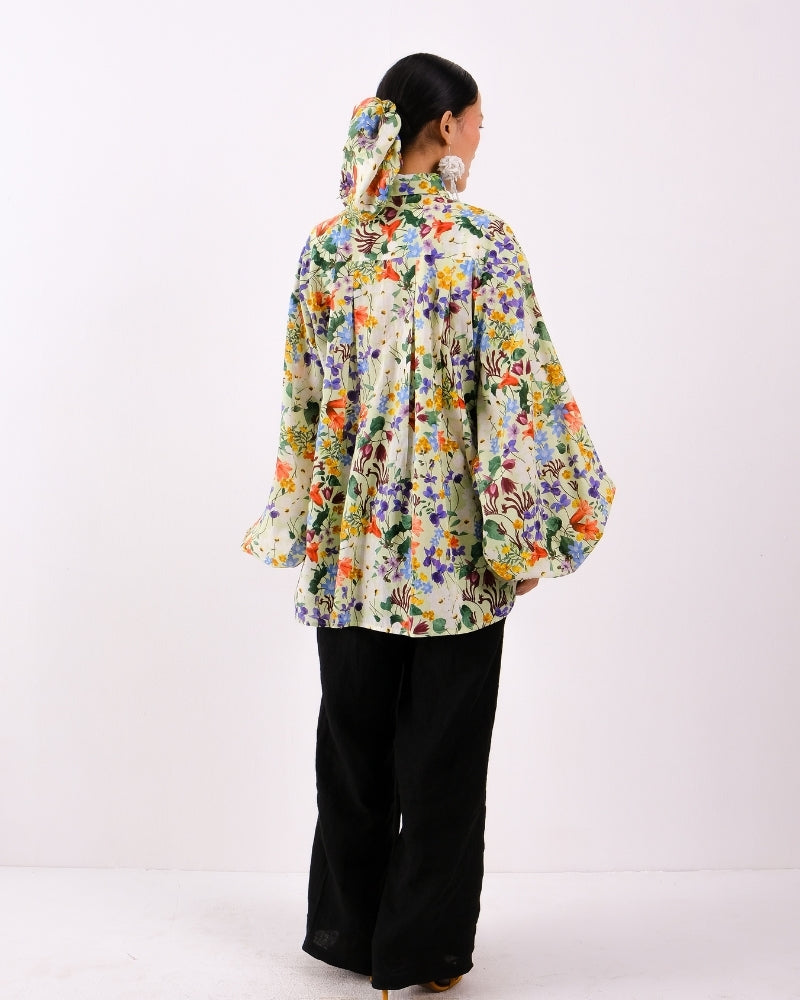 The Garden of Grace button down collared shirt with balloon sleeves with box pleat detail in the back in Cotton Voile.