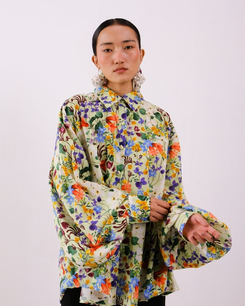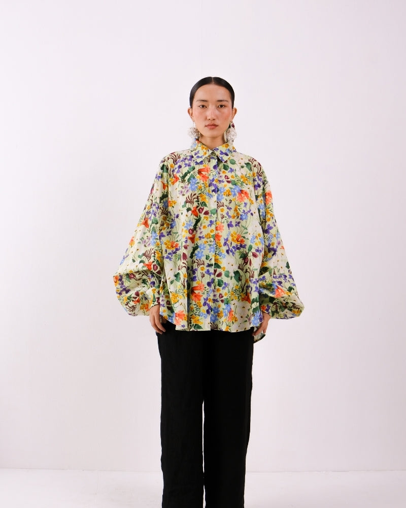 A breezy button-down shirt crafted in soft cotton voile, featuring a classic collar, voluminous balloon sleeves, and subtle box-pleat detailing at the back. Lightweight and airy, it drapes elegantly for a relaxed yet polished silhouette. Perfect for layering or wearing on its own, it blends effortless comfort with refined style.