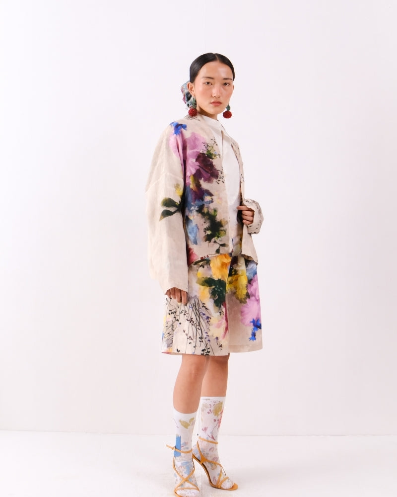 Bouquet story short kimono reversible jacket with in seam pockets in linen.