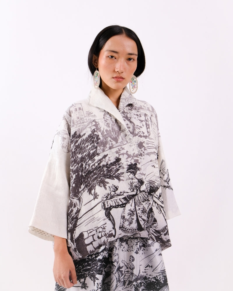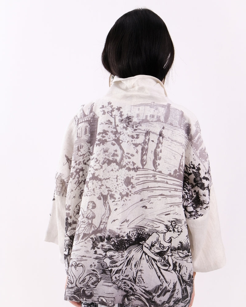 Toile de Jouy open jacket with block printed lining in Linen