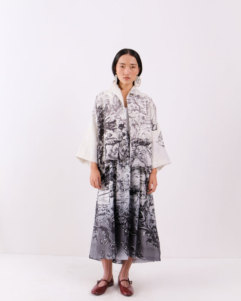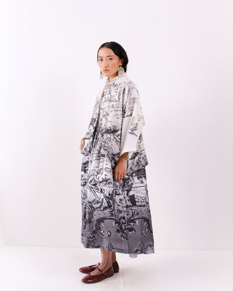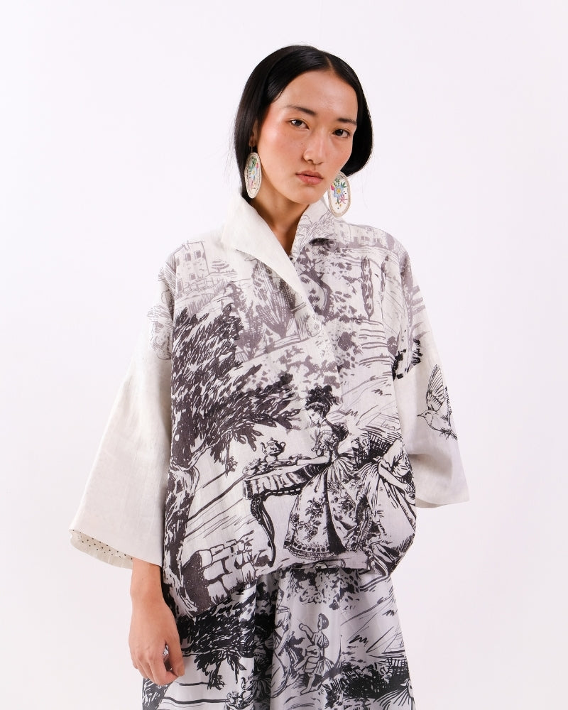 A relaxed open-front jacket crafted from breathable linen, featuring the timeless elegance of a Toile de Jouy print. The contrast block-printed lining adds an artisanal touch and subtle pop of detail. Lightweight and easy to layer, it’s a versatile piece that blends classic charm with everyday sophistication. Jacket is sold as a separate.